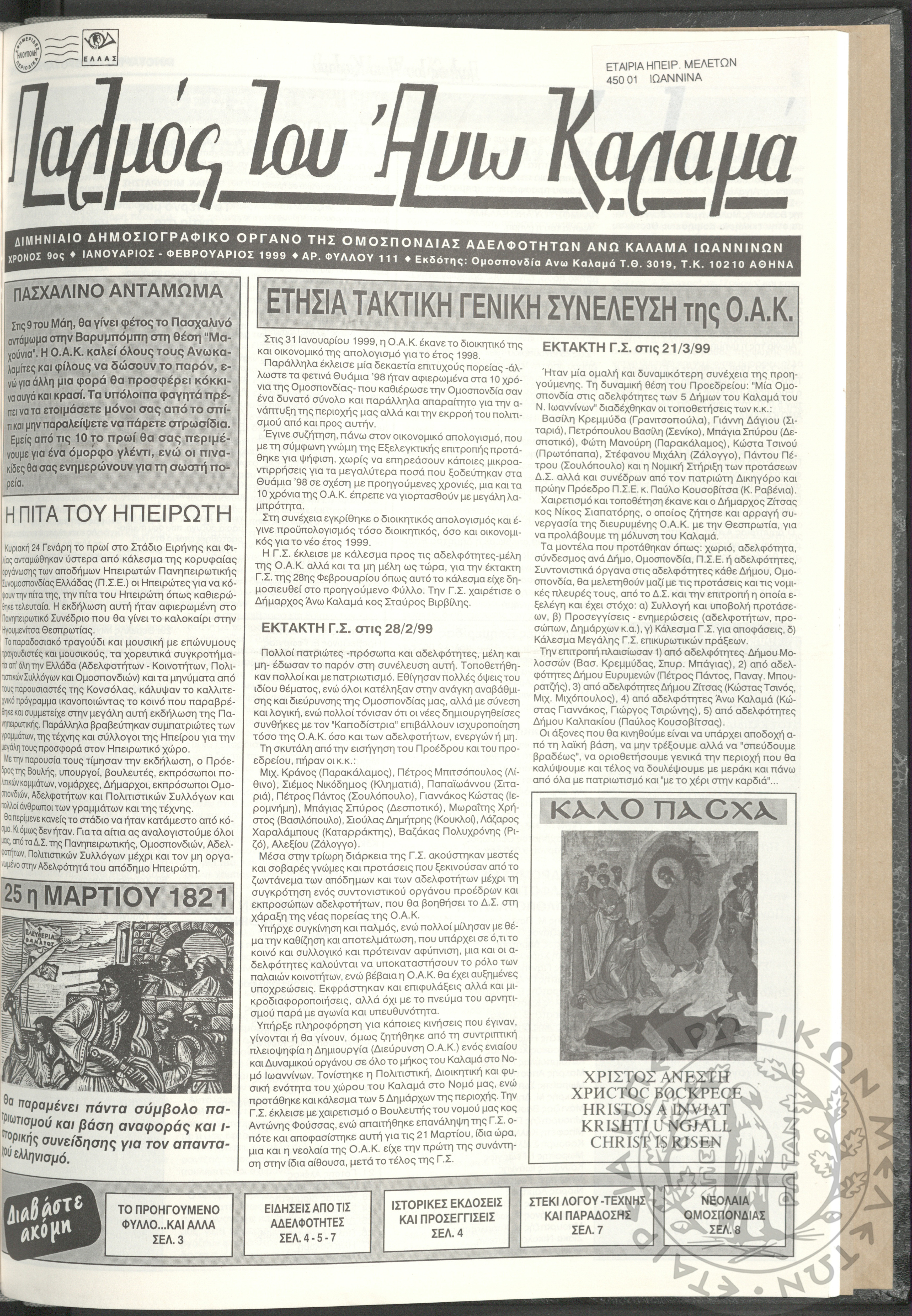 Παλμός του Άνω Καλαμά: διμηνιαίο δημοσιογραφικό όργανο της Ομοσπονδίας Αδελφοτήτων Άνω Καλαμά Ιωαννίνων, 1999, φ. 111Έτος 9ο, αρ. φ. 111...