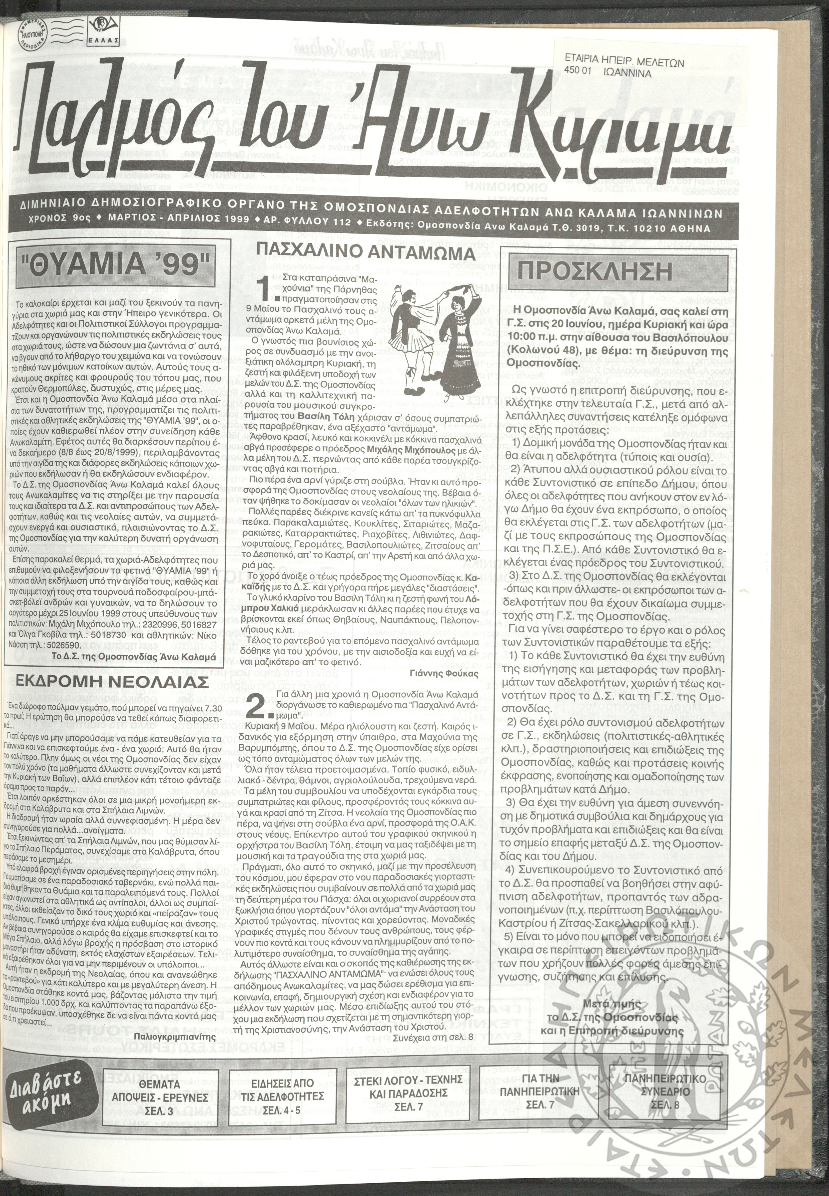 Παλμός του Άνω Καλαμά: διμηνιαίο δημοσιογραφικό όργανο της Ομοσπονδίας Αδελφοτήτων Άνω Καλαμά Ιωαννίνων, 1999, φ. 112Έτος 9ο, αρ. φ. 112...