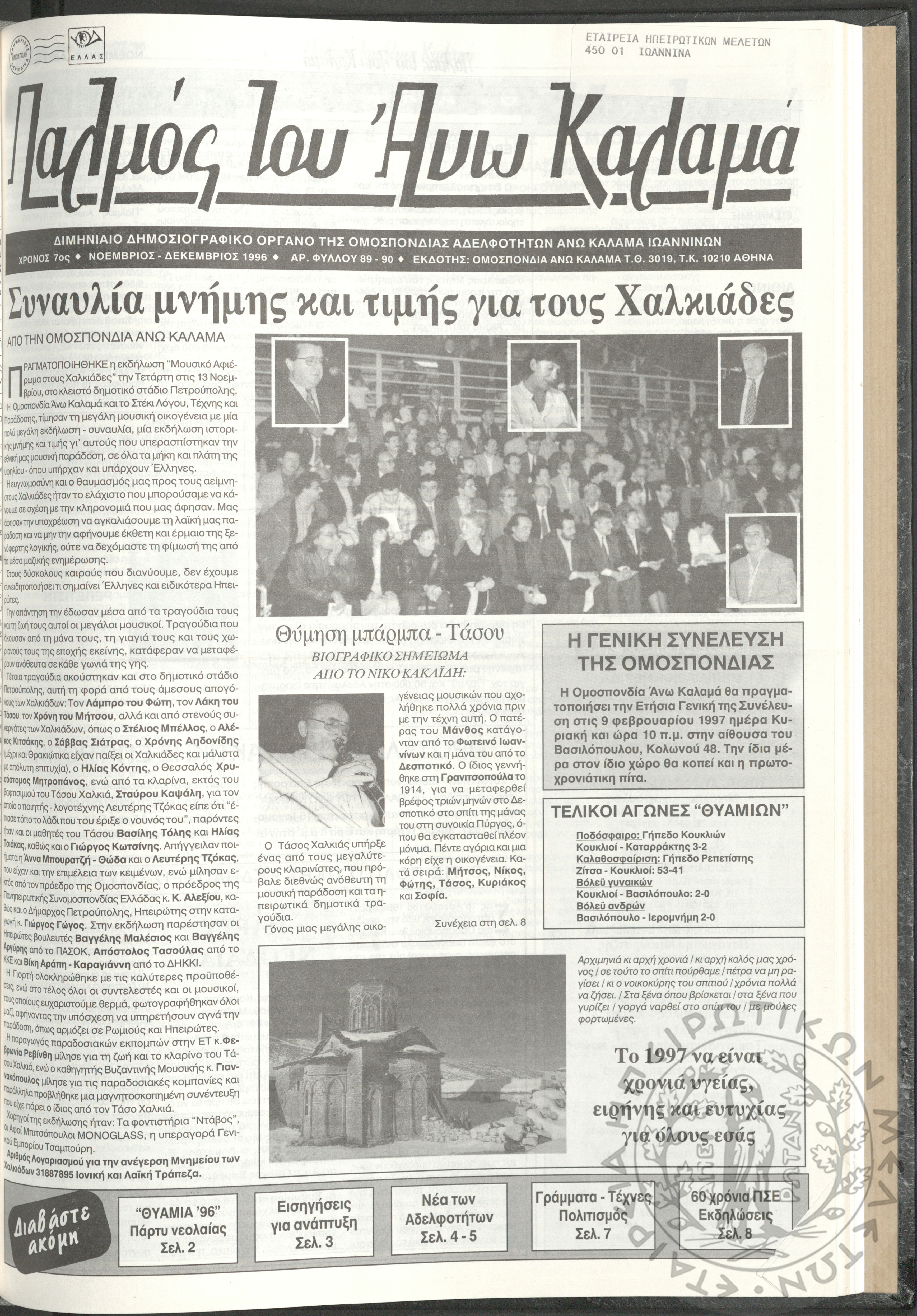 Παλμός του Άνω Καλαμά: διμηνιαίο δημοσιογραφικό όργανο της Ομοσπονδίας Αδελφοτήτων Άνω Καλαμά Ιωαννίνων, 1996, φ. 89-90Έτος 7ο, αρ. φ. 89-90...