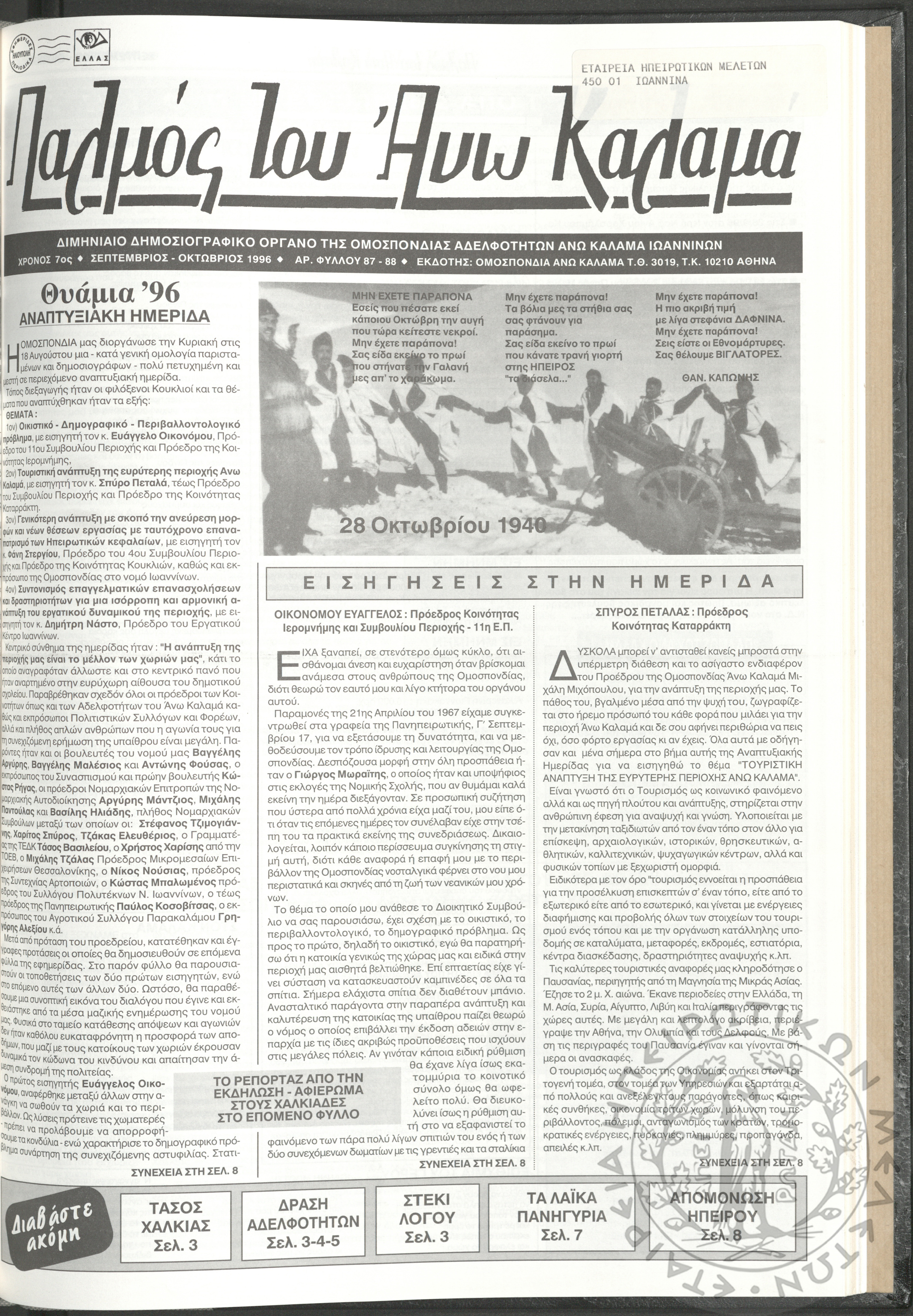 Παλμός του Άνω Καλαμά: διμηνιαίο δημοσιογραφικό όργανο της Ομοσπονδίας Αδελφοτήτων Άνω Καλαμά Ιωαννίνων, 1996, φ. 87-88Έτος 7ο, αρ. φ. 87-88...