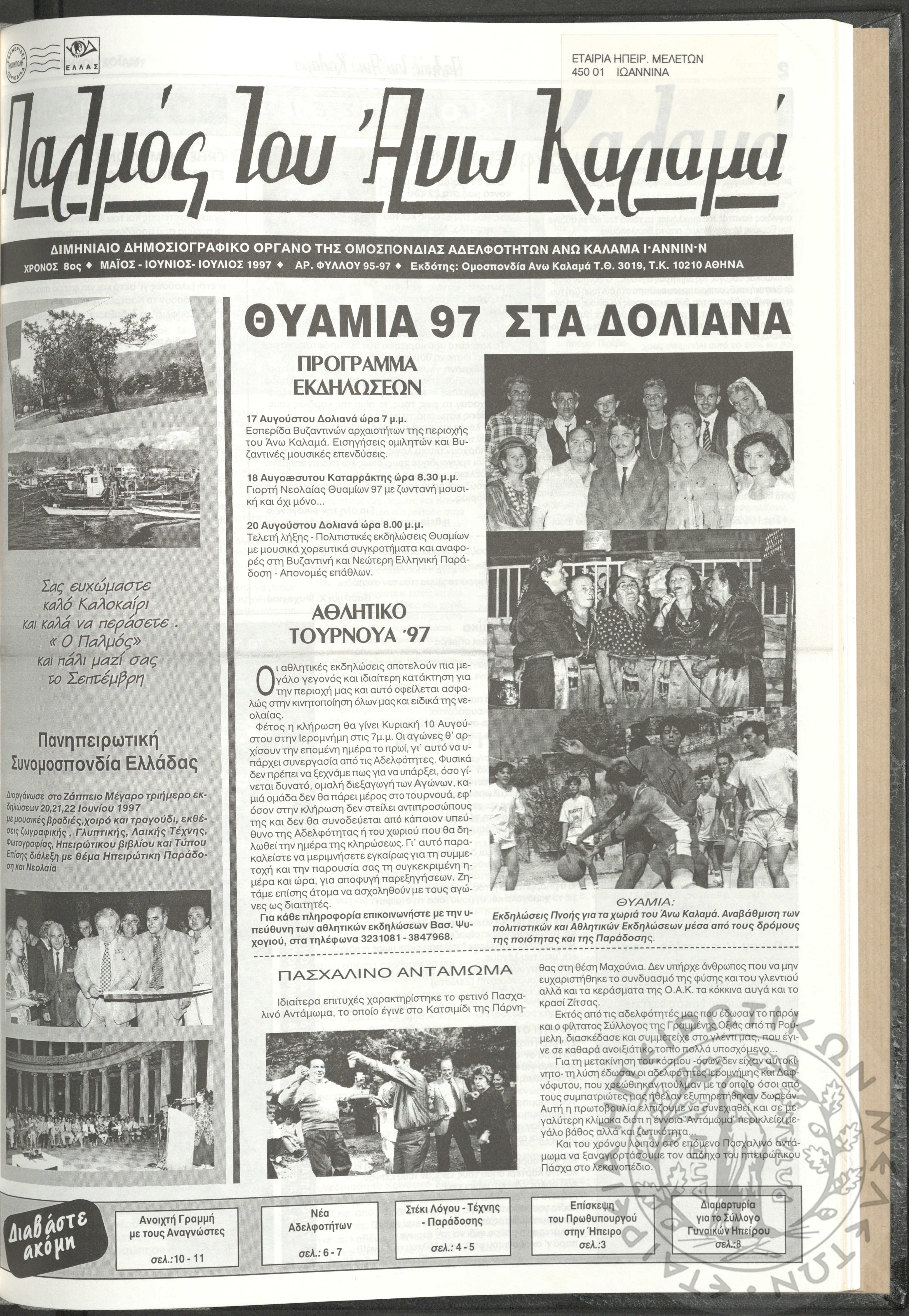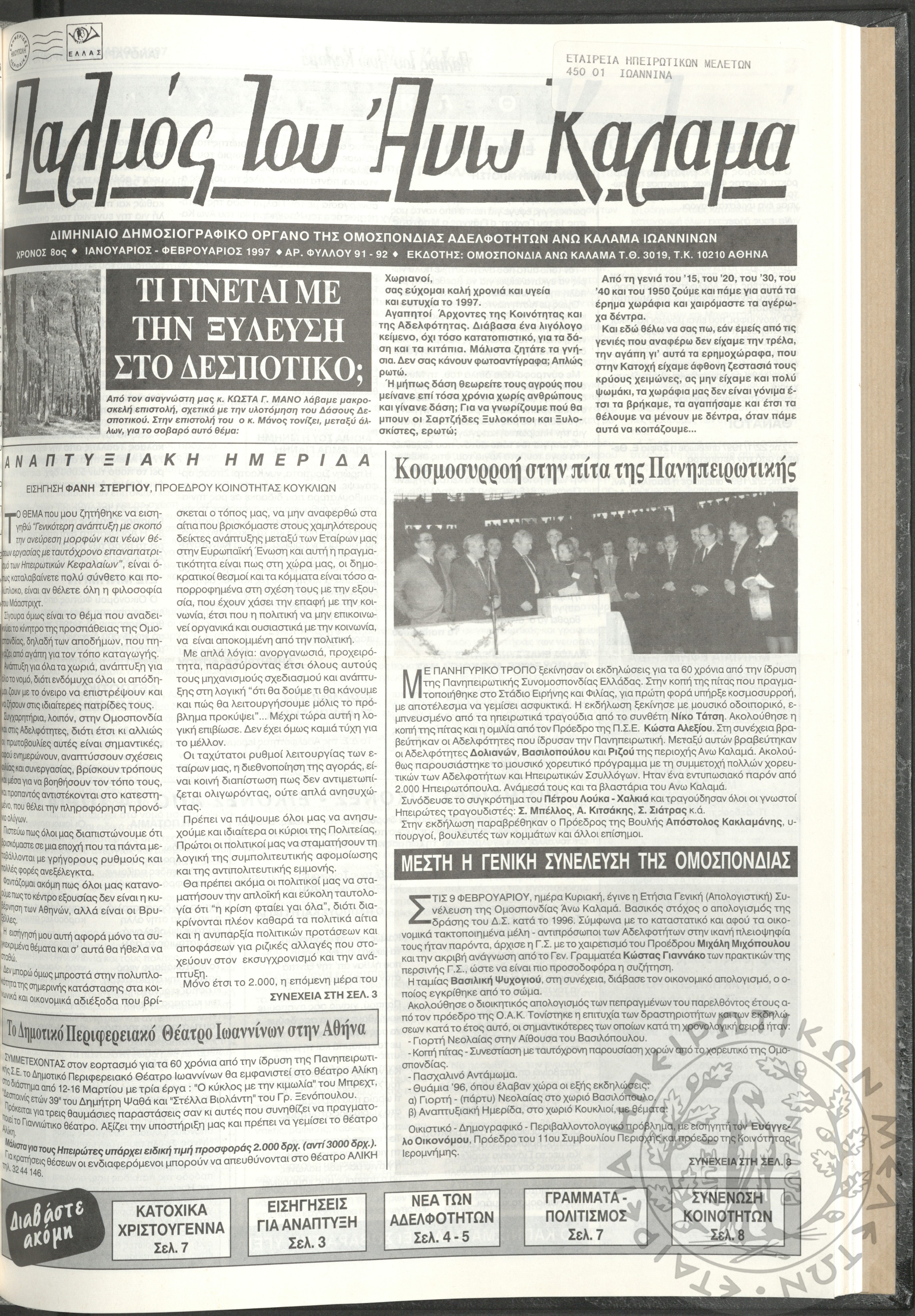 Παλμός του Άνω Καλαμά: διμηνιαίο δημοσιογραφικό όργανο της Ομοσπονδίας Αδελφοτήτων Άνω Καλαμά Ιωαννίνων, 1997, φ. 91-92Έτος 8ο, αρ. φ. 91-92...