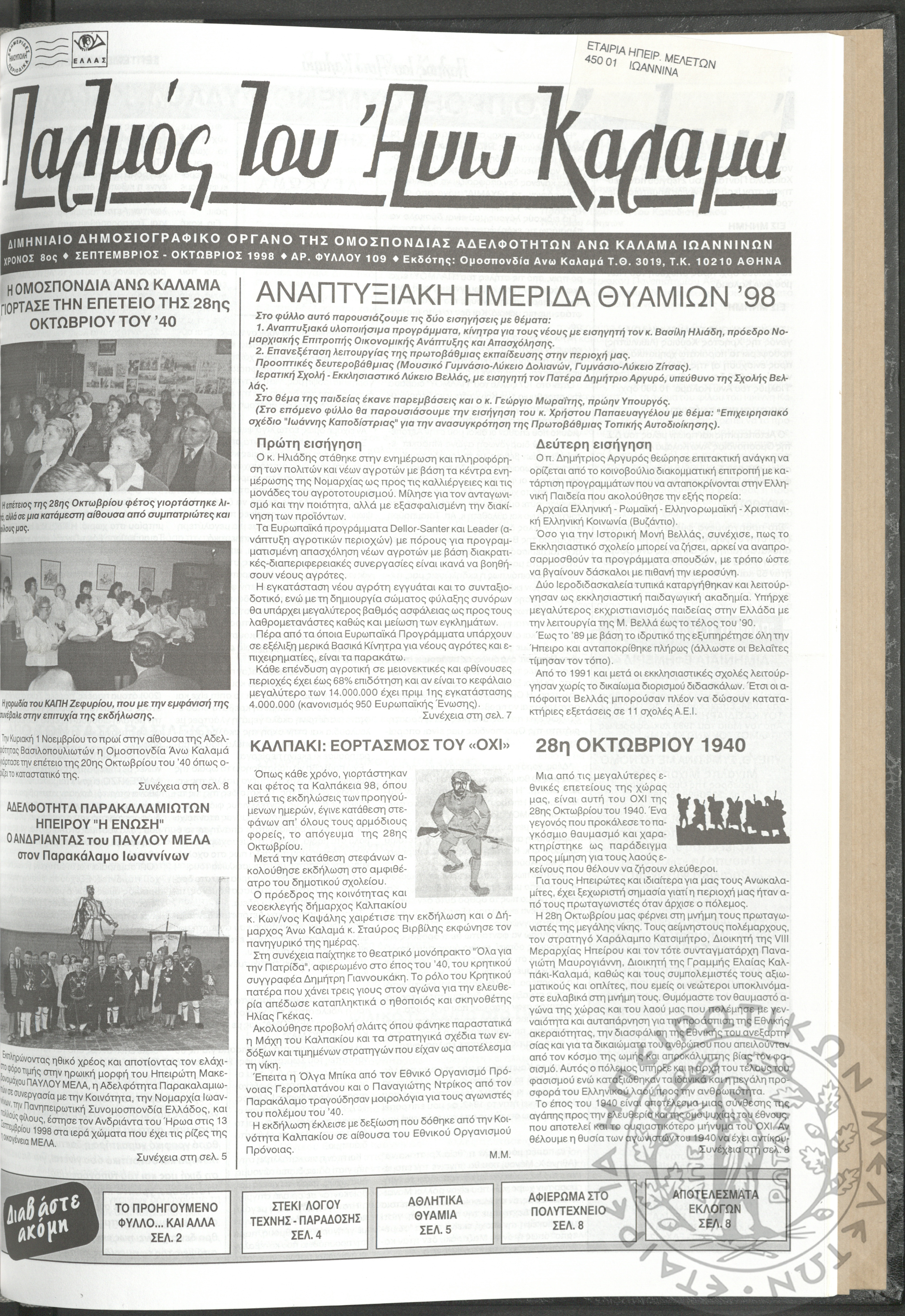 Παλμός του Άνω Καλαμά: διμηνιαίο δημοσιογραφικό όργανο της Ομοσπονδίας Αδελφοτήτων Άνω Καλαμά Ιωαννίνων, 1998, φ. 109Έτος 8ο, αρ. φ. 109...