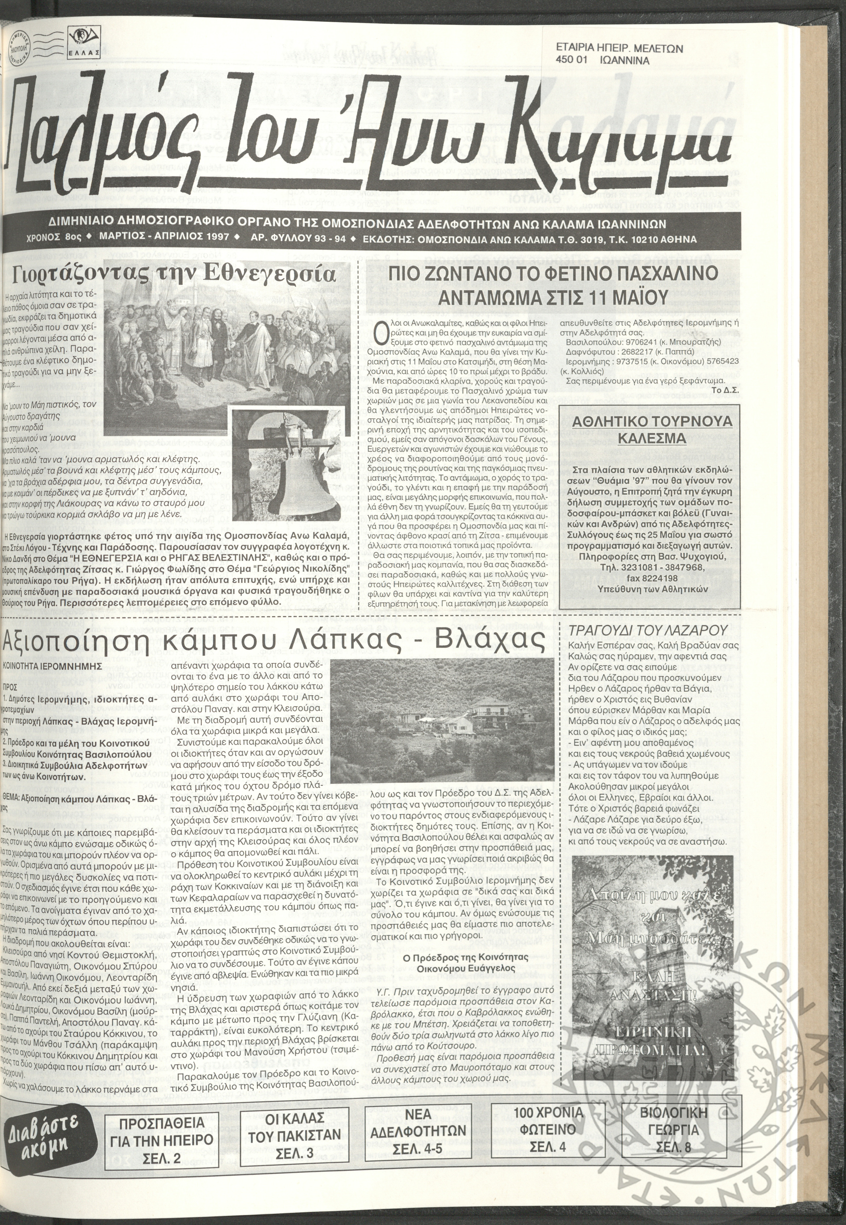 Παλμός του Άνω Καλαμά: διμηνιαίο δημοσιογραφικό όργανο της Ομοσπονδίας Αδελφοτήτων Άνω Καλαμά Ιωαννίνων, 1997, φ. 93-94Έτος 8ο, αρ. φ. 93-94...