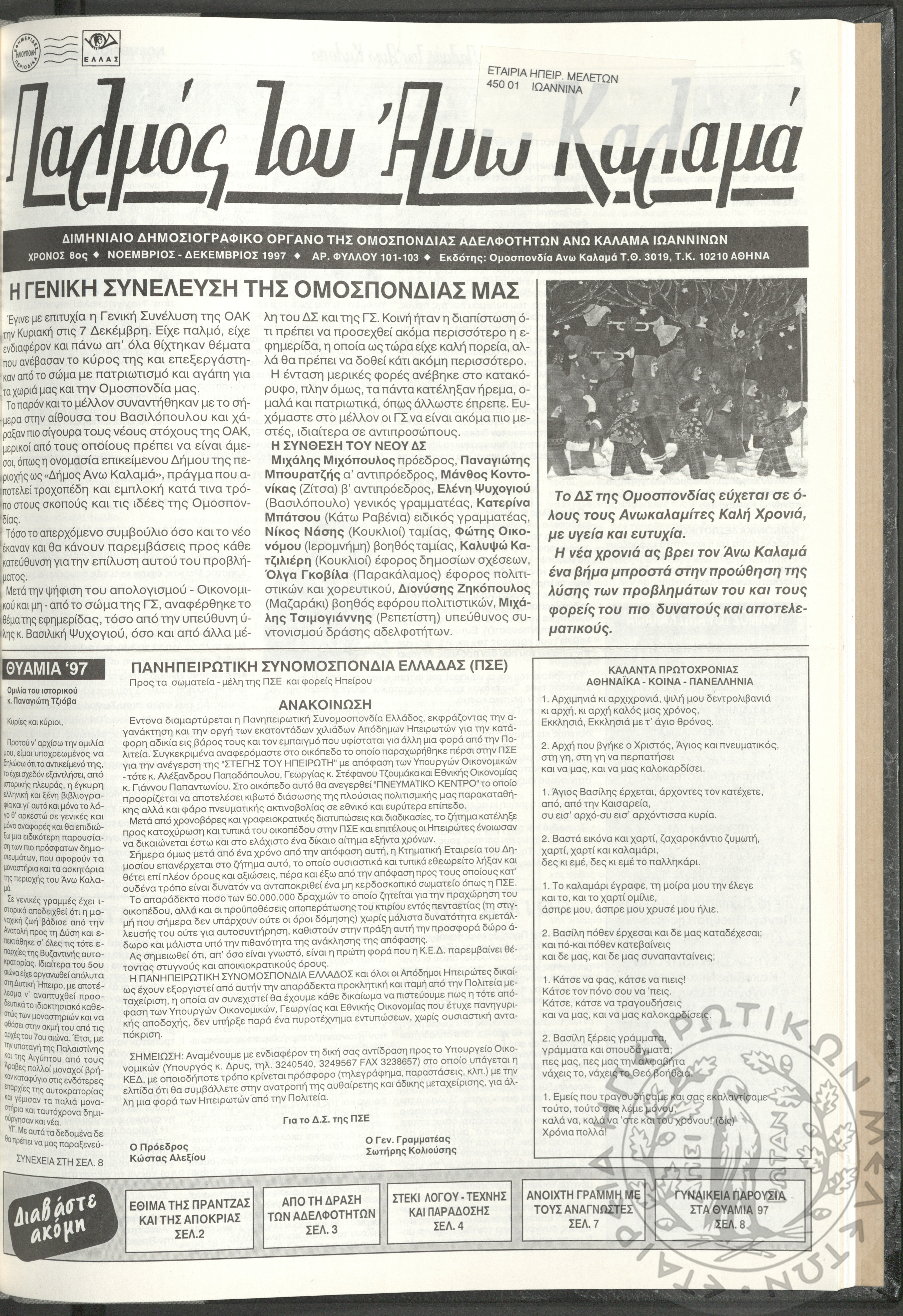 Παλμός του Άνω Καλαμά: διμηνιαίο δημοσιογραφικό όργανο της Ομοσπονδίας Αδελφοτήτων Άνω Καλαμά Ιωαννίνων, 1997, φ. 101-103Έτος 8ο, αρ. φ. 101-103...