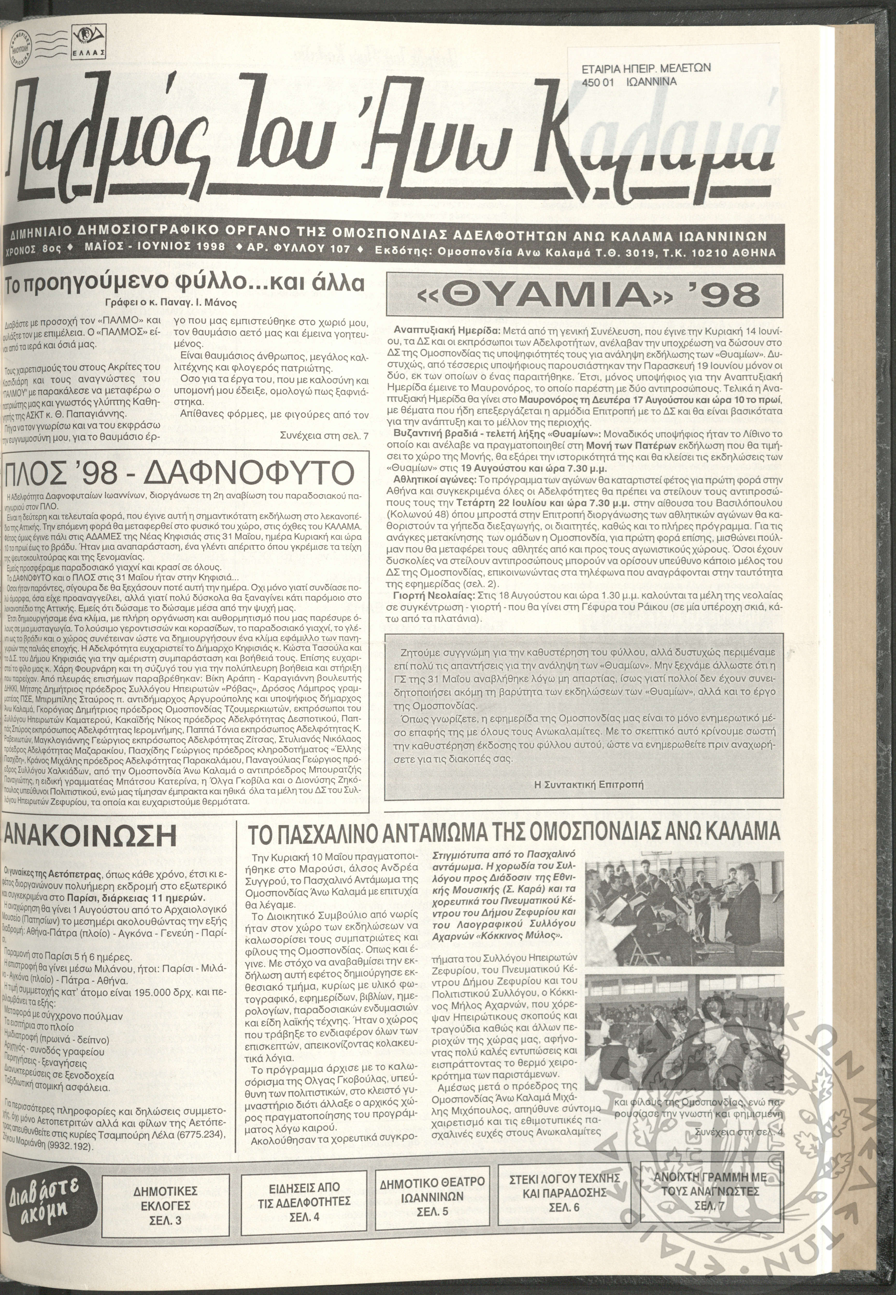 Παλμός του Άνω Καλαμά: διμηνιαίο δημοσιογραφικό όργανο της Ομοσπονδίας Αδελφοτήτων Άνω Καλαμά Ιωαννίνων, 1998, φ. 107Έτος 8ο, αρ. φ. 107...