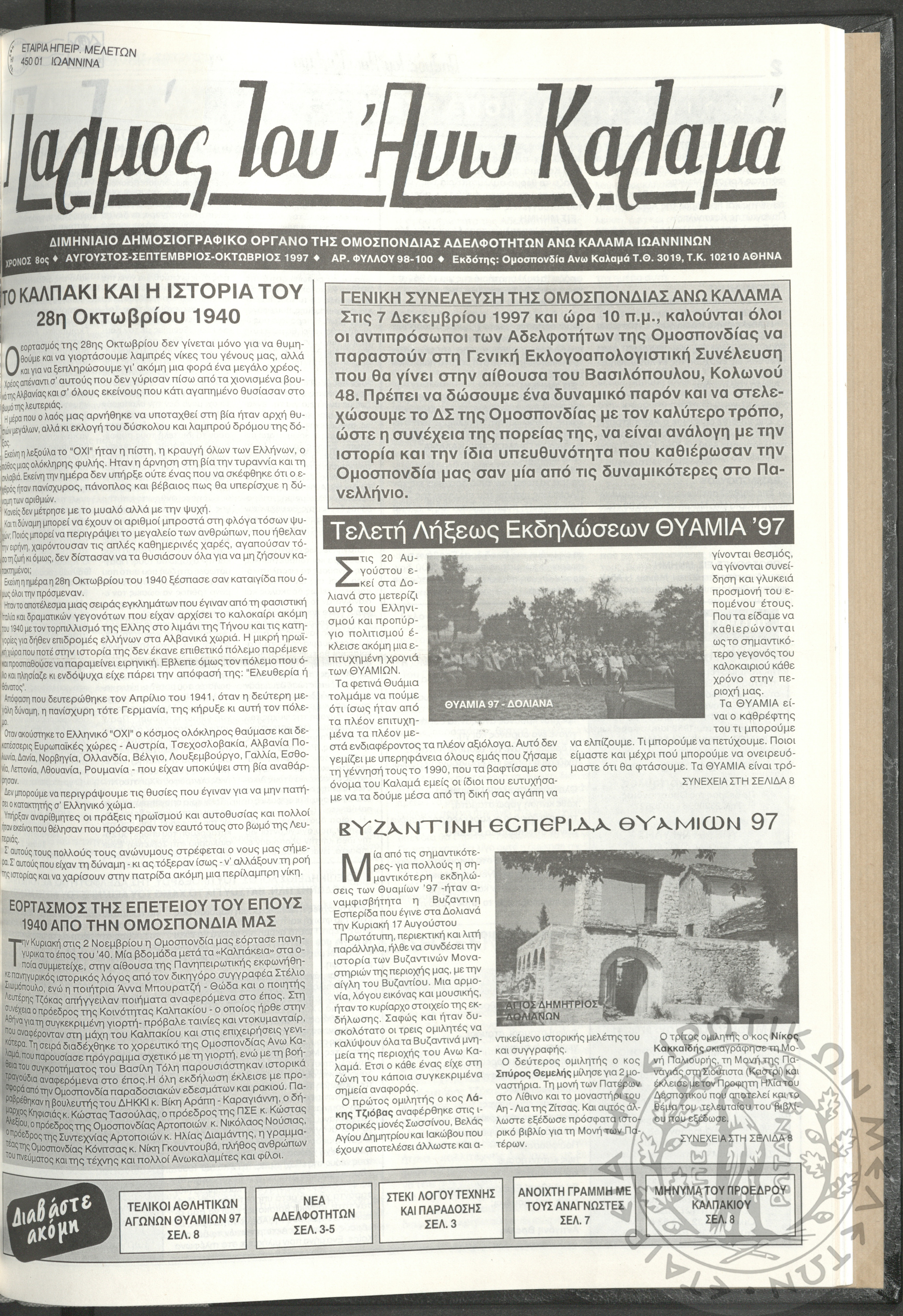 Παλμός του Άνω Καλαμά: διμηνιαίο δημοσιογραφικό όργανο της Ομοσπονδίας Αδελφοτήτων Άνω Καλαμά Ιωαννίνων, 1997, φ. 98-100Έτος 8ο, αρ. φ. 98-100...