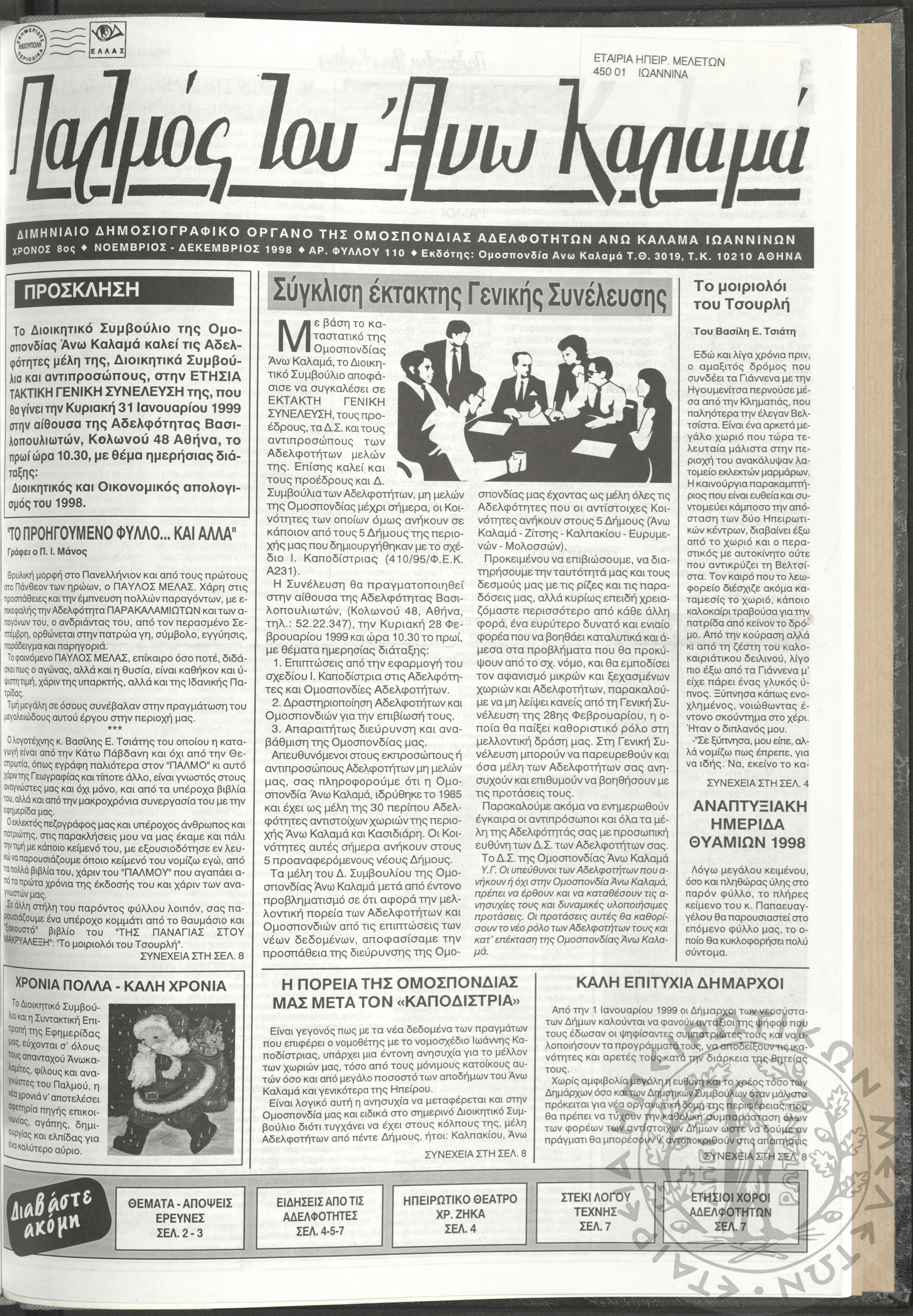 Παλμός του Άνω Καλαμά: διμηνιαίο δημοσιογραφικό όργανο της Ομοσπονδίας Αδελφοτήτων Άνω Καλαμά Ιωαννίνων, 1998, φ. 110Έτος 8ο, αρ. φ. 110...