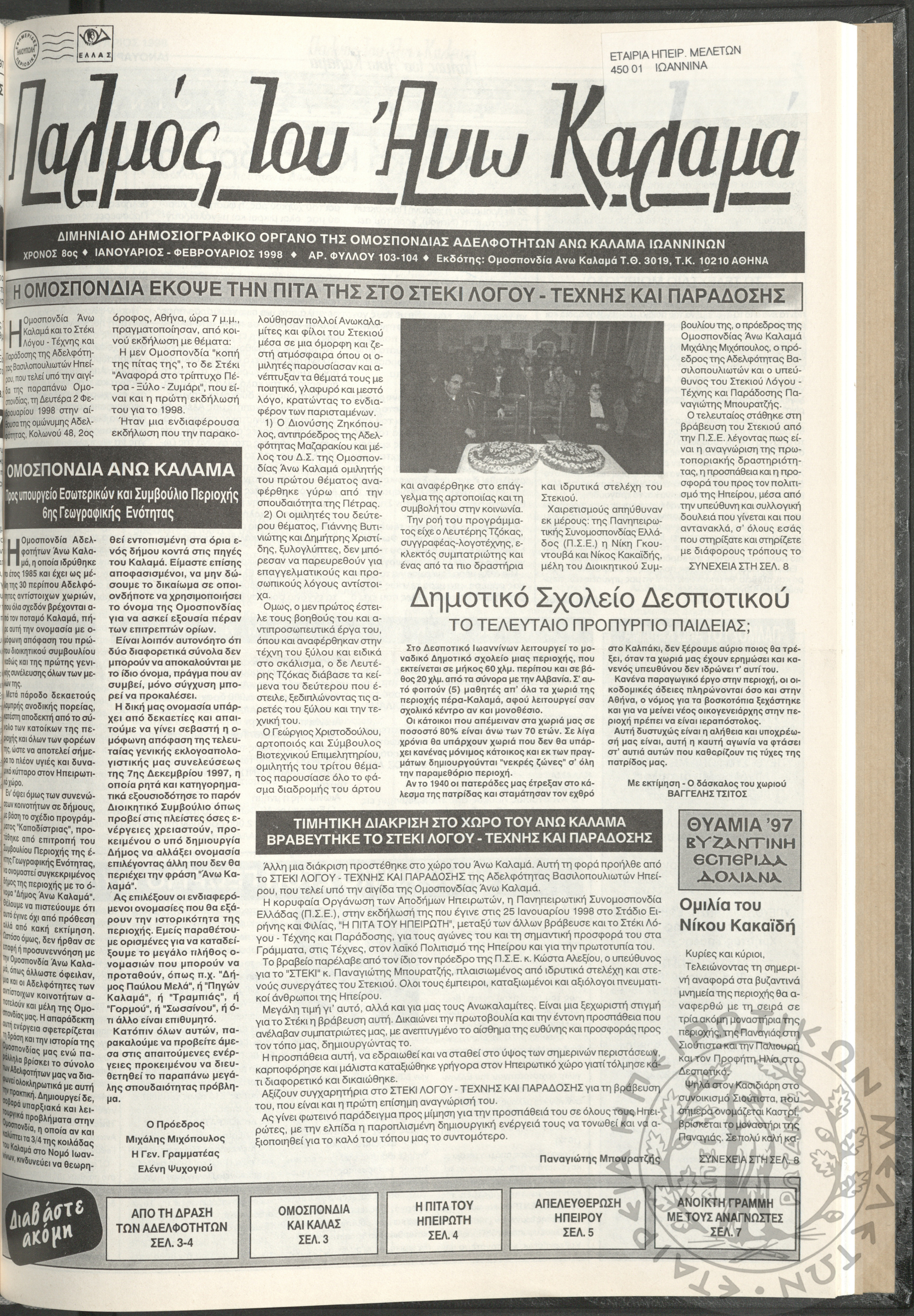 Παλμός του Άνω Καλαμά: διμηνιαίο δημοσιογραφικό όργανο της Ομοσπονδίας Αδελφοτήτων Άνω Καλαμά Ιωαννίνων, 1998, φ. 103-104Έτος 8ο, αρ. φ. 103-104...