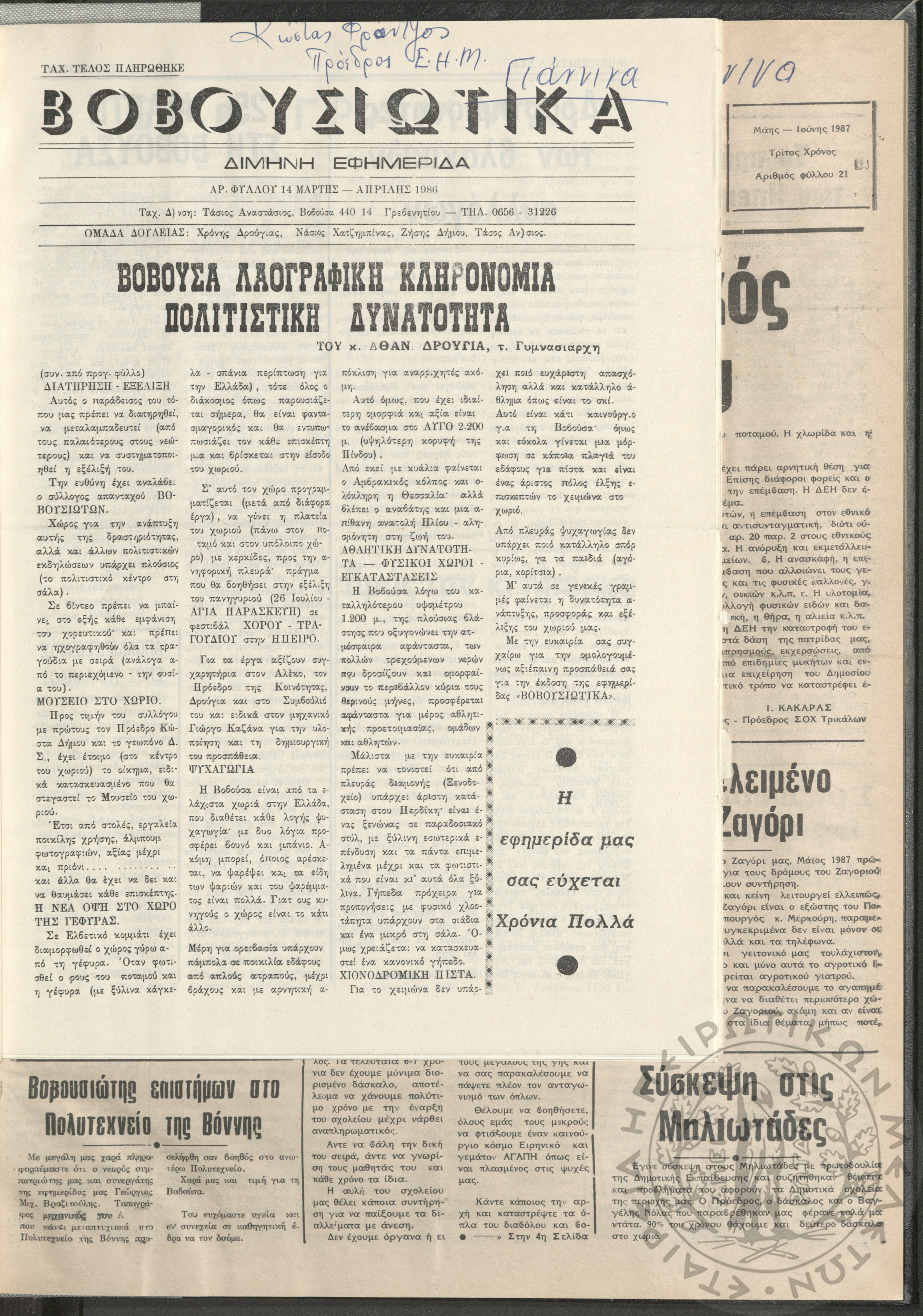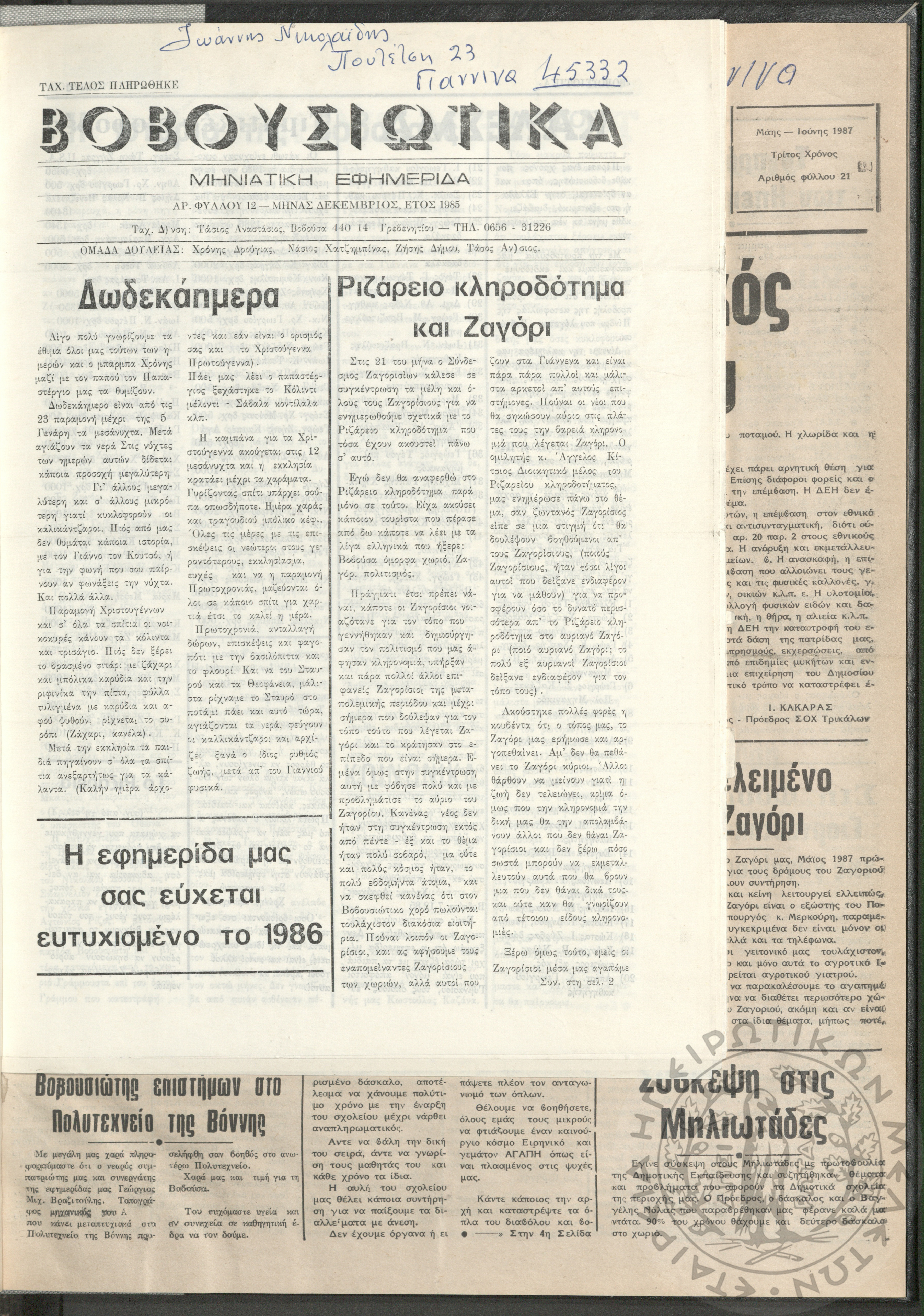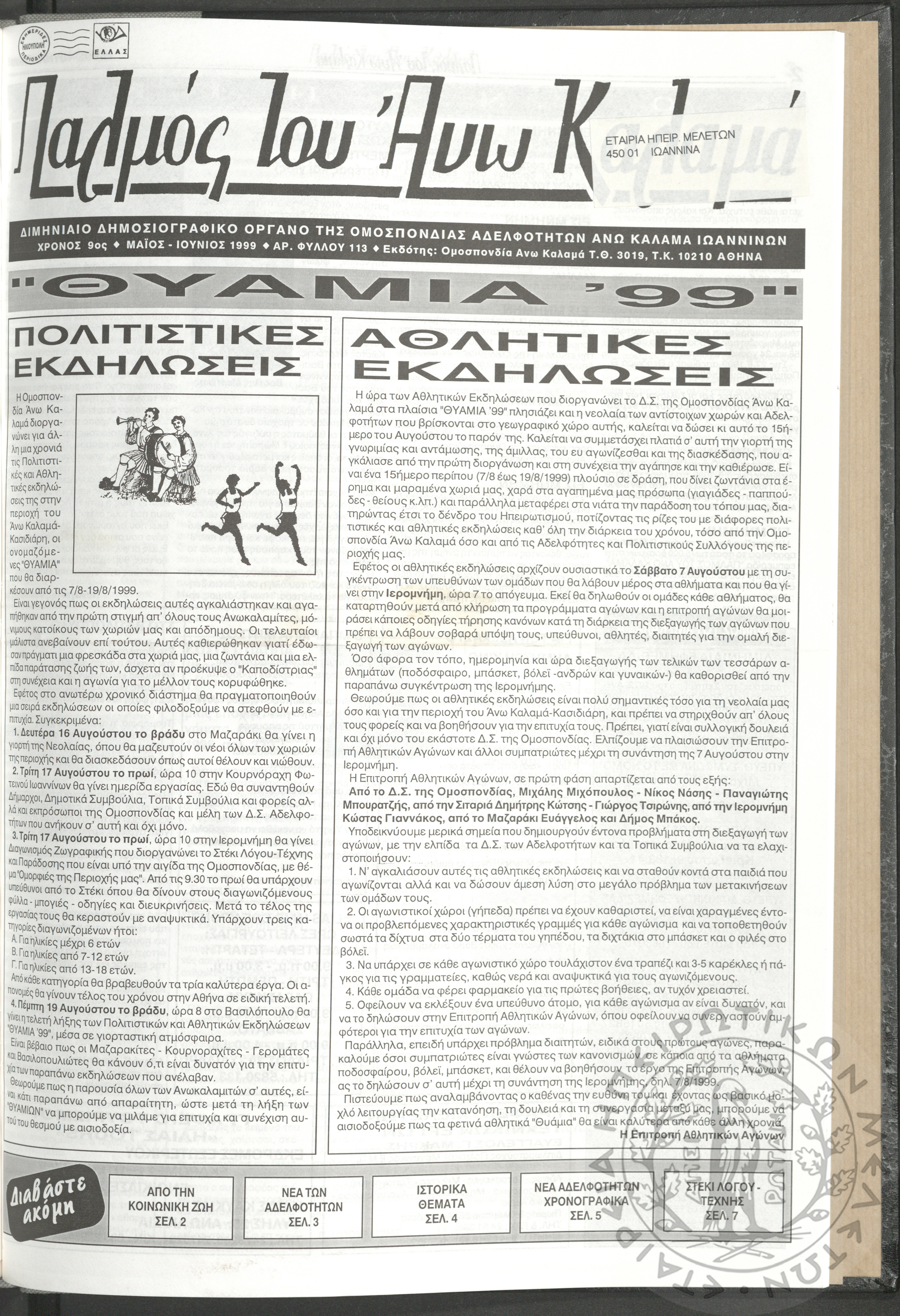 Παλμός του Άνω Καλαμά: διμηνιαίο δημοσιογραφικό όργανο της Ομοσπονδίας Αδελφοτήτων Άνω Καλαμά Ιωαννίνων, 1999, φ. 113Έτος 9ο, αρ. φ. 113...