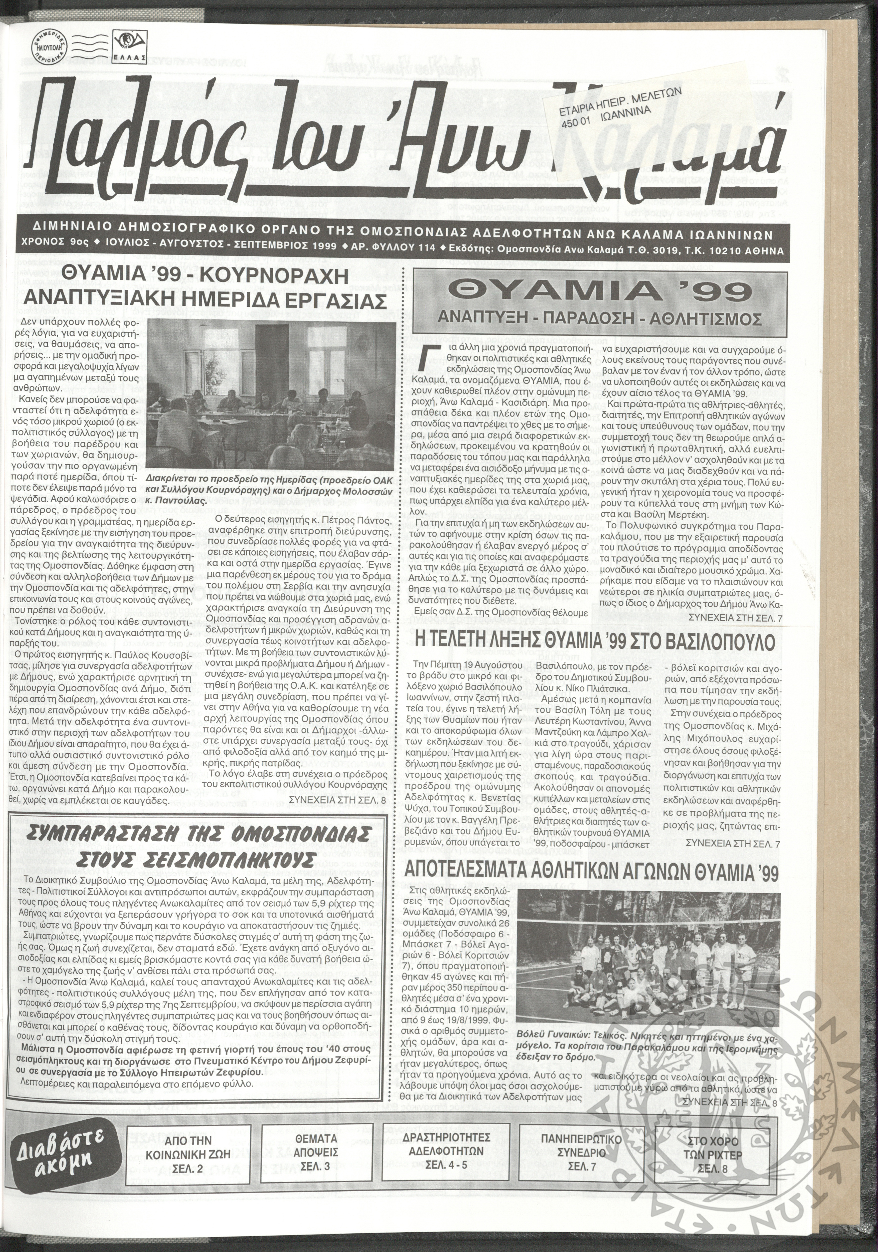 Παλμός του Άνω Καλαμά: διμηνιαίο δημοσιογραφικό όργανο της Ομοσπονδίας Αδελφοτήτων Άνω Καλαμά Ιωαννίνων, 1999, φ. 114Έτος 9ο, αρ. φ. 114...