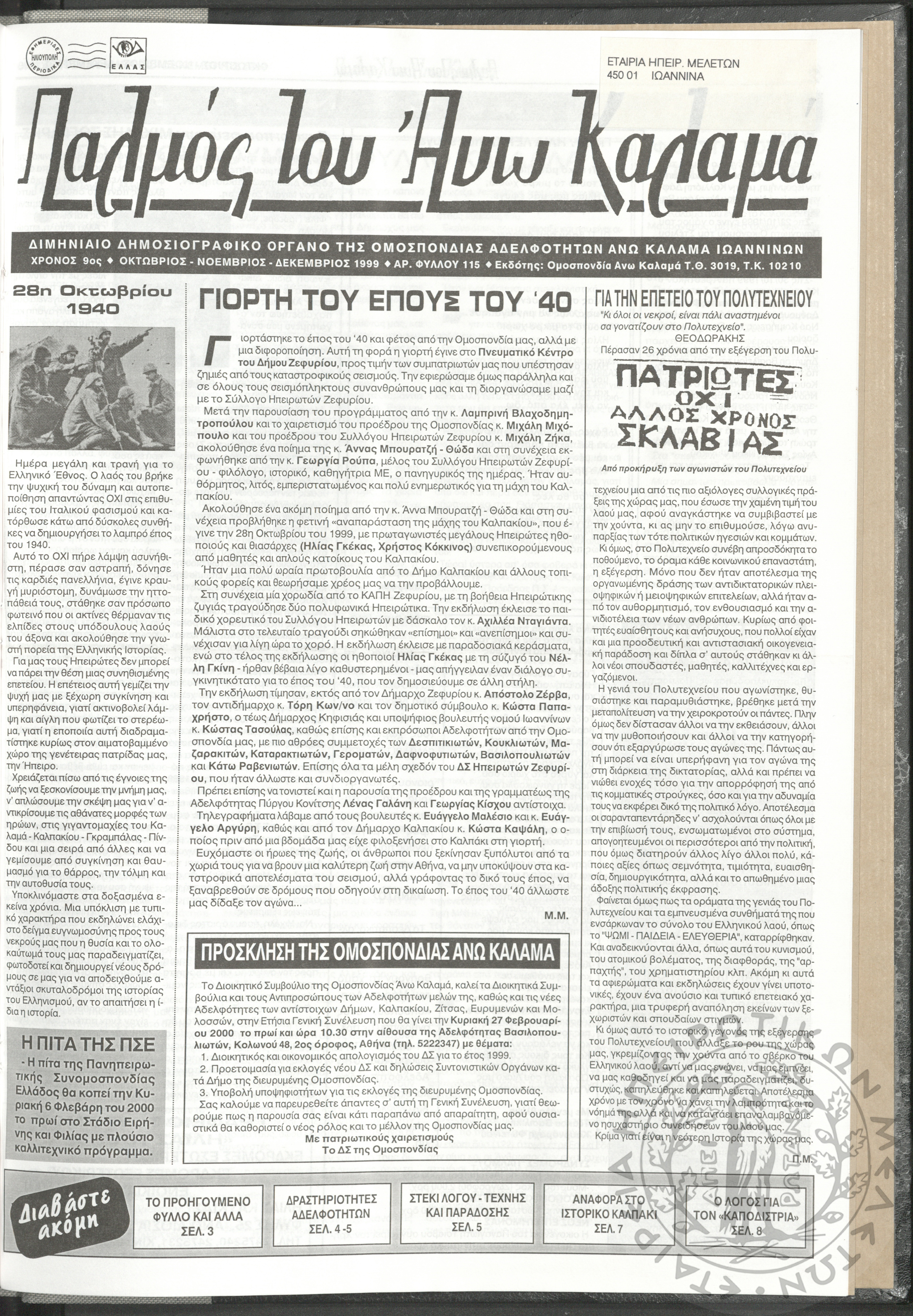 Παλμός του Άνω Καλαμά: διμηνιαίο δημοσιογραφικό όργανο της Ομοσπονδίας Αδελφοτήτων Άνω Καλαμά Ιωαννίνων, 1999, φ. 115Έτος 9ο, αρ. φ. 115...