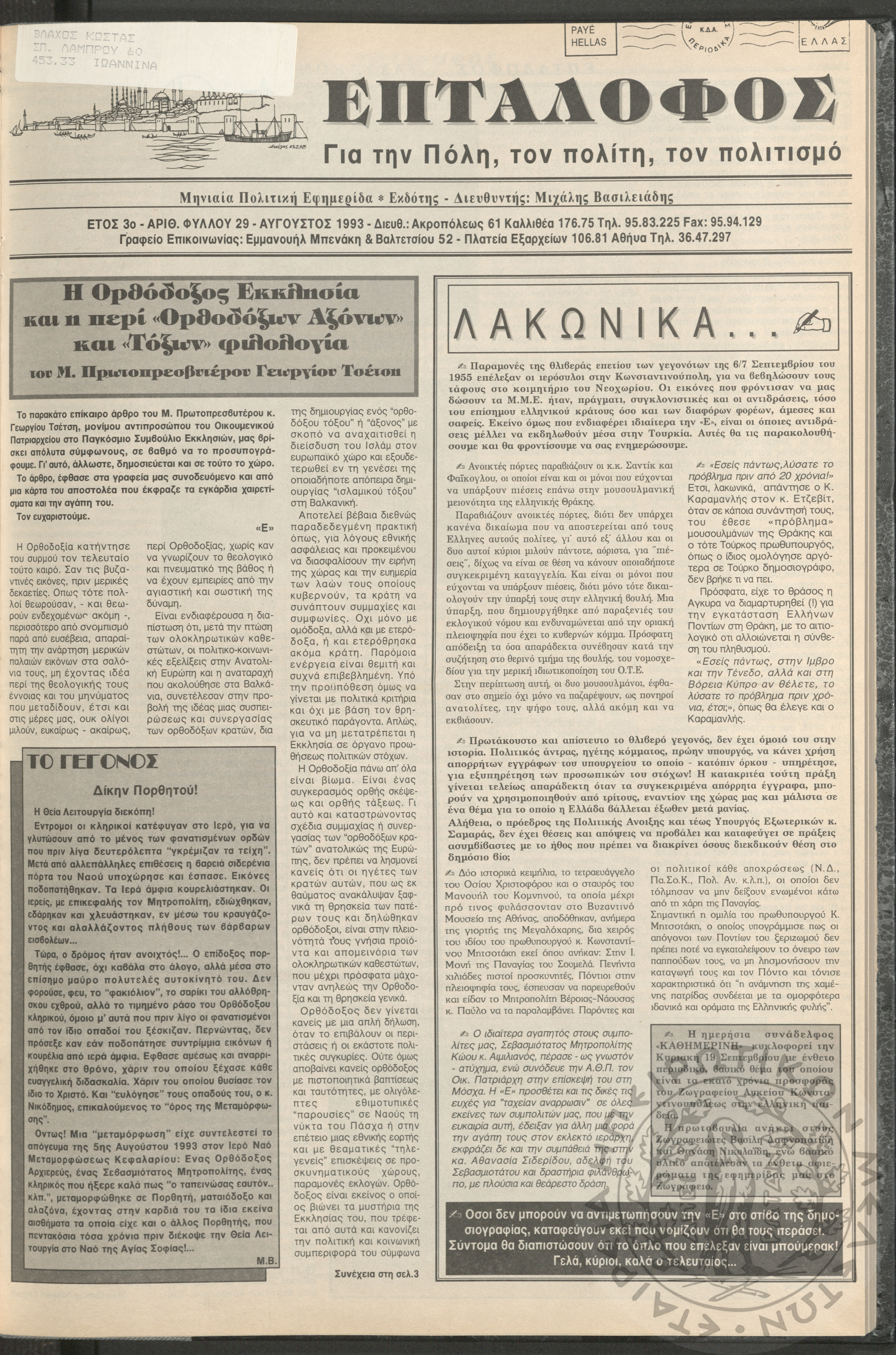 Επτάλοφος: για την Πόλη, τον πολίτη, τον πολιτισμό: μηνιαία πολιτική εφημερίδα, 1993, φ. 29Έτος 3ο, αρ. φ. 29...