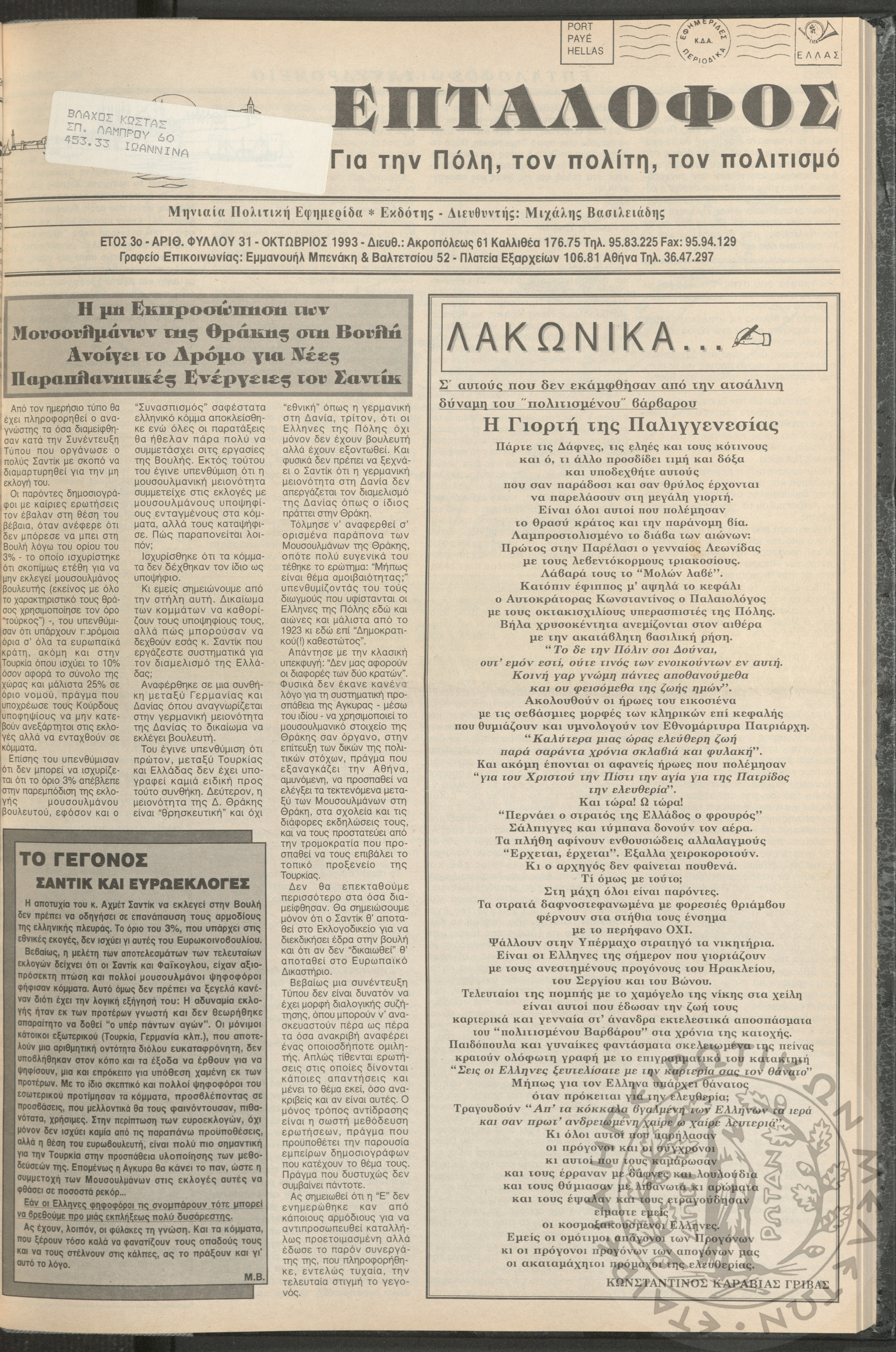 Επτάλοφος: για την Πόλη, τον πολίτη, τον πολιτισμό: μηνιαία πολιτική εφημερίδα, 1993, φ. 31Έτος 3ο, αρ. φ. 31...