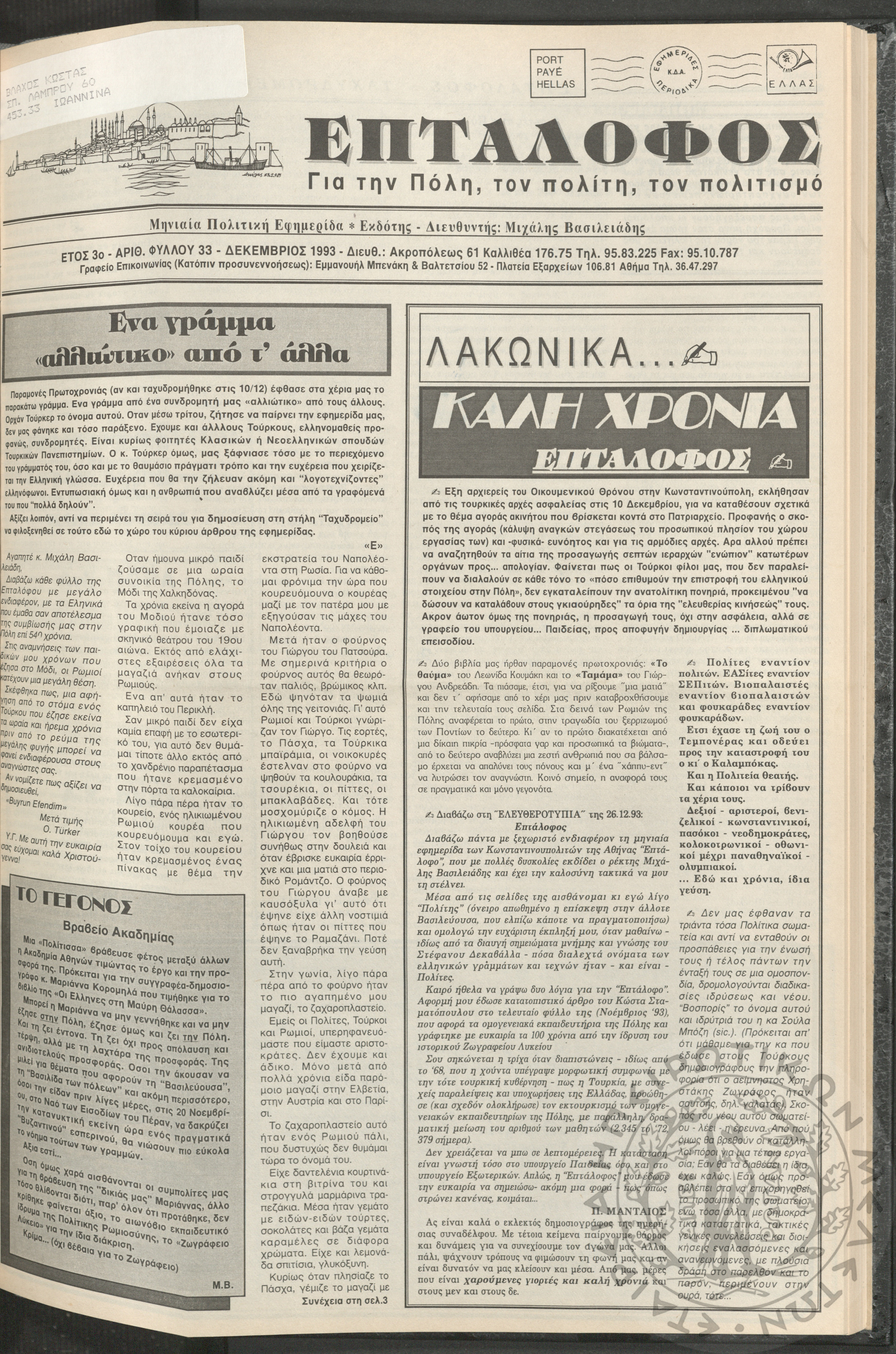 Επτάλοφος: για την Πόλη, τον πολίτη, τον πολιτισμό: μηνιαία πολιτική εφημερίδα, 1993, φ. 33Έτος 3ο, αρ. φ. 33...