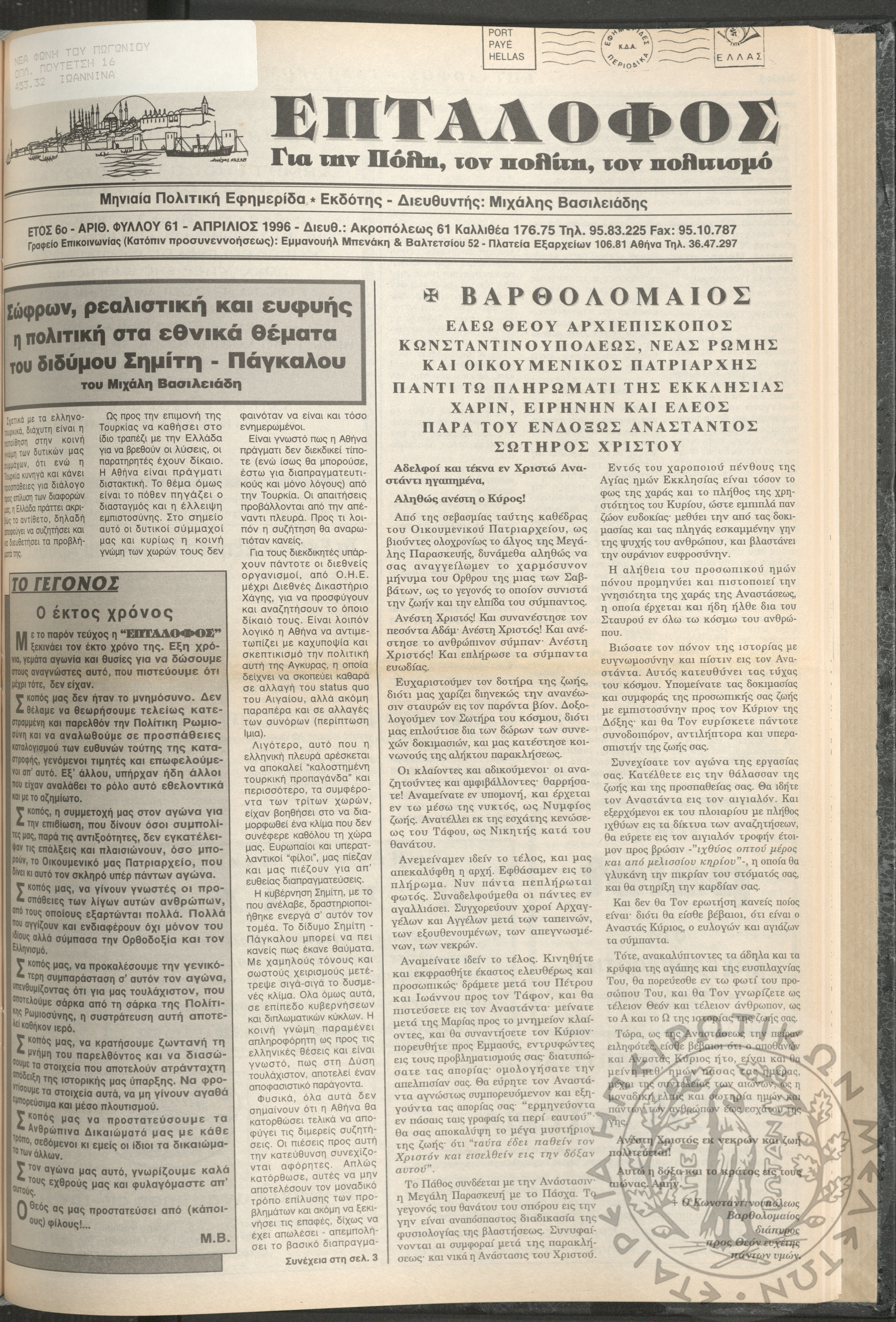 Επτάλοφος: για την Πόλη, τον πολίτη, τον πολιτισμό: μηνιαία πολιτική εφημερίδα, 1996, φ. 61Έτος 6ο, αρ. φ. 61...