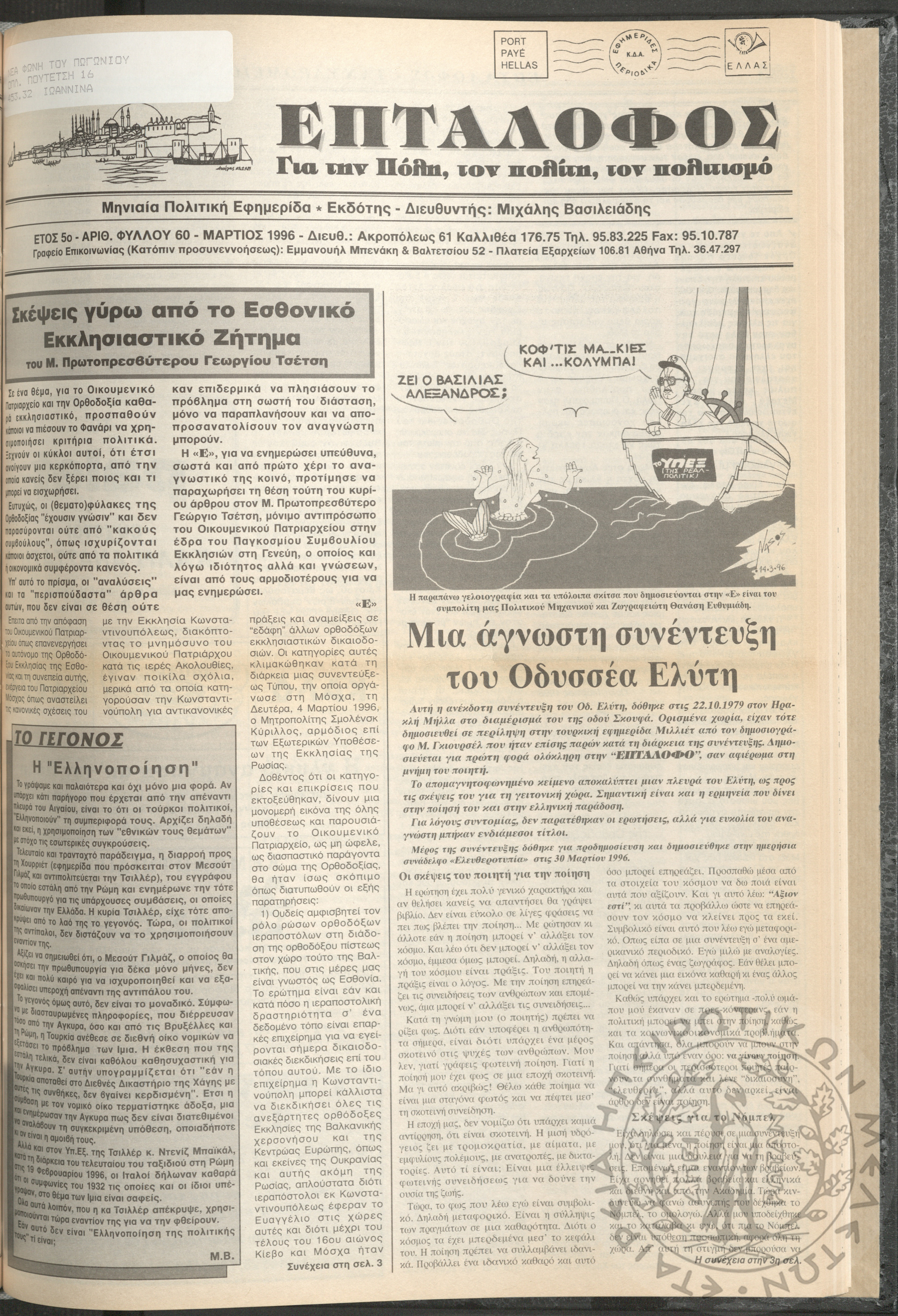 Επτάλοφος: για την Πόλη, τον πολίτη, τον πολιτισμό: μηνιαία πολιτική εφημερίδα, 1996, φ. 60Έτος 6ο, αρ. φ. 60...