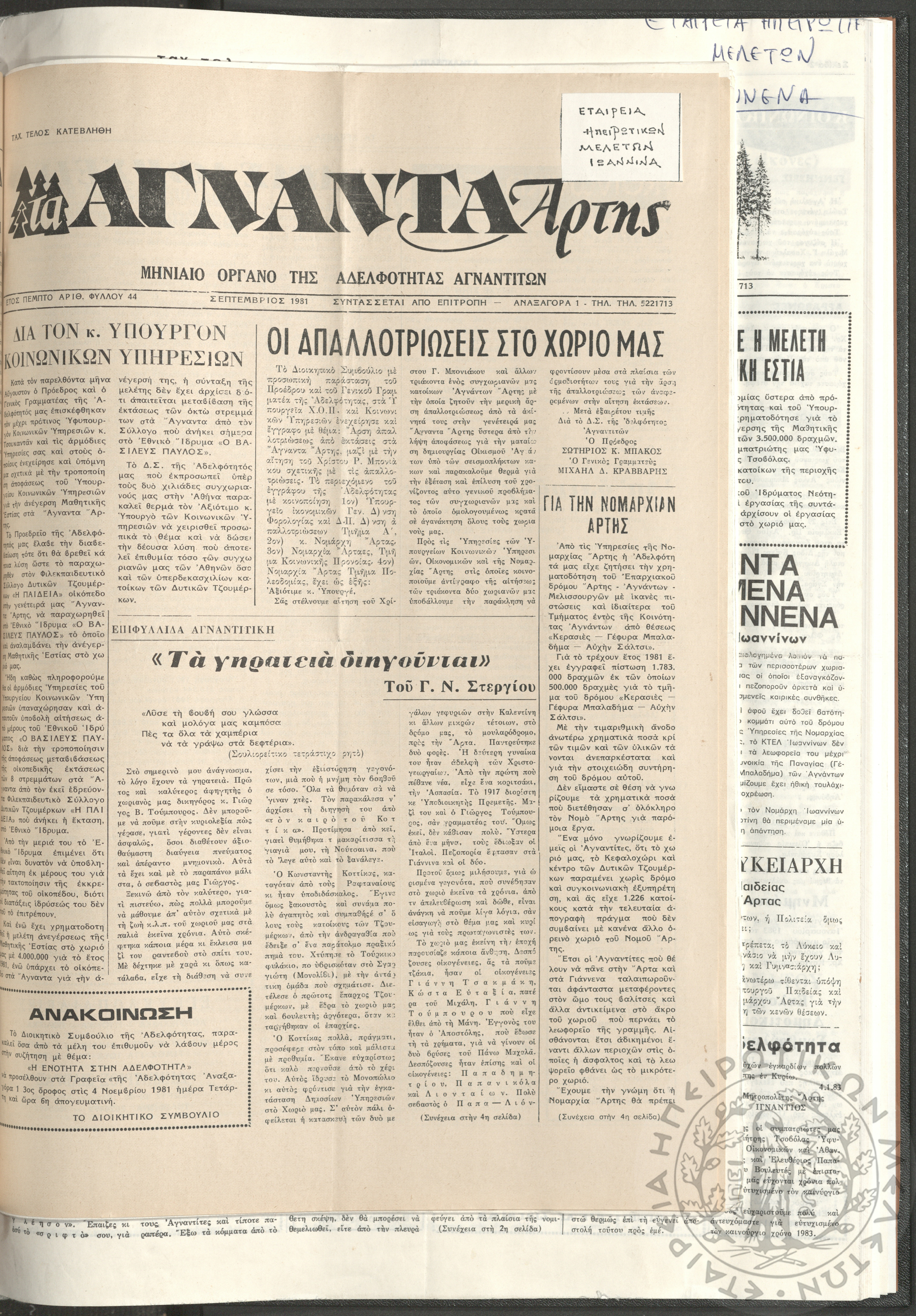 Τα Άγναντα Άρτης: μηνιαίο όργανο της Αδελφότητας Αγναντιτών, 1981, φ. 44