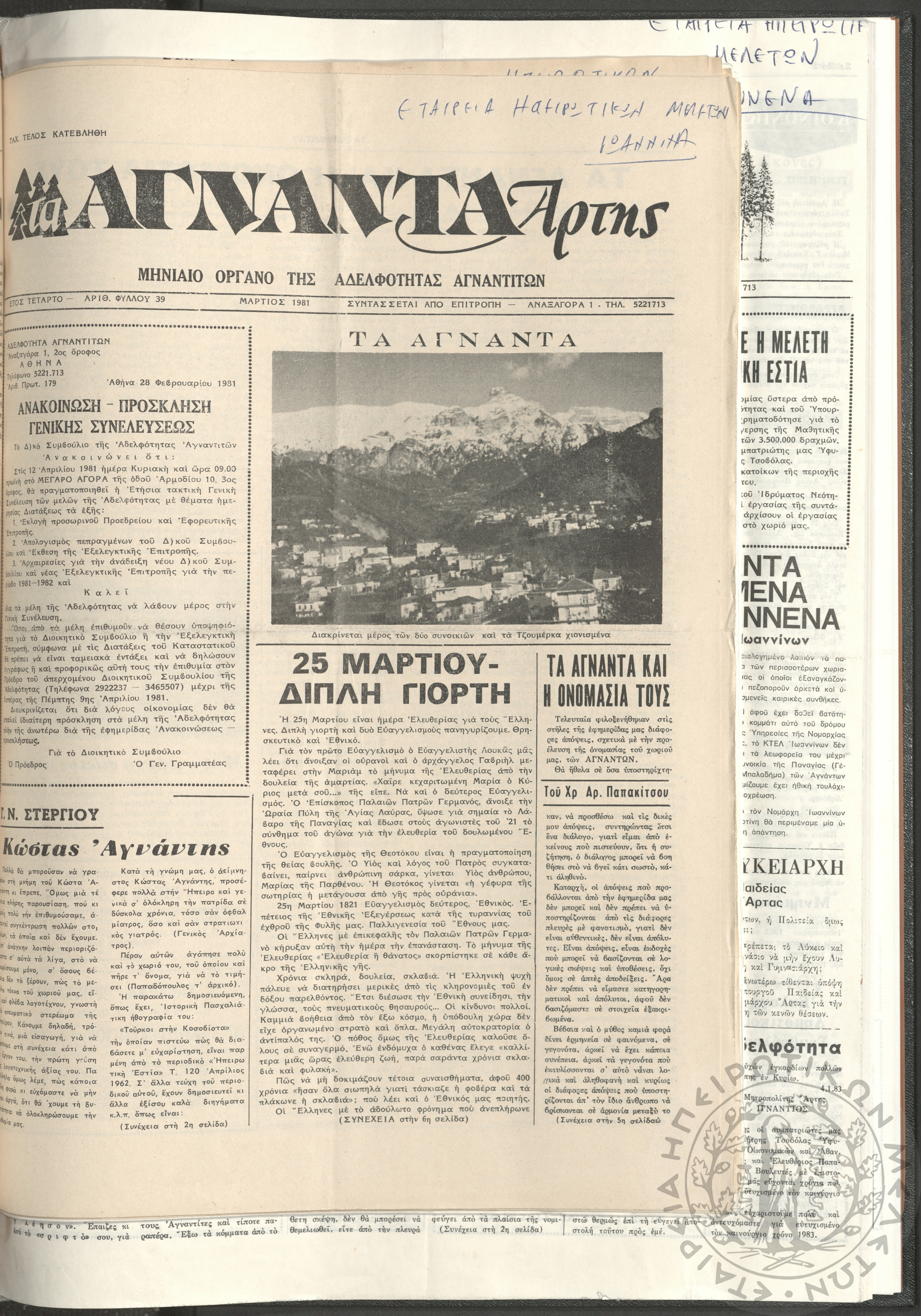 Τα Άγναντα Άρτης: μηνιαίο όργανο της Αδελφότητας Αγναντιτών, 1981, φ. 39