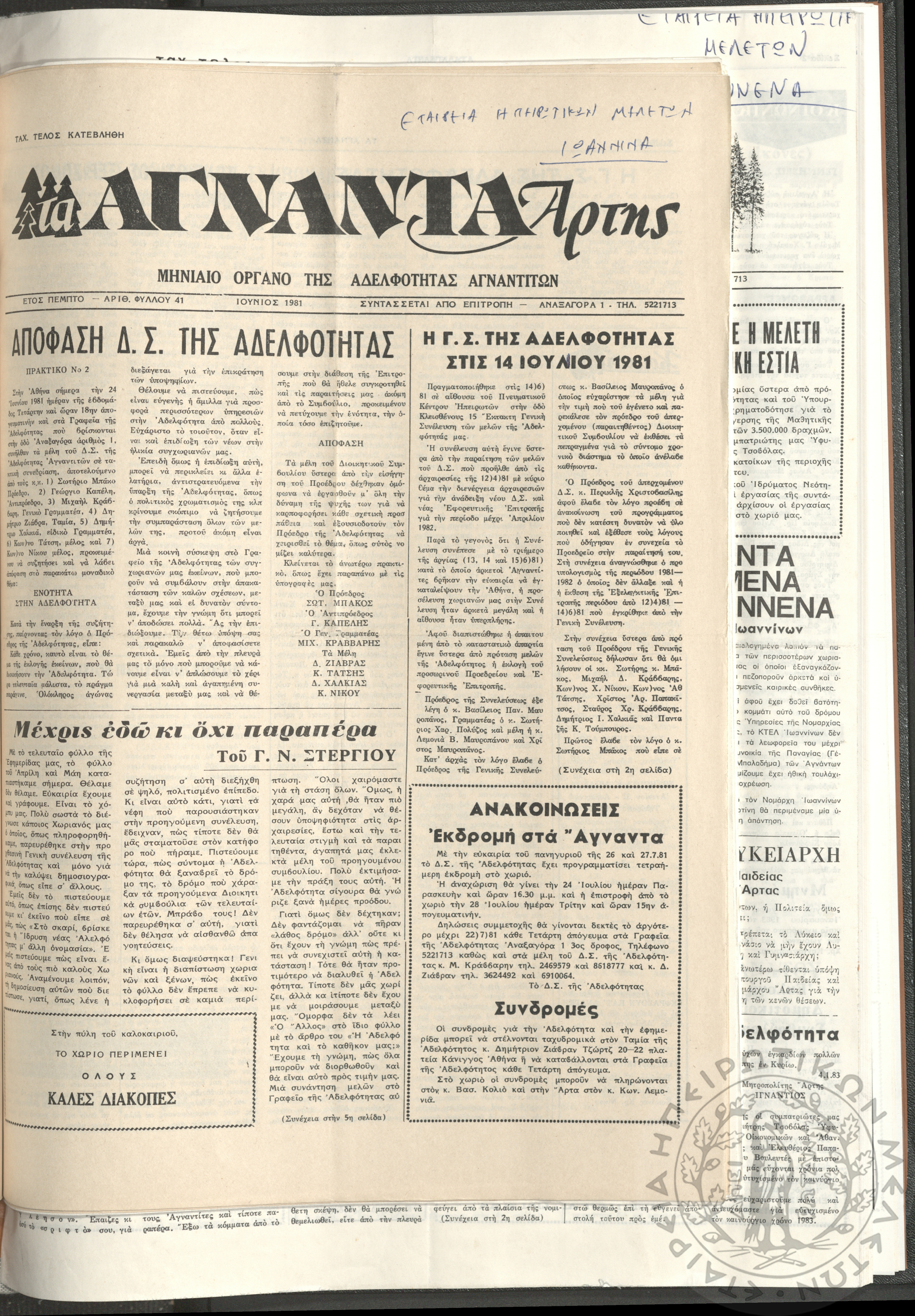 Τα Άγναντα Άρτης: μηνιαίο όργανο της Αδελφότητας Αγναντιτών, 1981, φ. 41