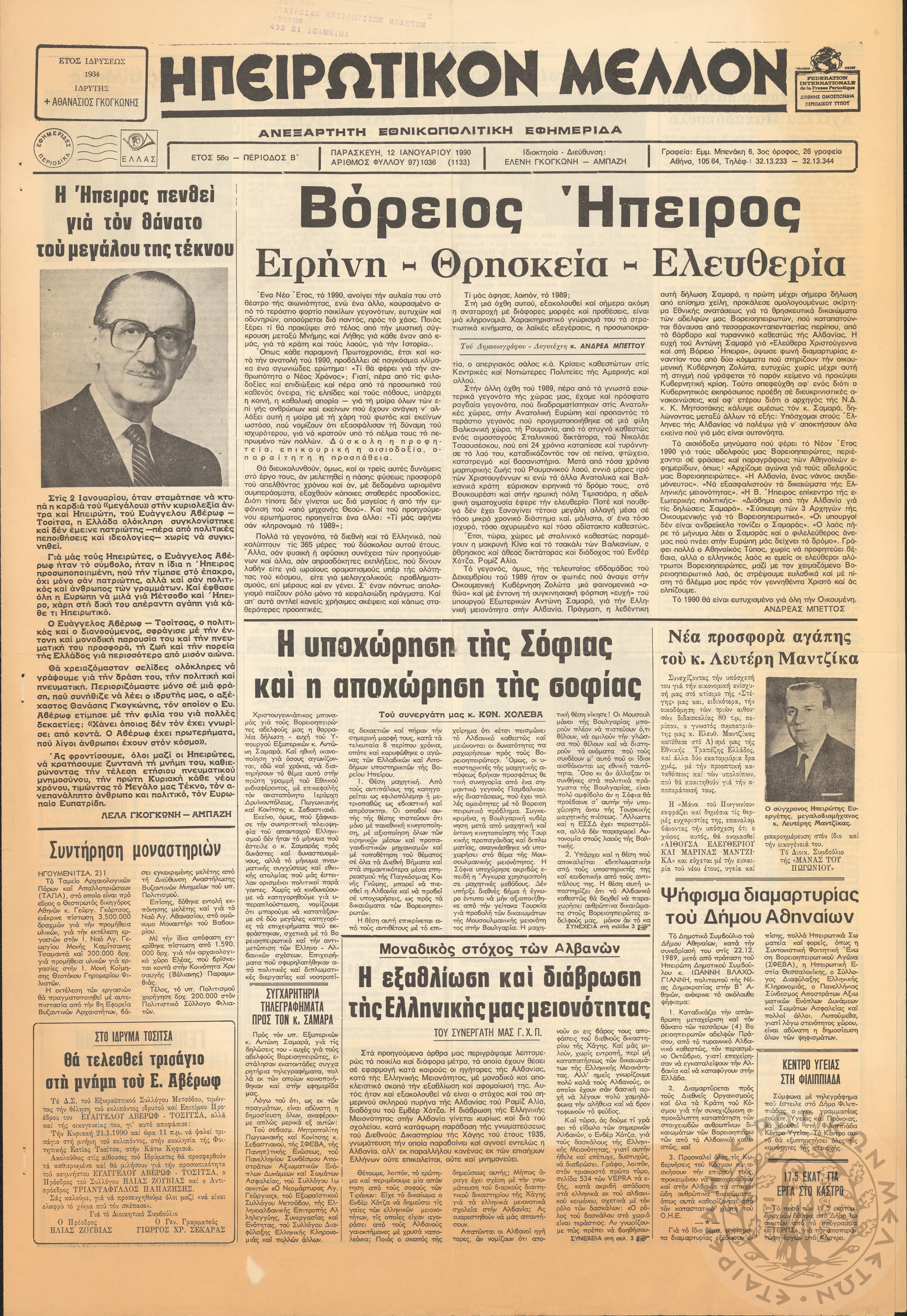 Ηπειρωτικόν μέλλον: ανεξάρτητη εθνικοπολιτική εφημερίδα, 1990, φ. 97/1036 (1133)Έτος 56ο, φ. 97/1036 (1133)...
