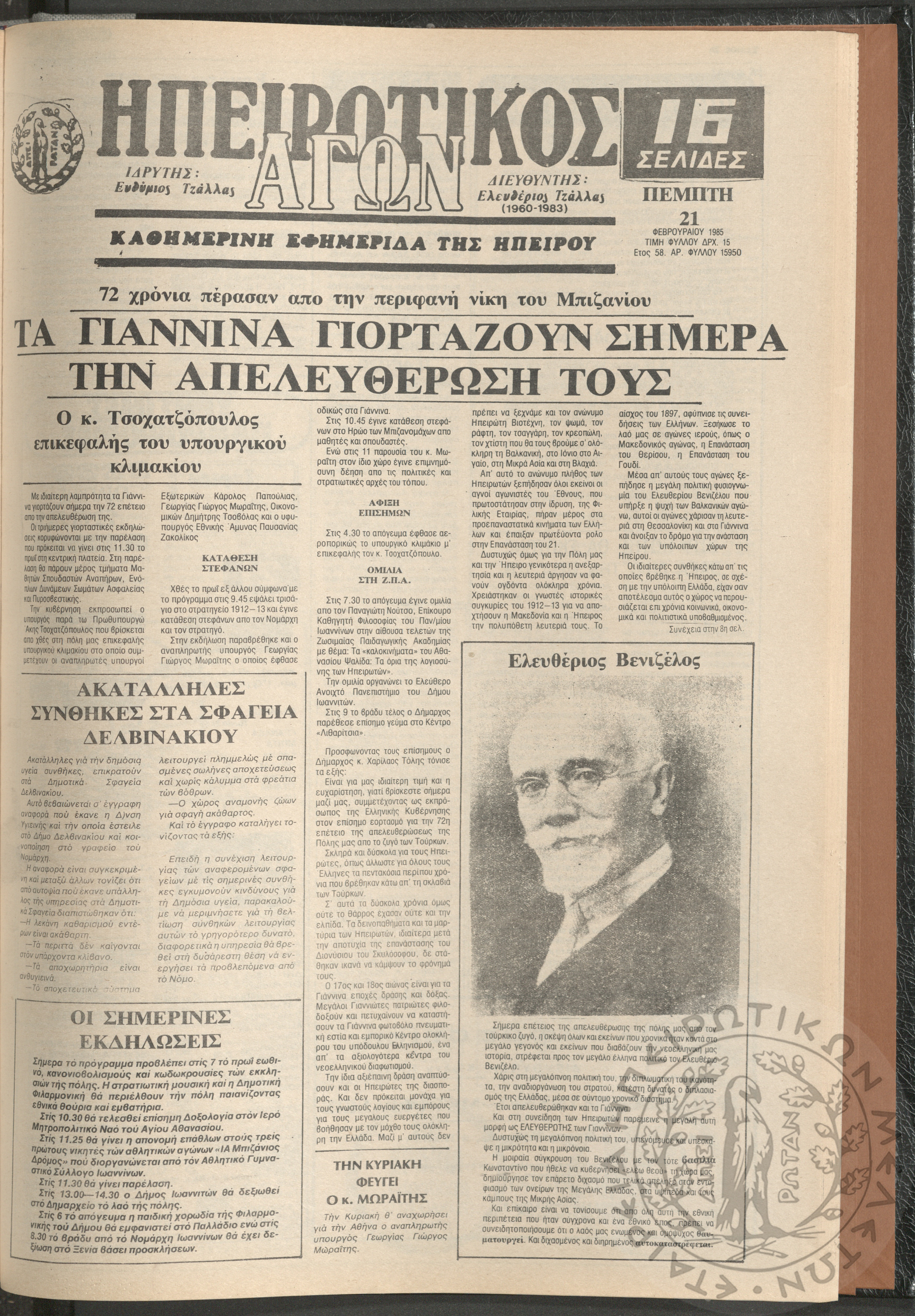 Ηπειρωτικός Αγών: η μεγαλυτέρα Ηπειρωτική εφημερίς εκδιδόμενη καθημερινώς εν Ιωαννίνοις, φ. 14650Έτος 54, φ. 14650...