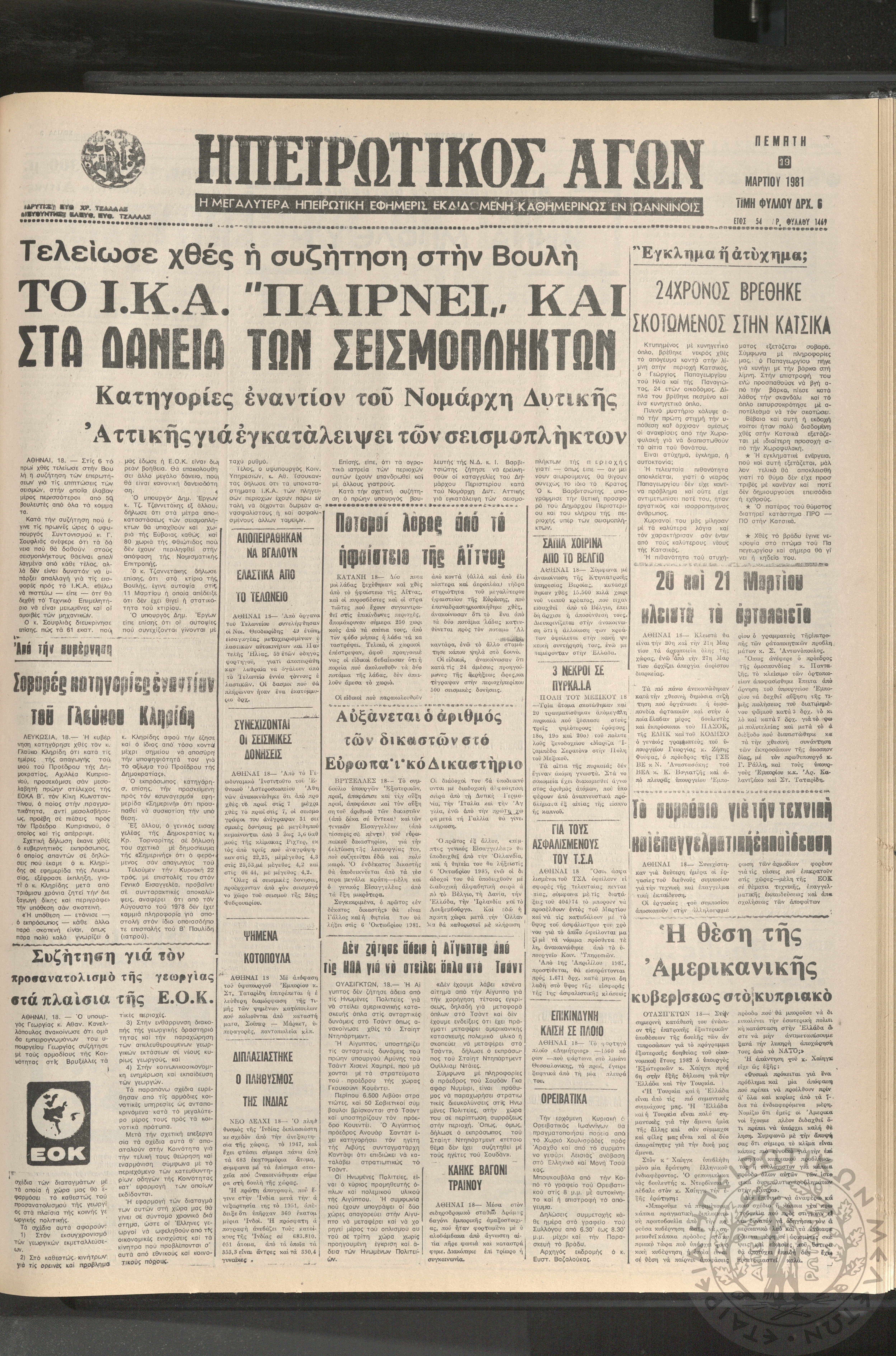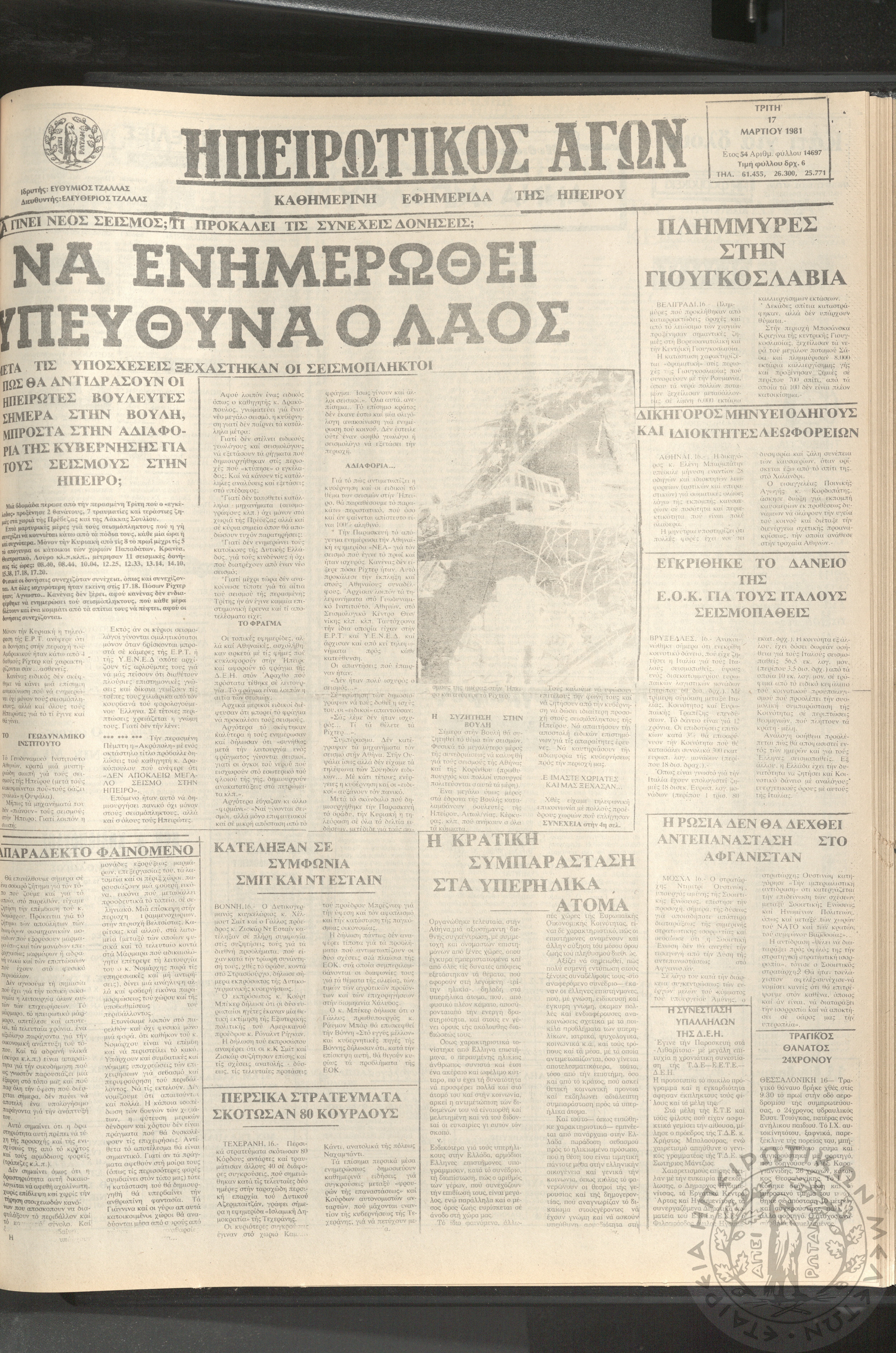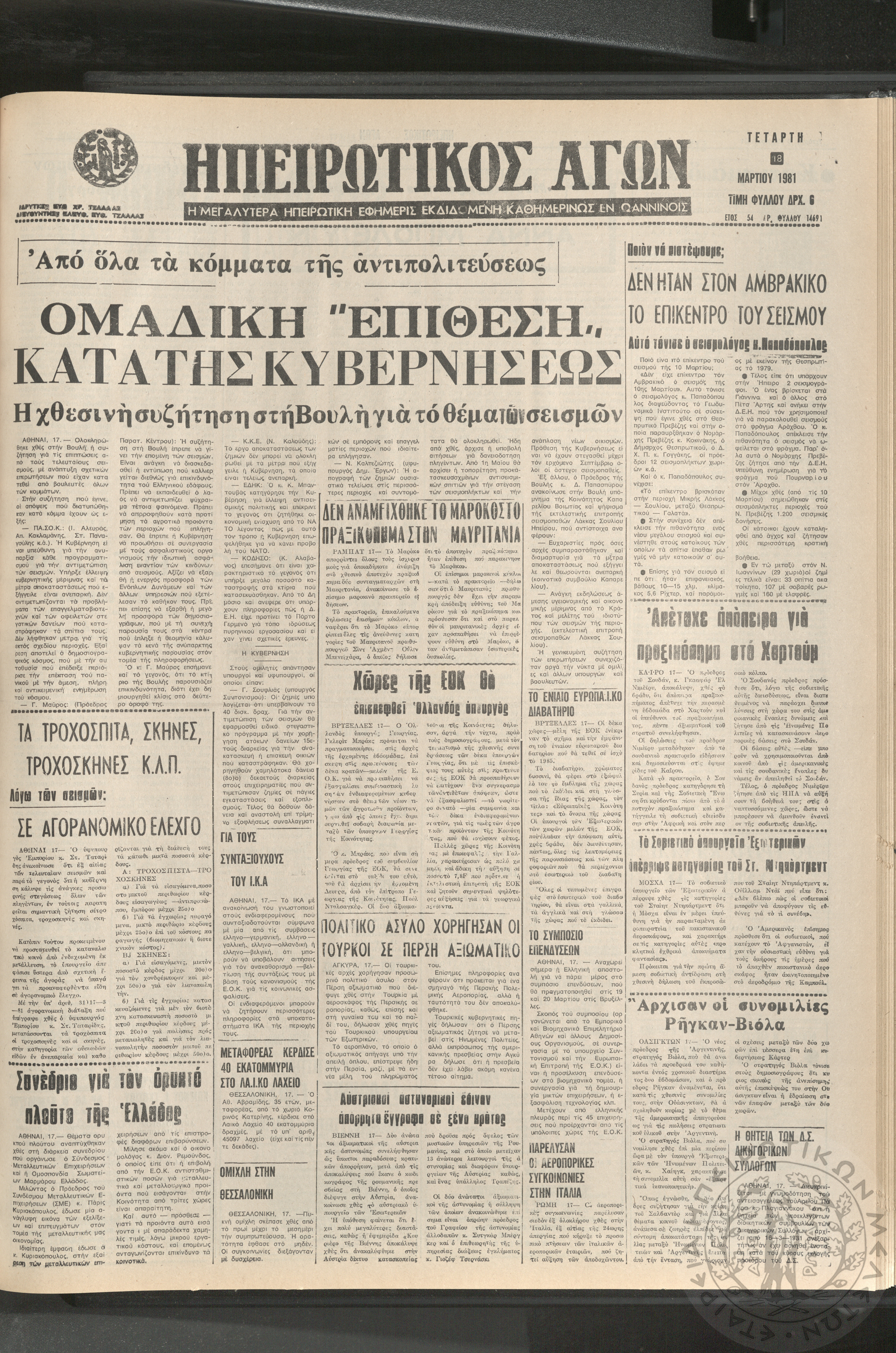 Ηπειρωτικός Αγών: η μεγαλυτέρα Ηπειρωτική εφημερίς εκδιδόμενη καθημερινώς εν Ιωαννίνοις, φ. 14706Έτος 54, φ. 14706...