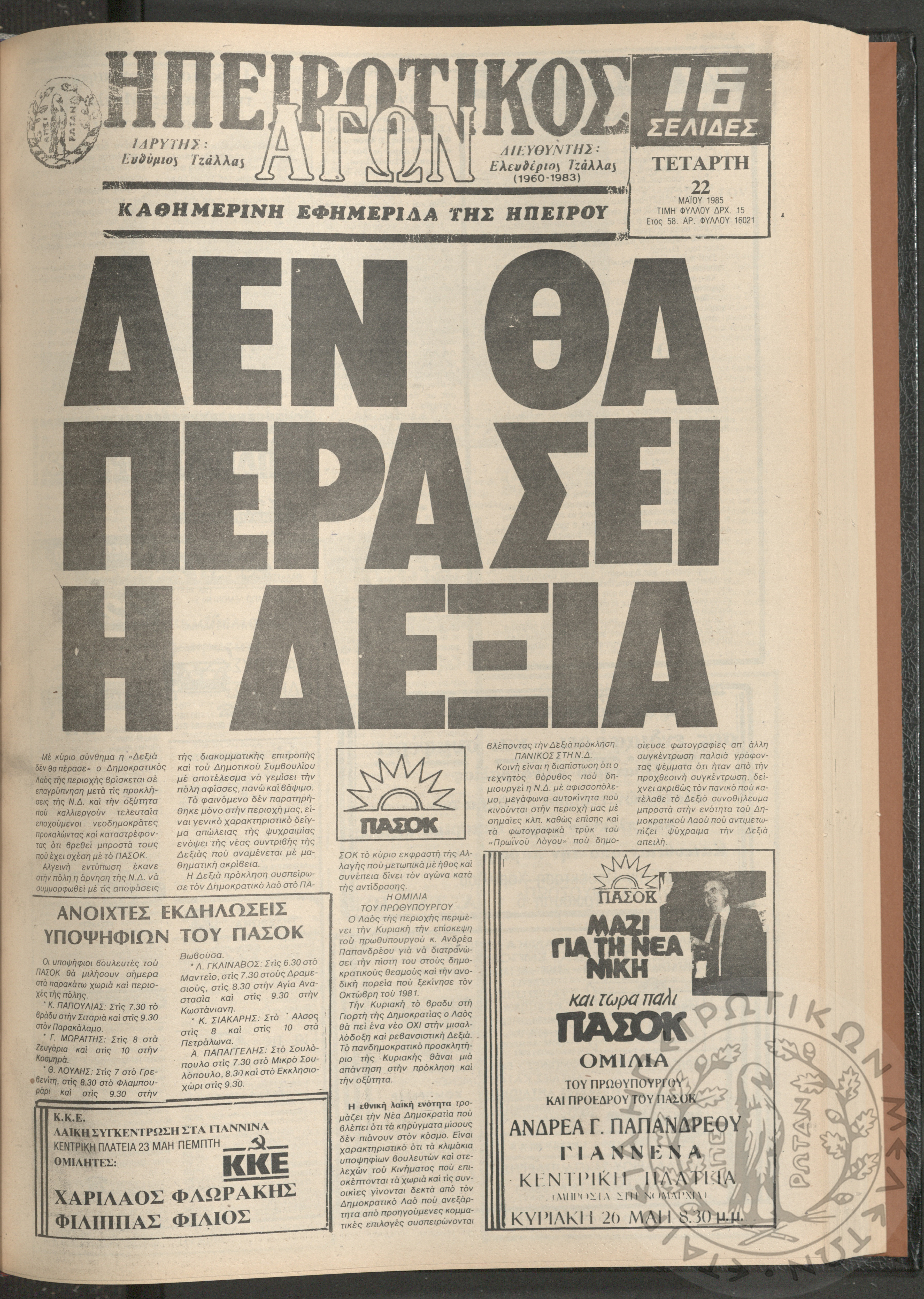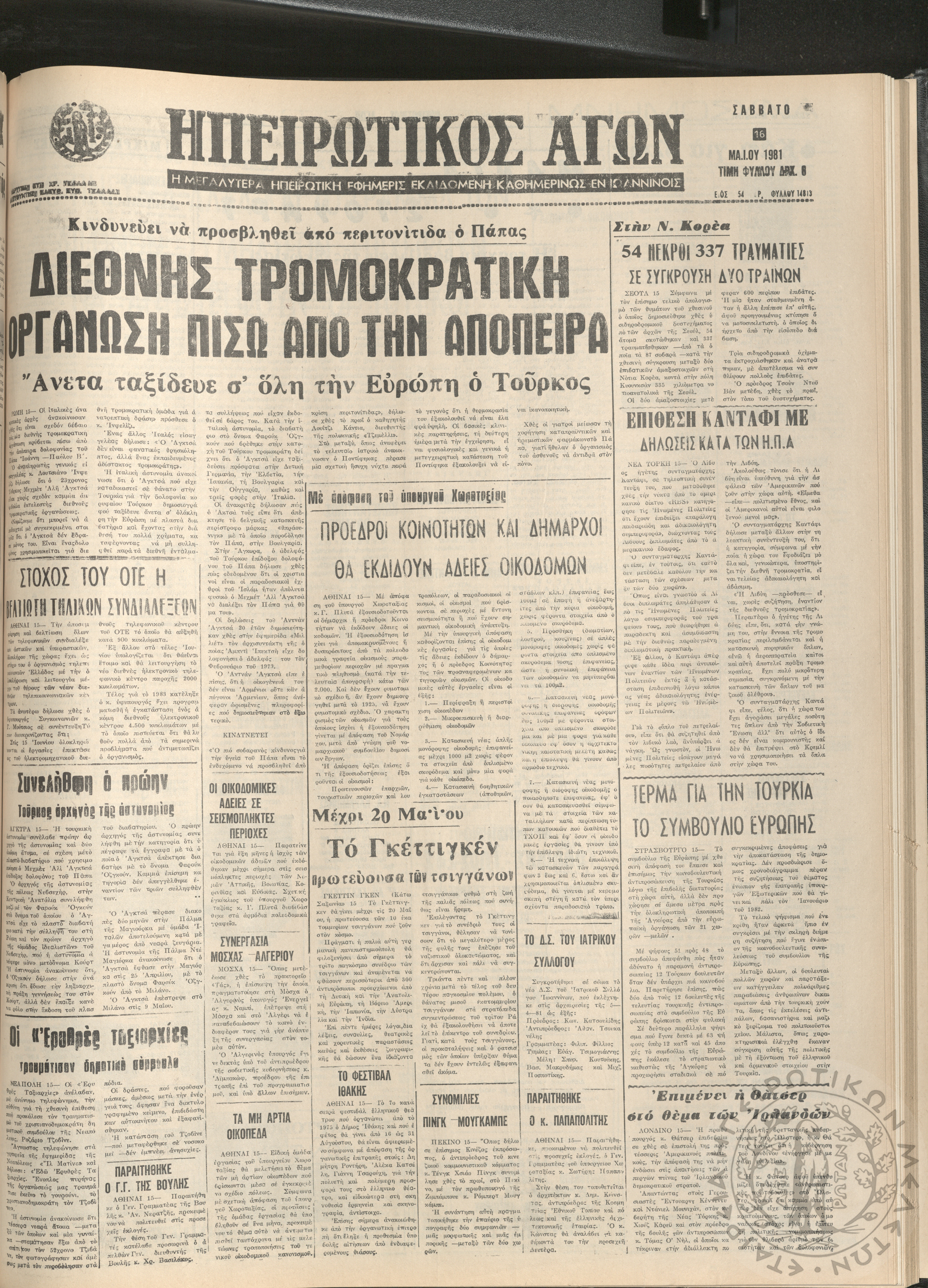 Ηπειρωτικός Αγών: η μεγαλυτέρα Ηπειρωτική εφημερίς εκδιδόμενη καθημερινώς εν Ιωαννίνοις, φ. 14811Έτος 54, φ. 14811...