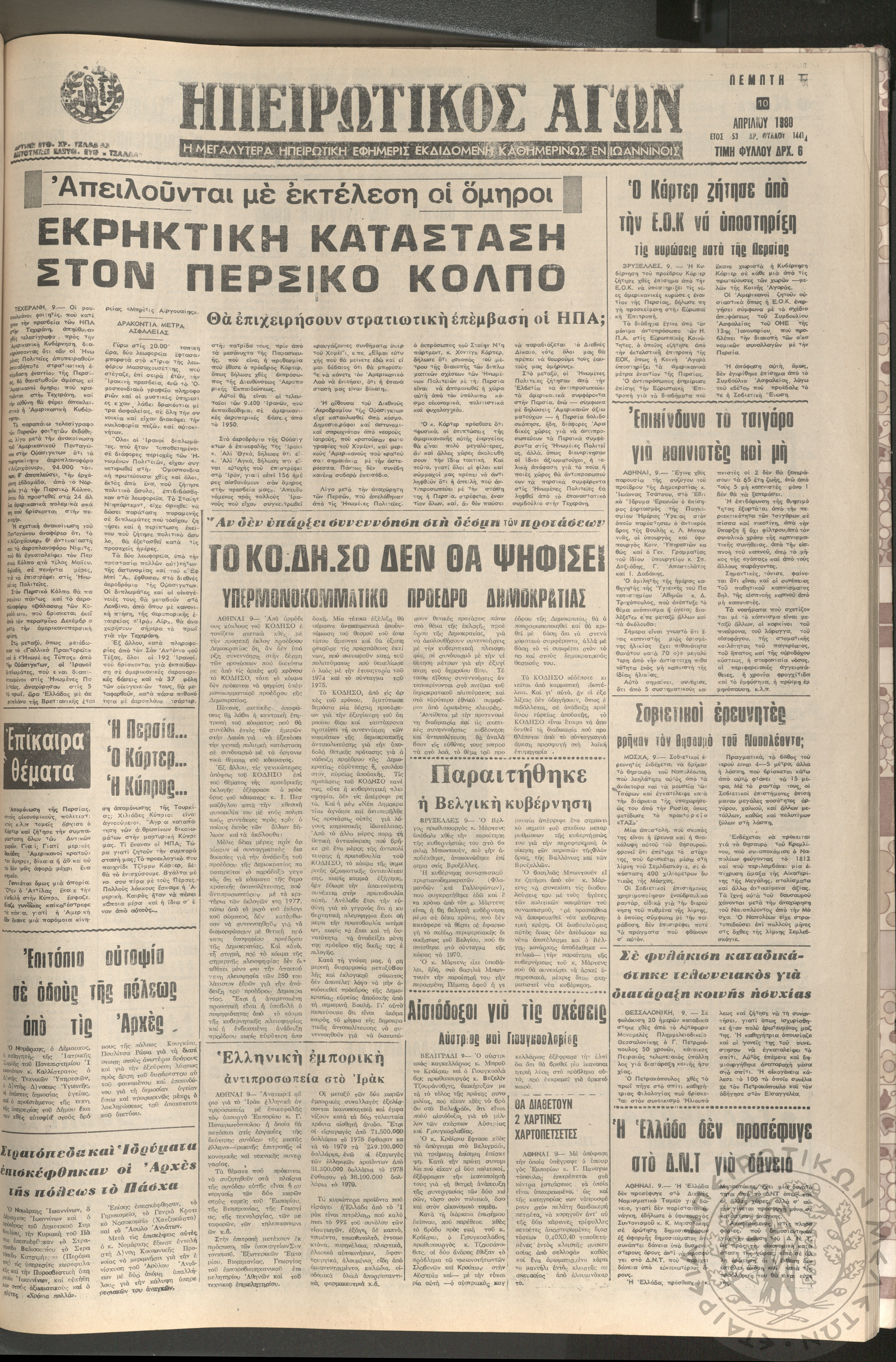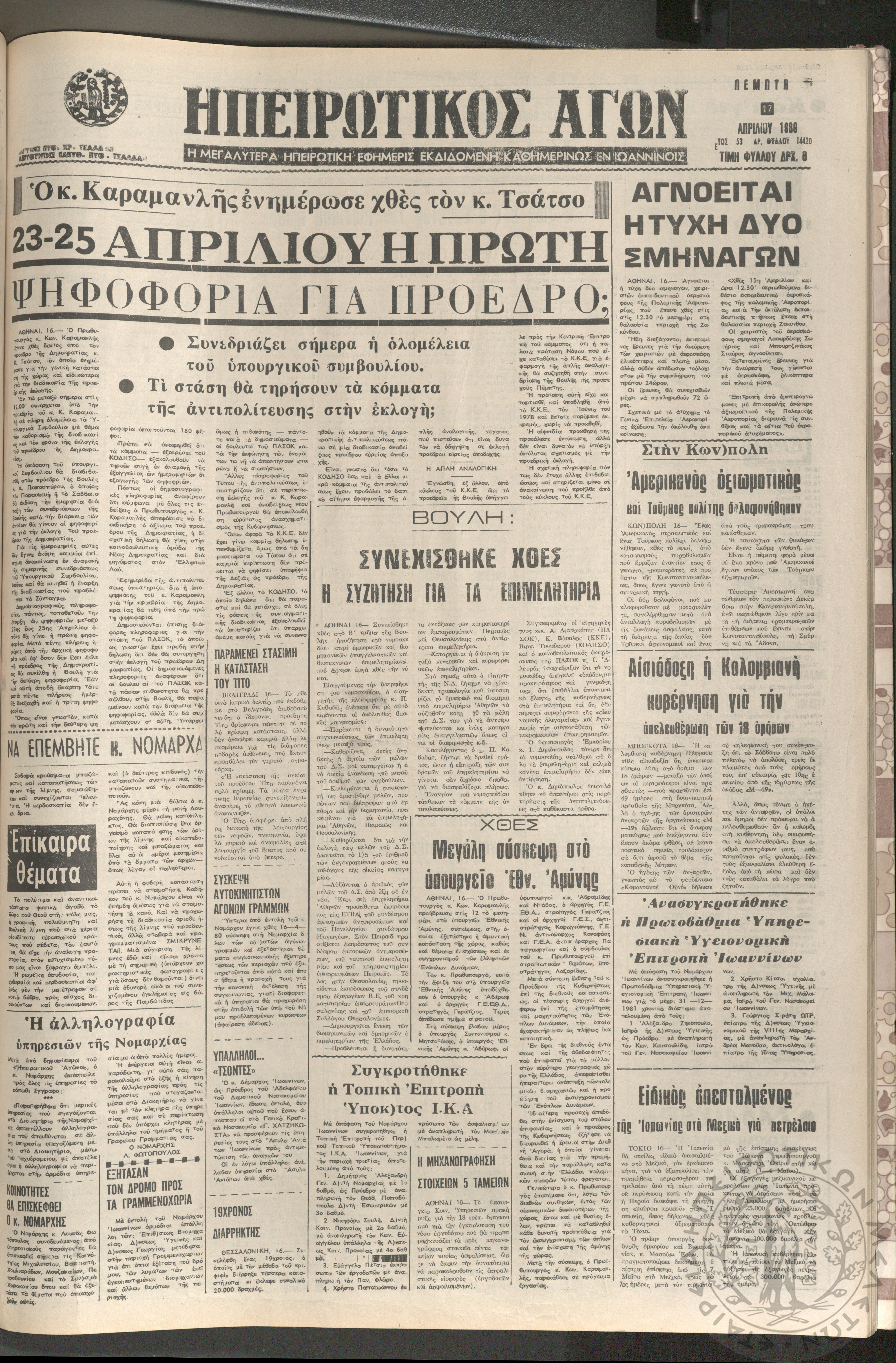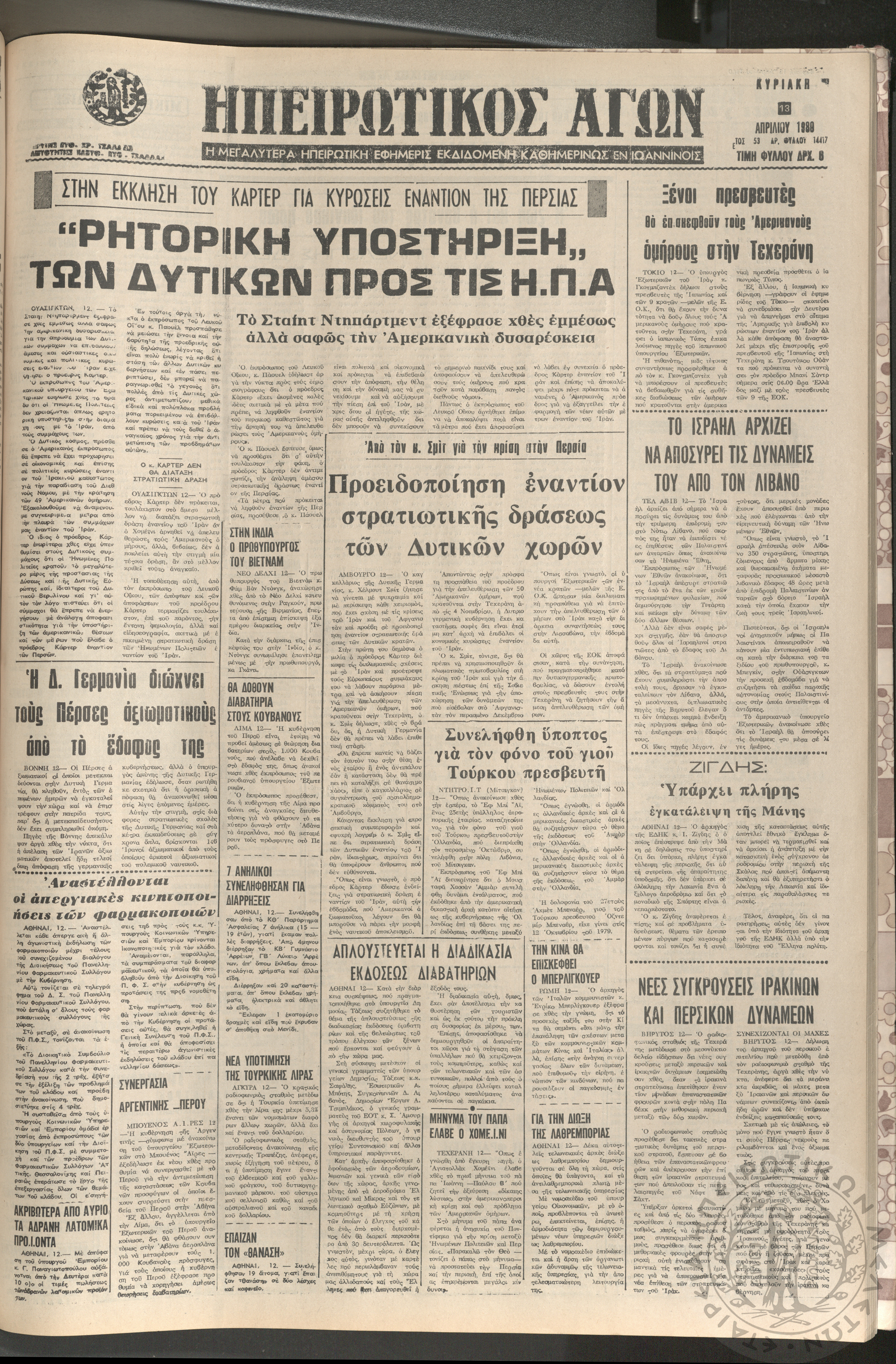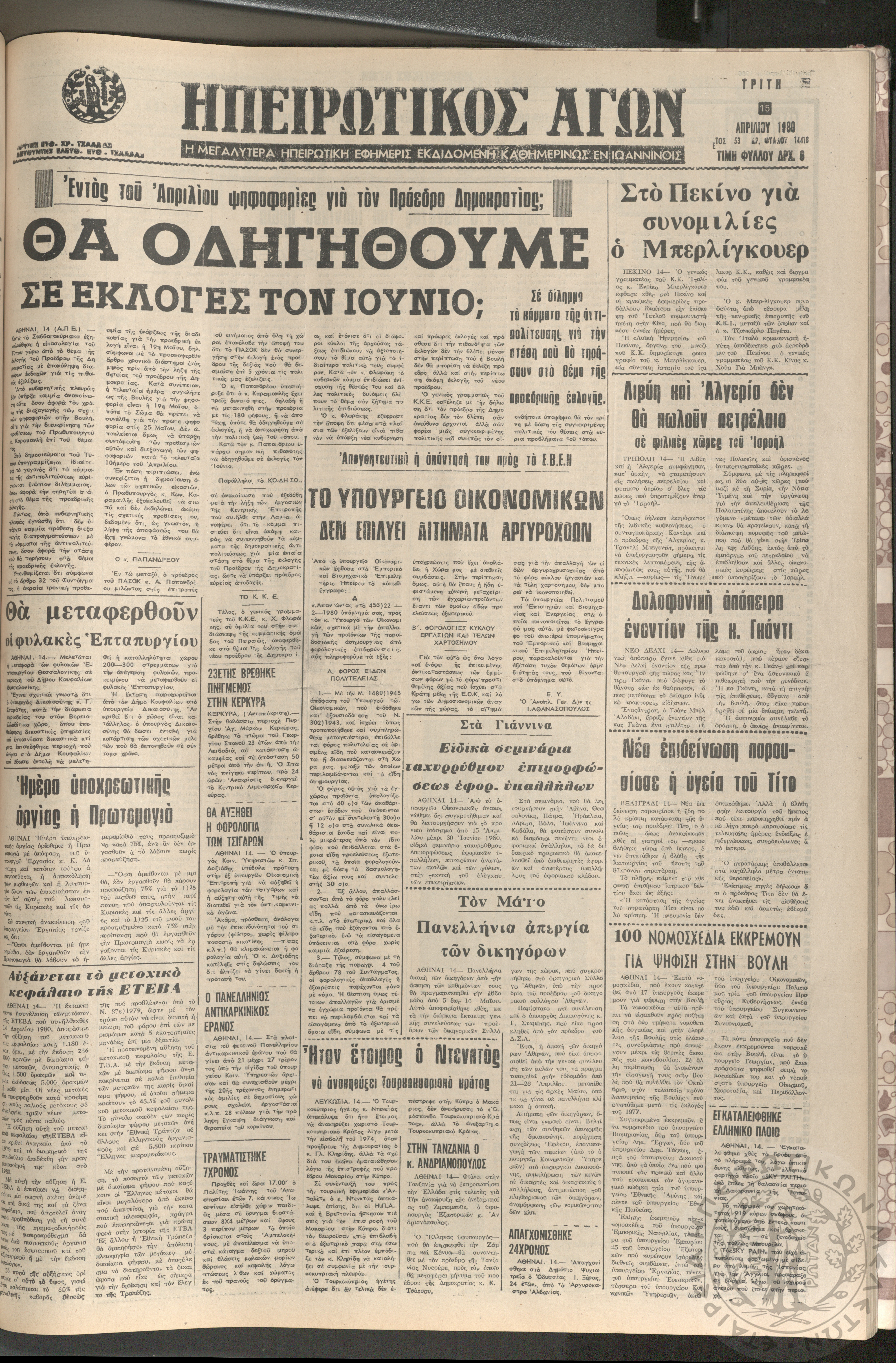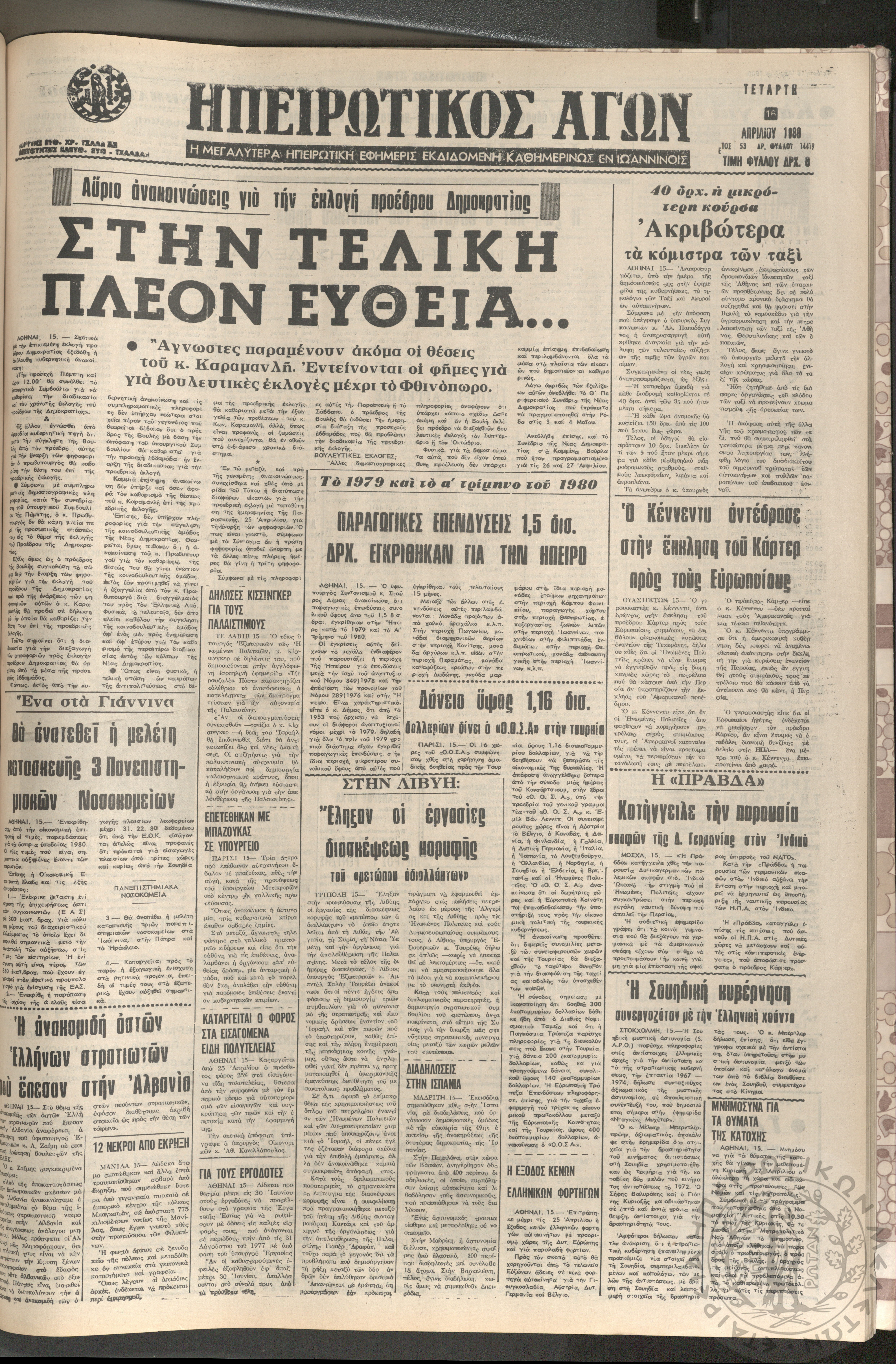 Ηπειρωτικός Αγών: η μεγαλυτέρα Ηπειρωτική εφημερίς εκδιδόμενη καθημερινώς εν Ιωαννίνοις, 1980, φ. 14417Έτος 53, φ. 14417...