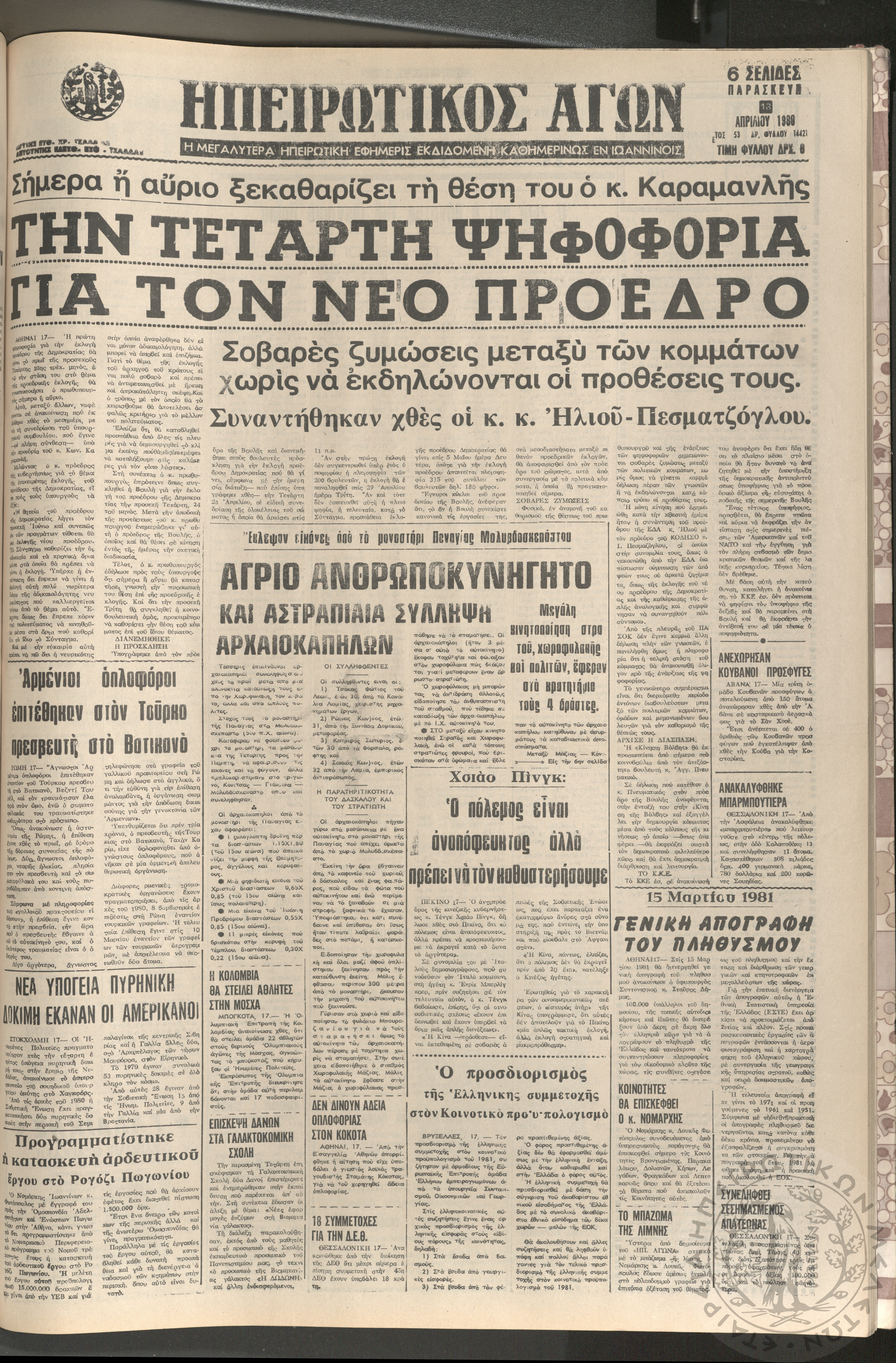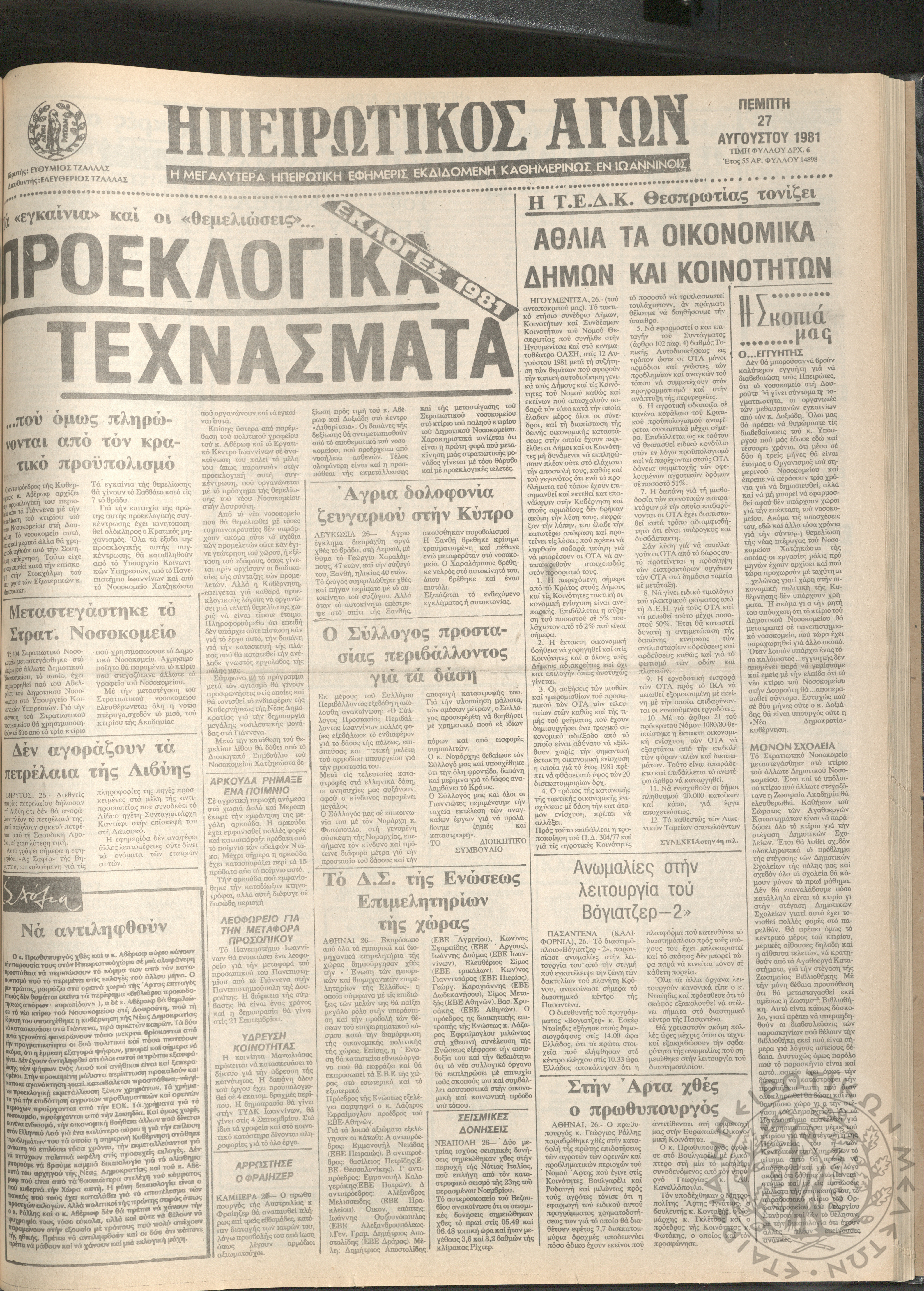 Ηπειρωτικός Αγών: η μεγαλυτέρα Ηπειρωτική εφημερίς εκδιδόμενη καθημερινώς εν Ιωαννίνοις, 1981 φ. 14899Έτος 55, φ. 14899...