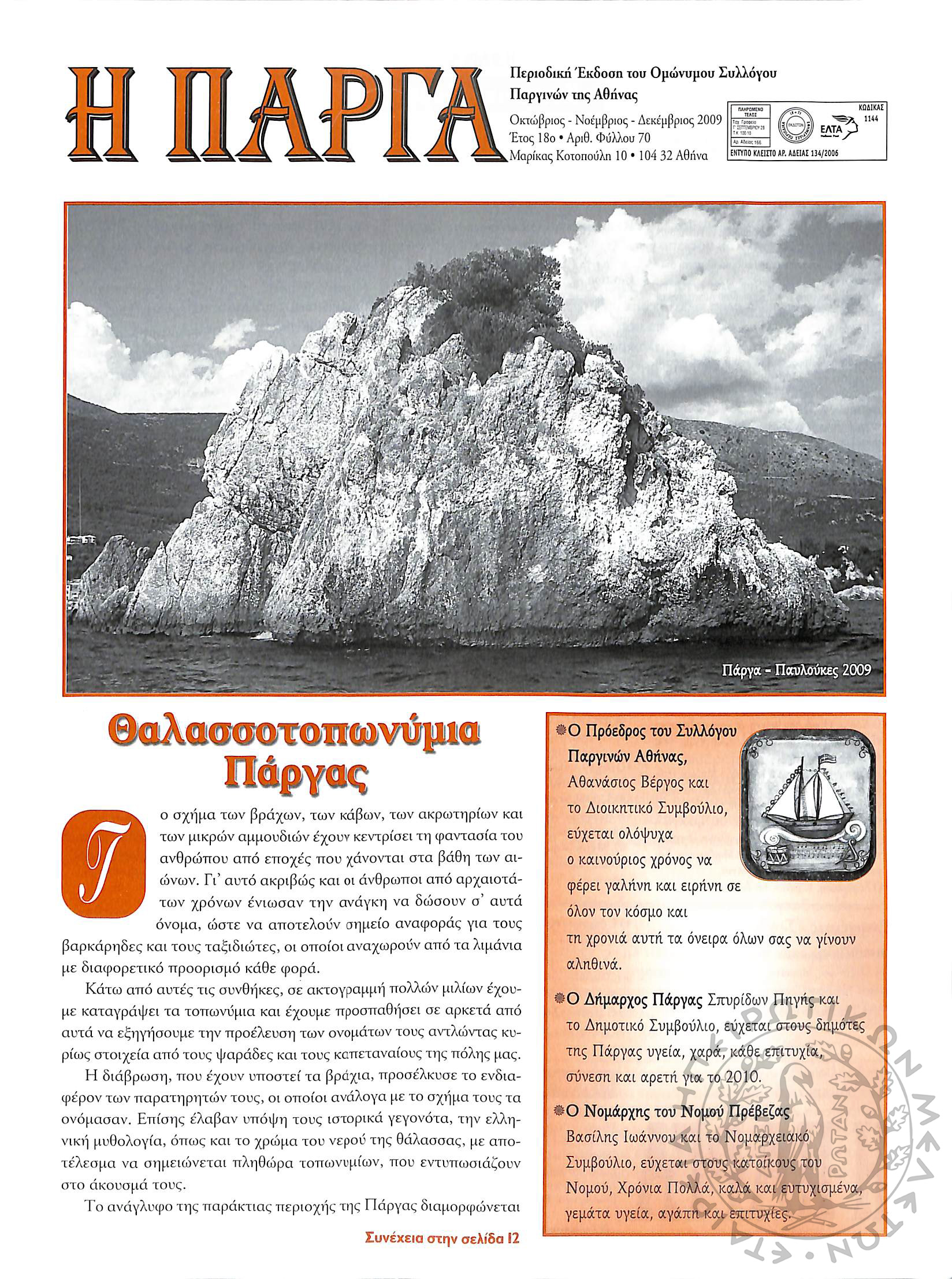 Η Πάργα: περιοδική έκδοση του ομώνυμου Συλλόγου Παργινών της Αθήνας, 2009, φ. 70Έτος 18ο, αρ. φ. 70...