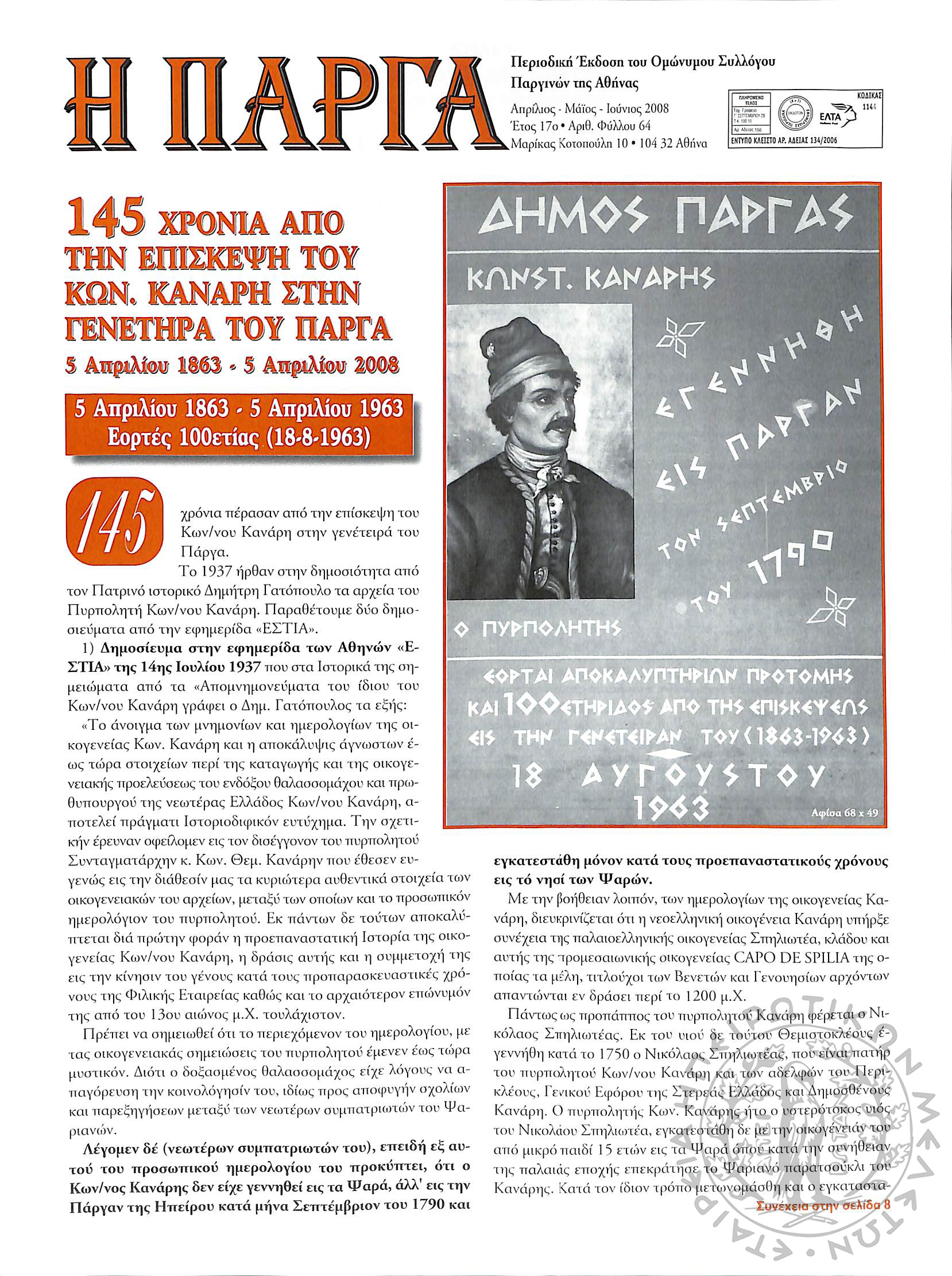 Η Πάργα: περιοδική έκδοση του ομώνυμου Συλλόγου Παργινών της Αθήνας, 2008, φ. 64Έτος 17ο, αρ. φ. 64...