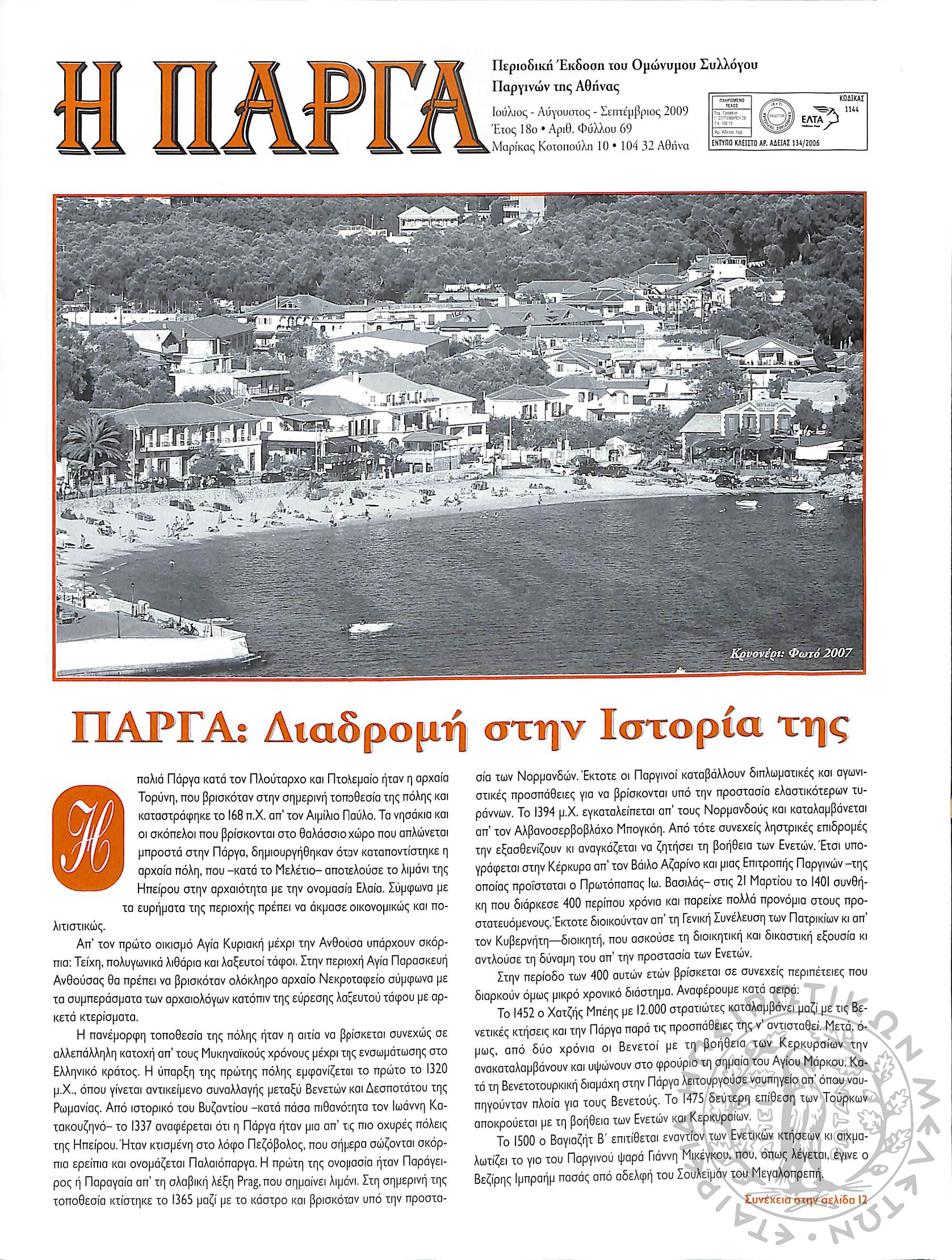 Η Πάργα: περιοδική έκδοση του ομώνυμου Συλλόγου Παργινών της Αθήνας, 2009, φ. 69Έτος 18ο, αρ. φ. 69...