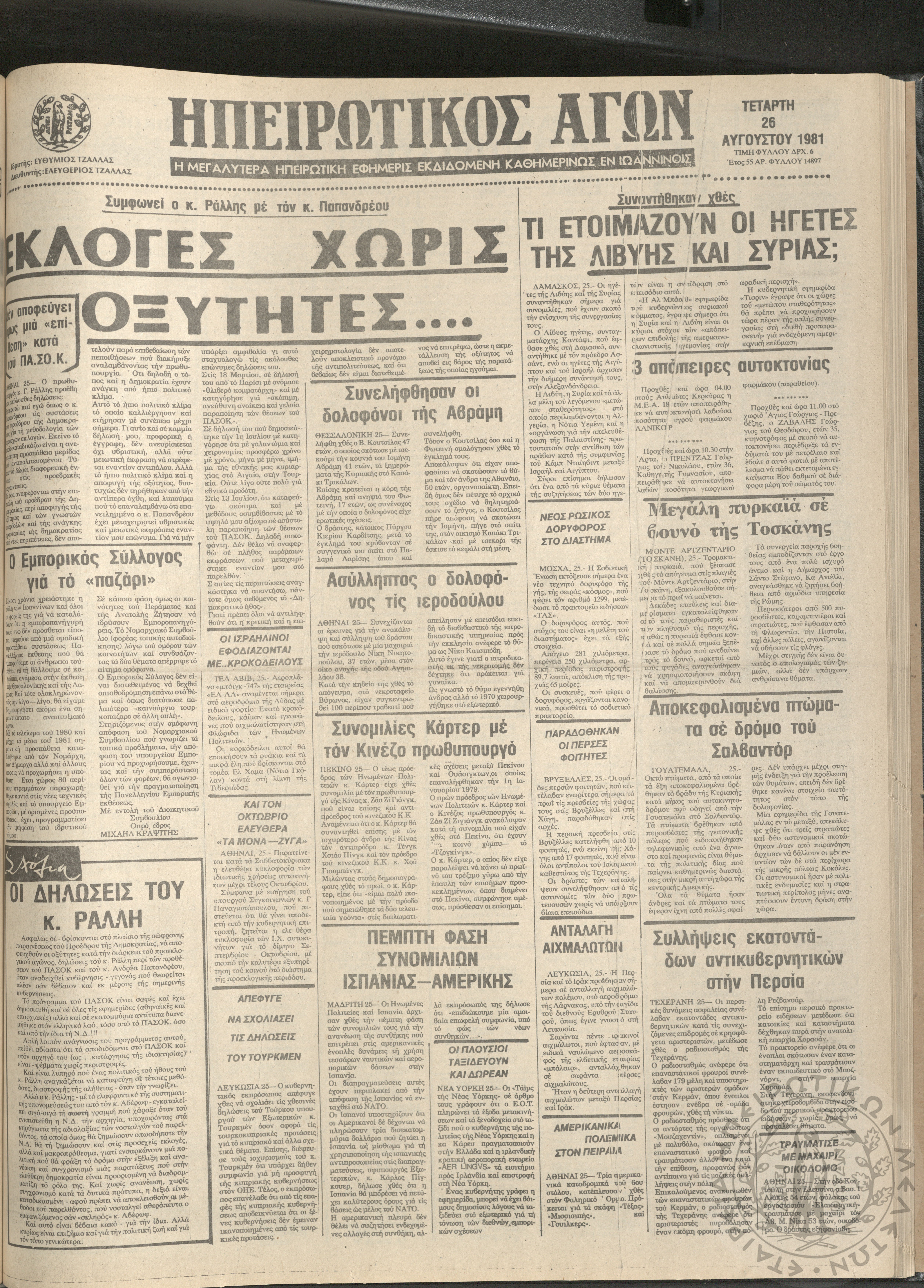 Ηπειρωτικός Αγών: η μεγαλυτέρα Ηπειρωτική εφημερίς εκδιδόμενη καθημερινώς εν Ιωαννίνοις, 1981, φ. 14897Έτος 55, φ. 14897...