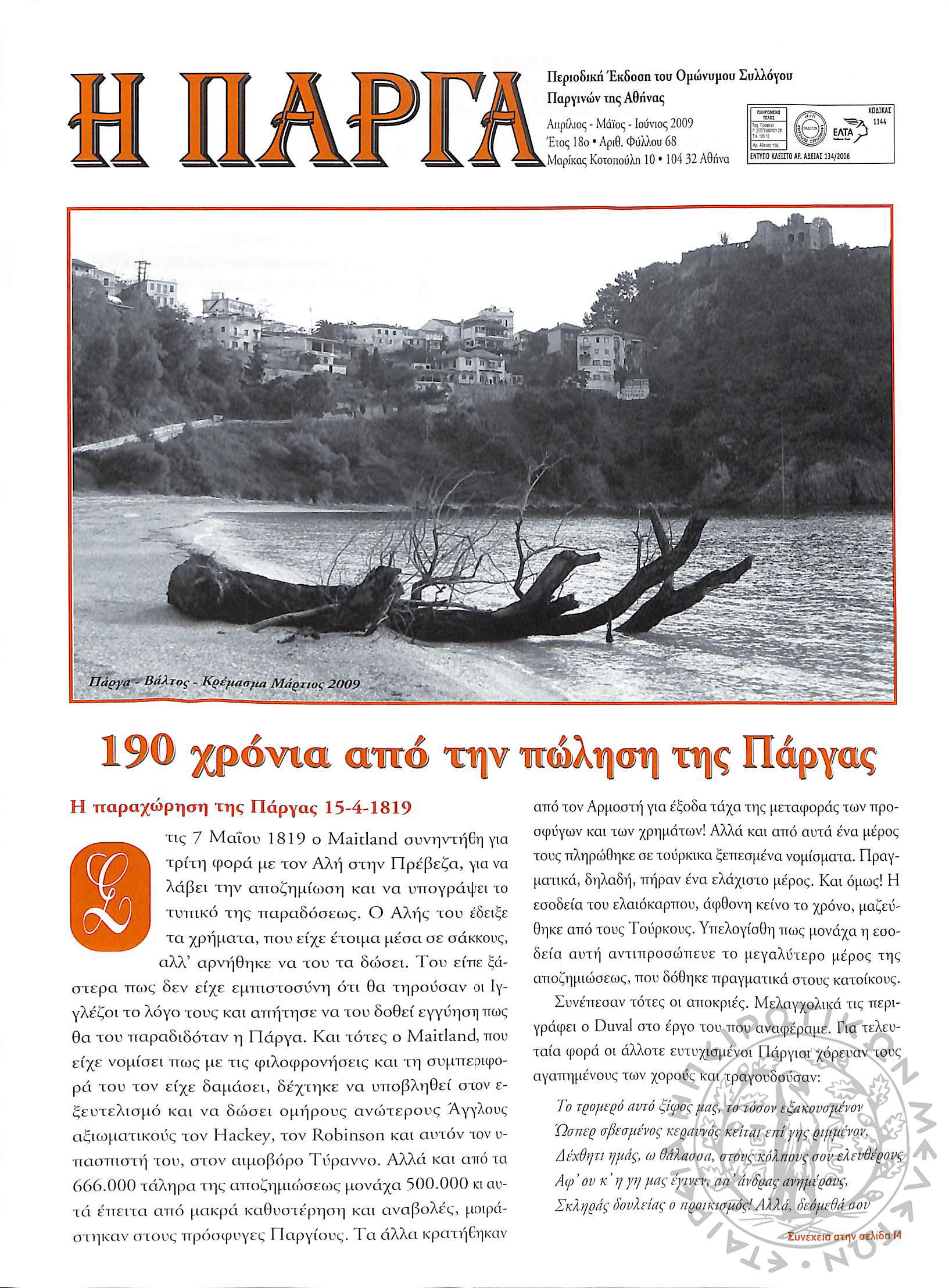 Η Πάργα: περιοδική έκδοση του ομώνυμου Συλλόγου Παργινών της Αθήνας, 2009, φ. 68Έτος 18ο, αρ. φ. 68...