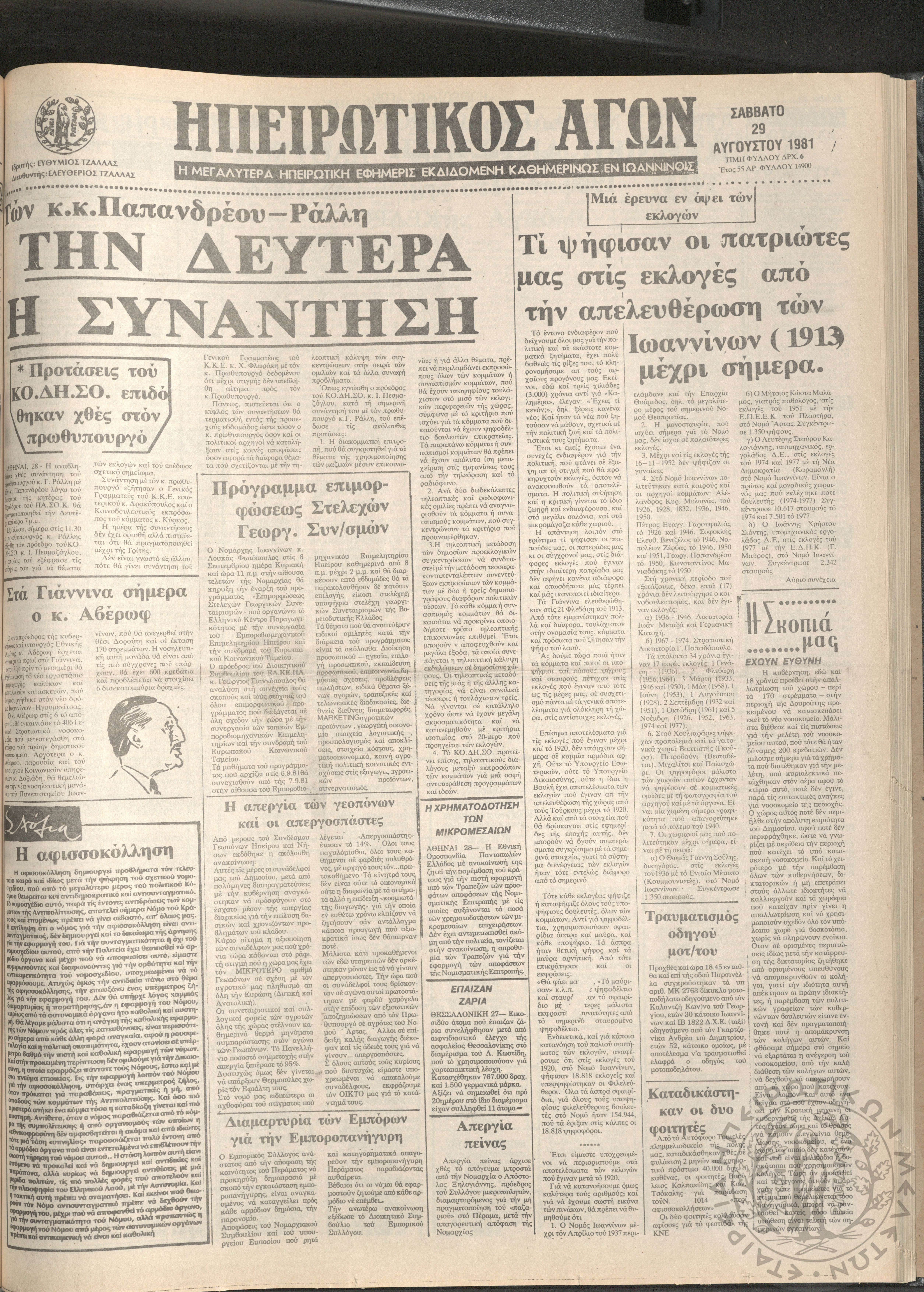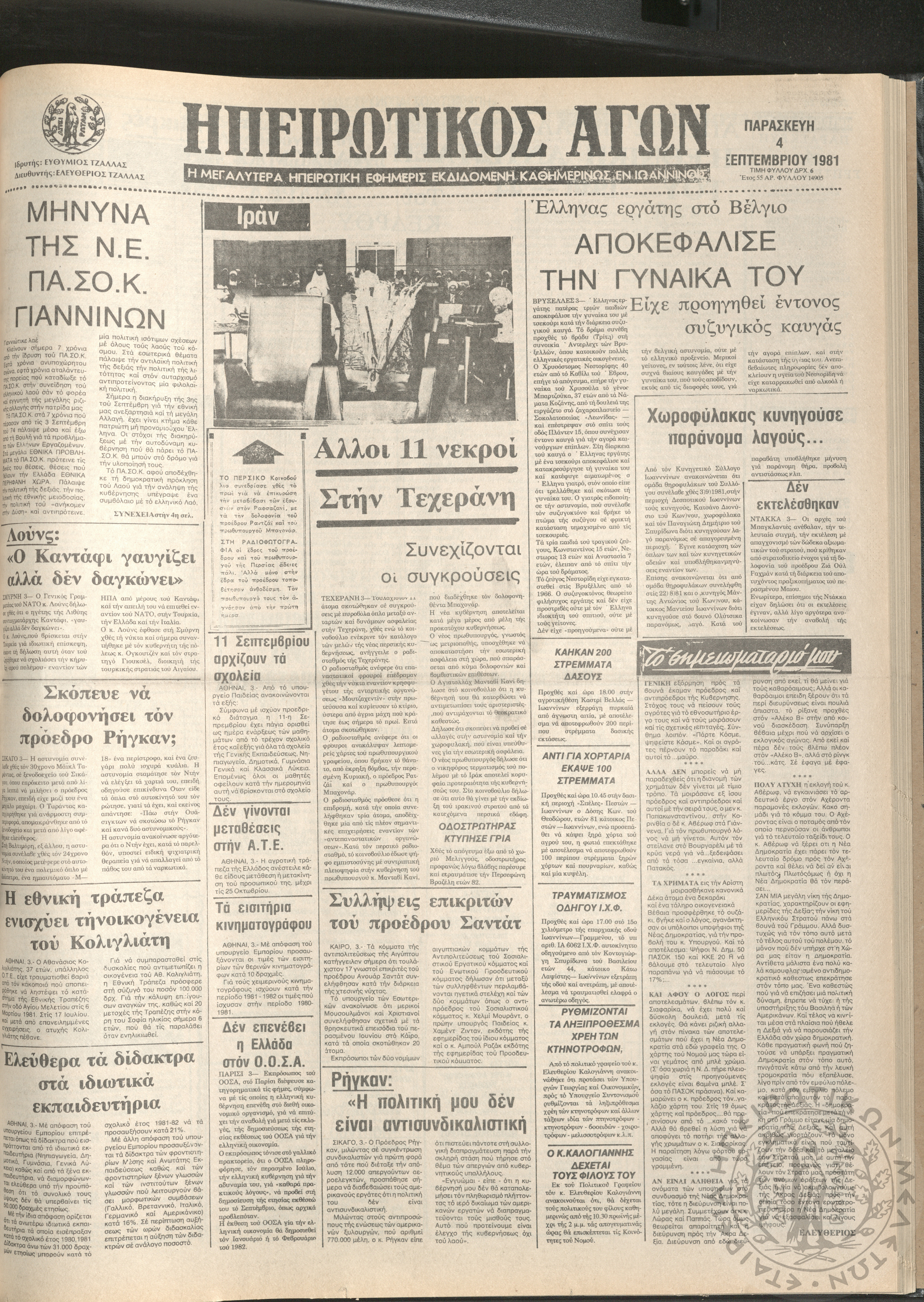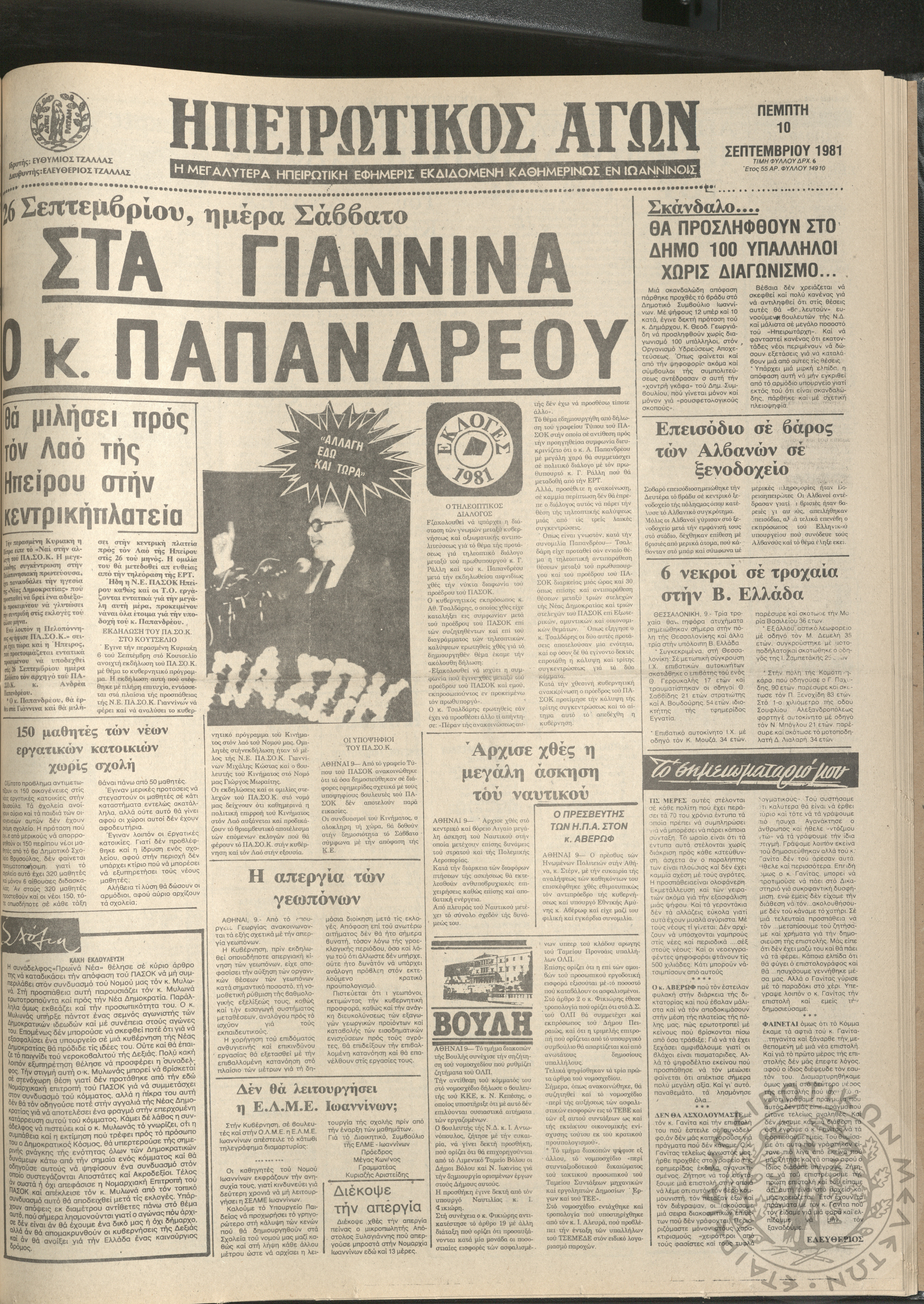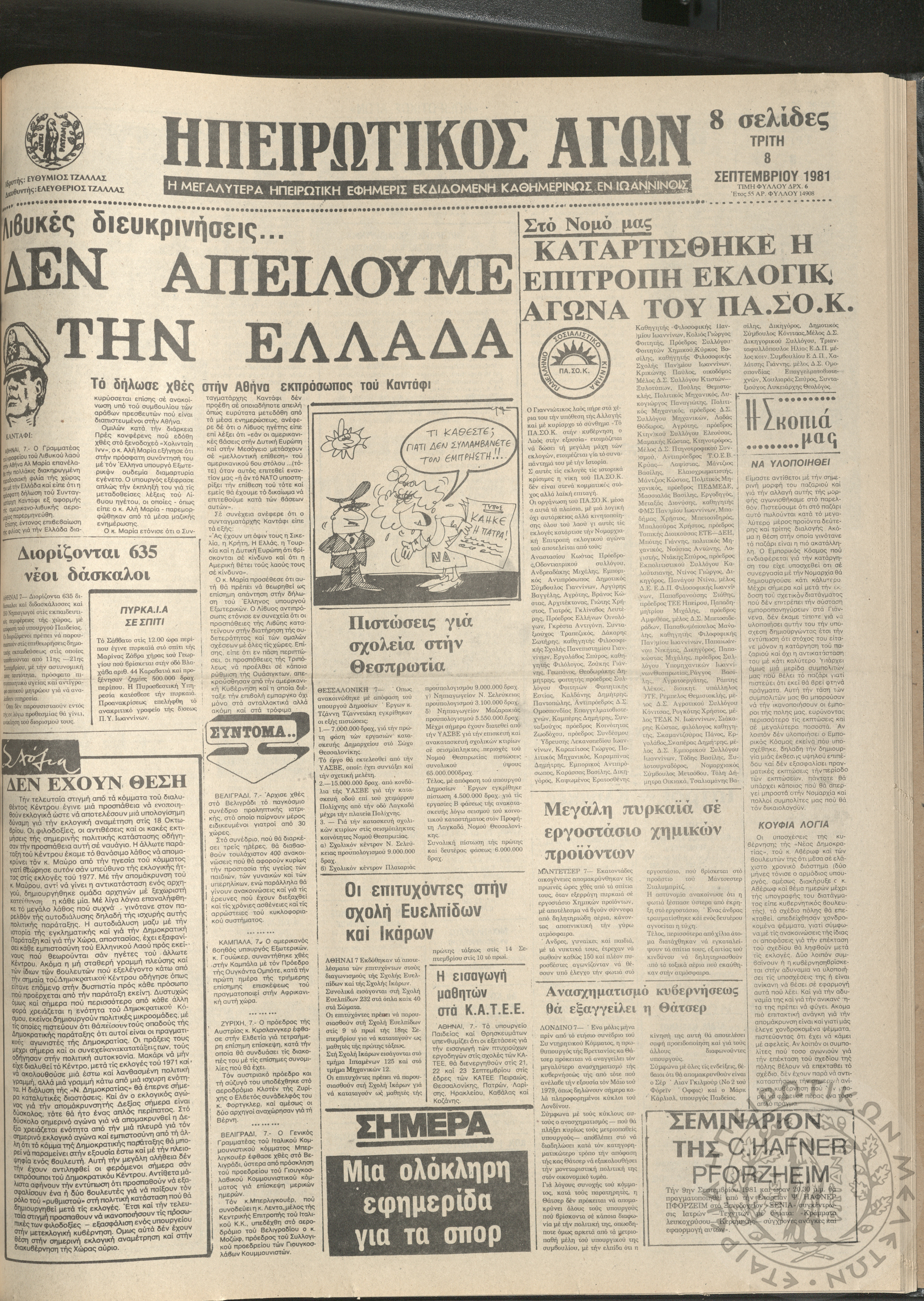 Ηπειρωτικός Αγών: η μεγαλυτέρα Ηπειρωτική εφημερίς εκδιδόμενη καθημερινώς εν Ιωαννίνοις, 1981, φ. 14900Έτος 55, φ. 14900...