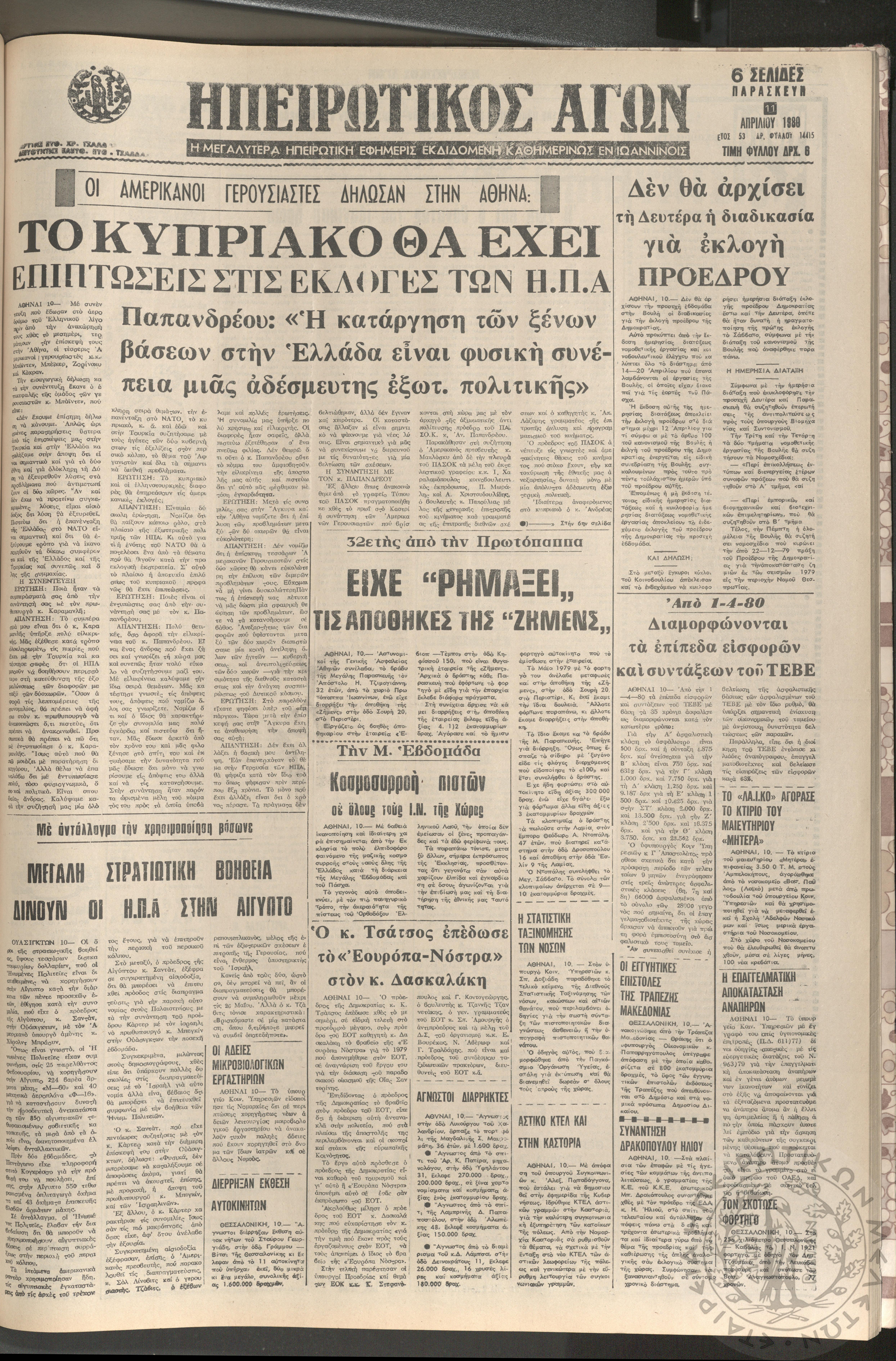 Ηπειρωτικός Αγών: η μεγαλυτέρα Ηπειρωτική εφημερίς εκδιδόμενη καθημερινώς εν Ιωαννίνοις, 1980, φ. 14415Έτος 53, φ. 14415...