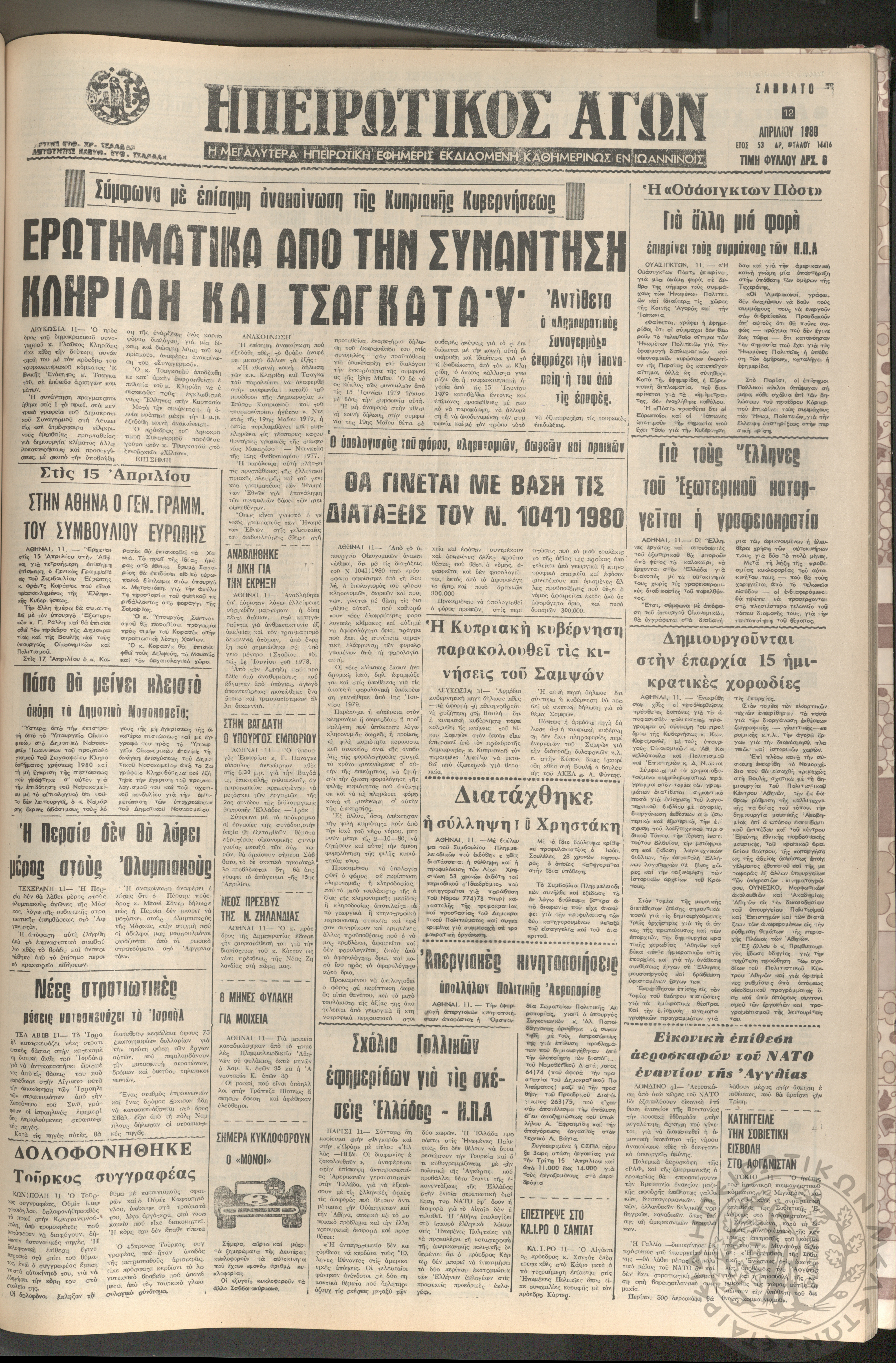 Ηπειρωτικός Αγών: η μεγαλυτέρα Ηπειρωτική εφημερίς εκδιδόμενη καθημερινώς εν Ιωαννίνοις, 1980, φ. 14419Έτος 53, φ. 14419...