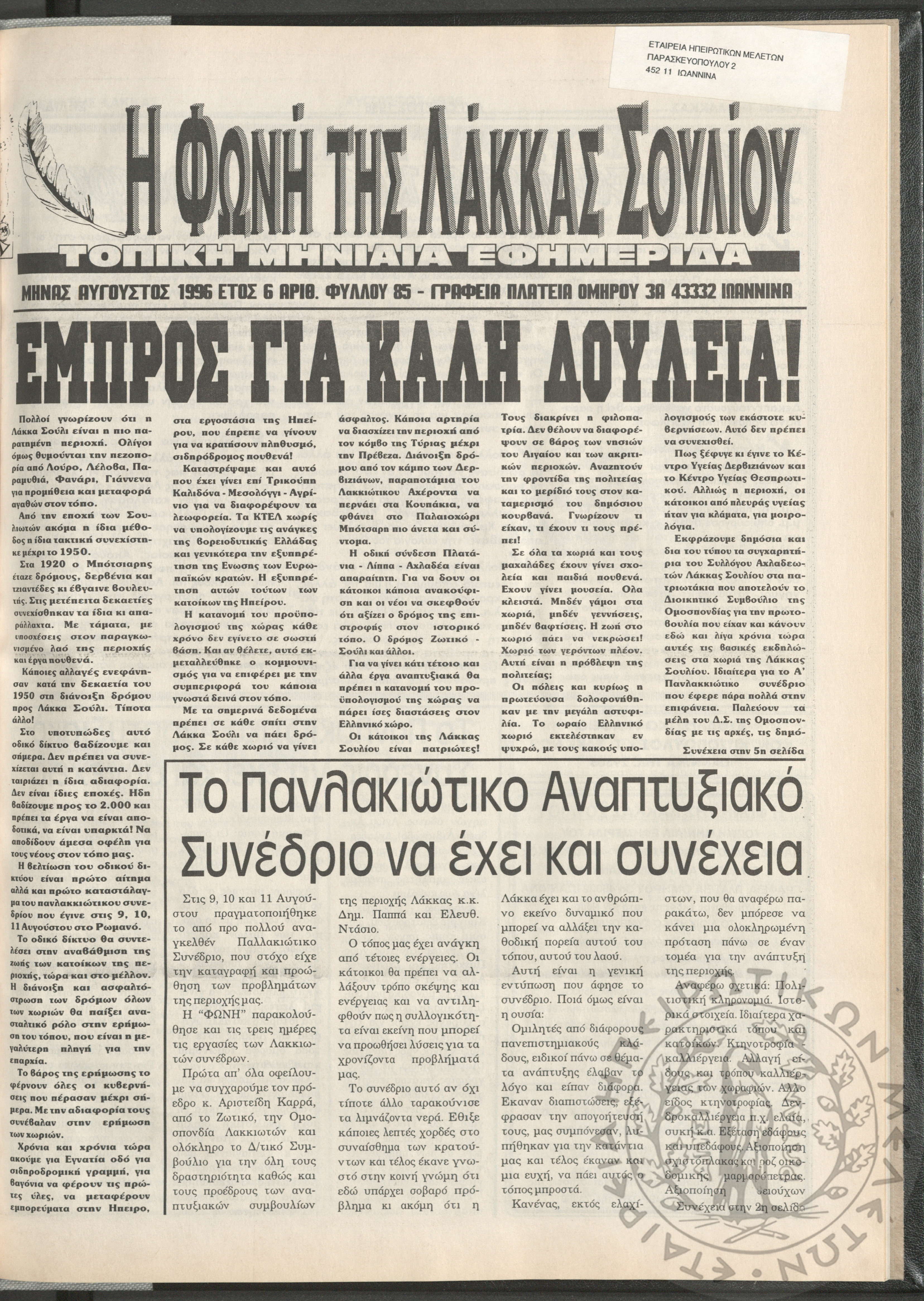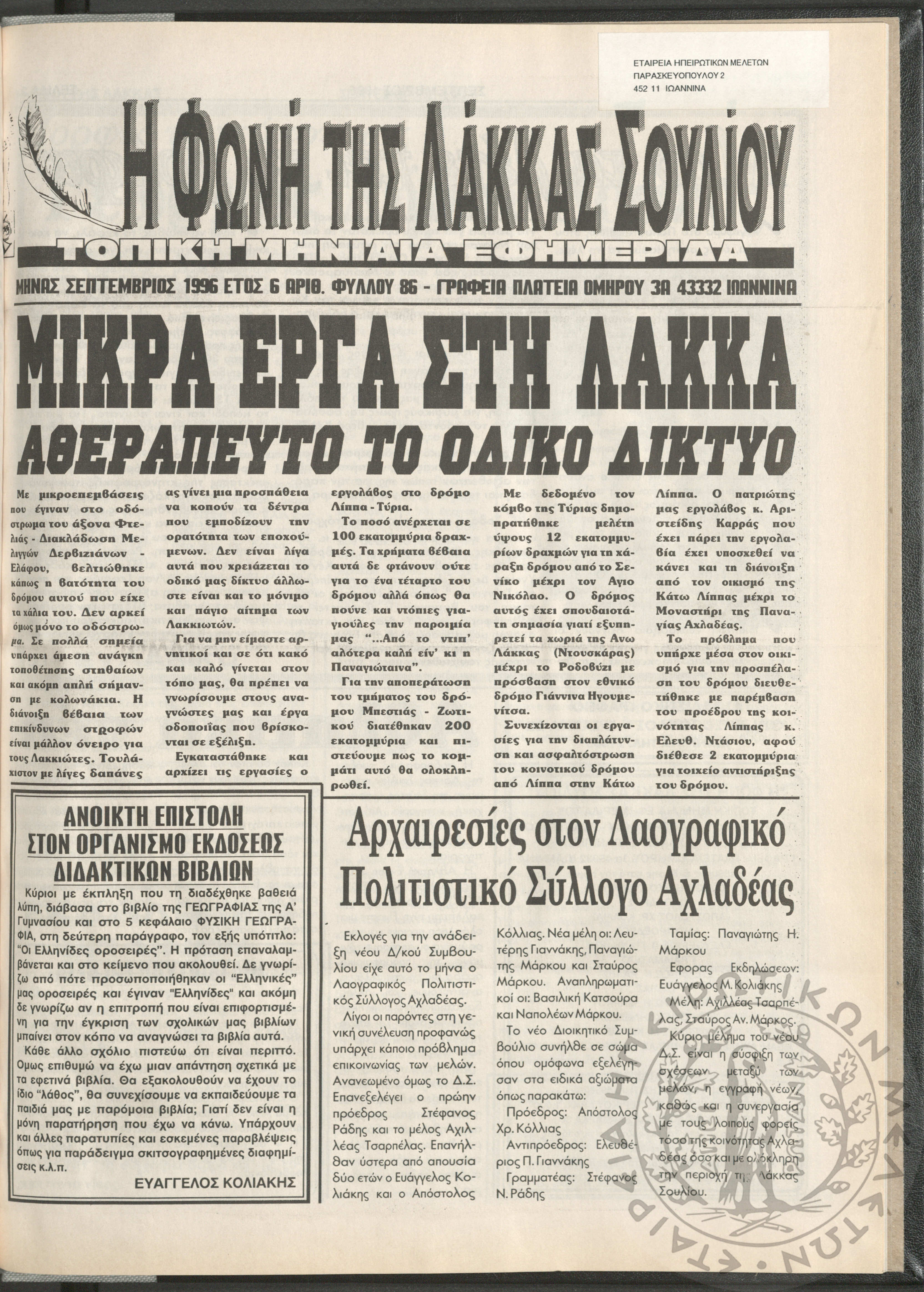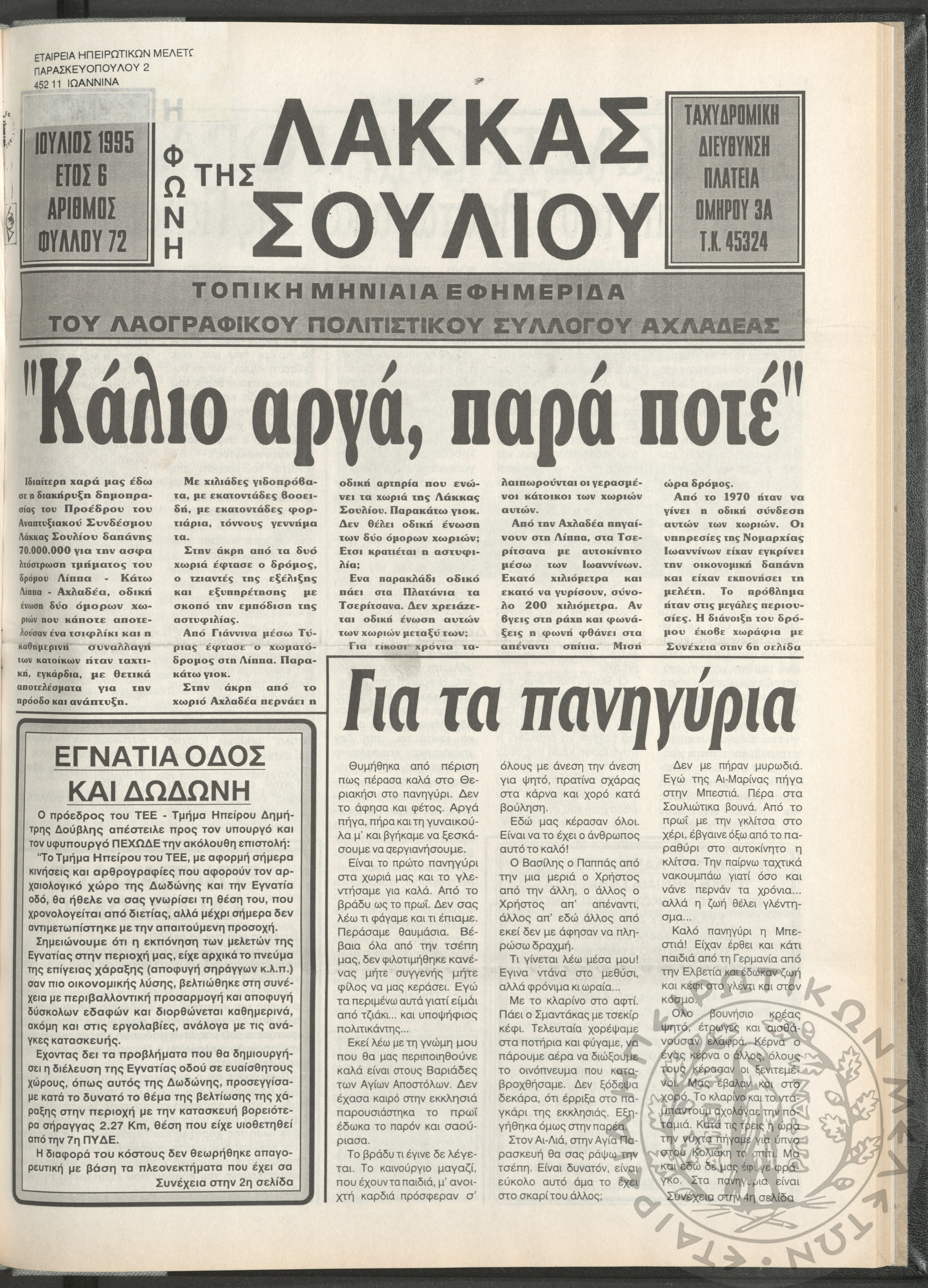 Η φωνή της Λάκκας Σουλίου: τοπική μηνιαία εφημερίδα-δημοσιογραφικό όργανο του Λαογραφικού Πολιτιστικού Συλλόγου Αχλαδέας, 1995, φ. 72Έτος 6ο, αρ. φ. 72...