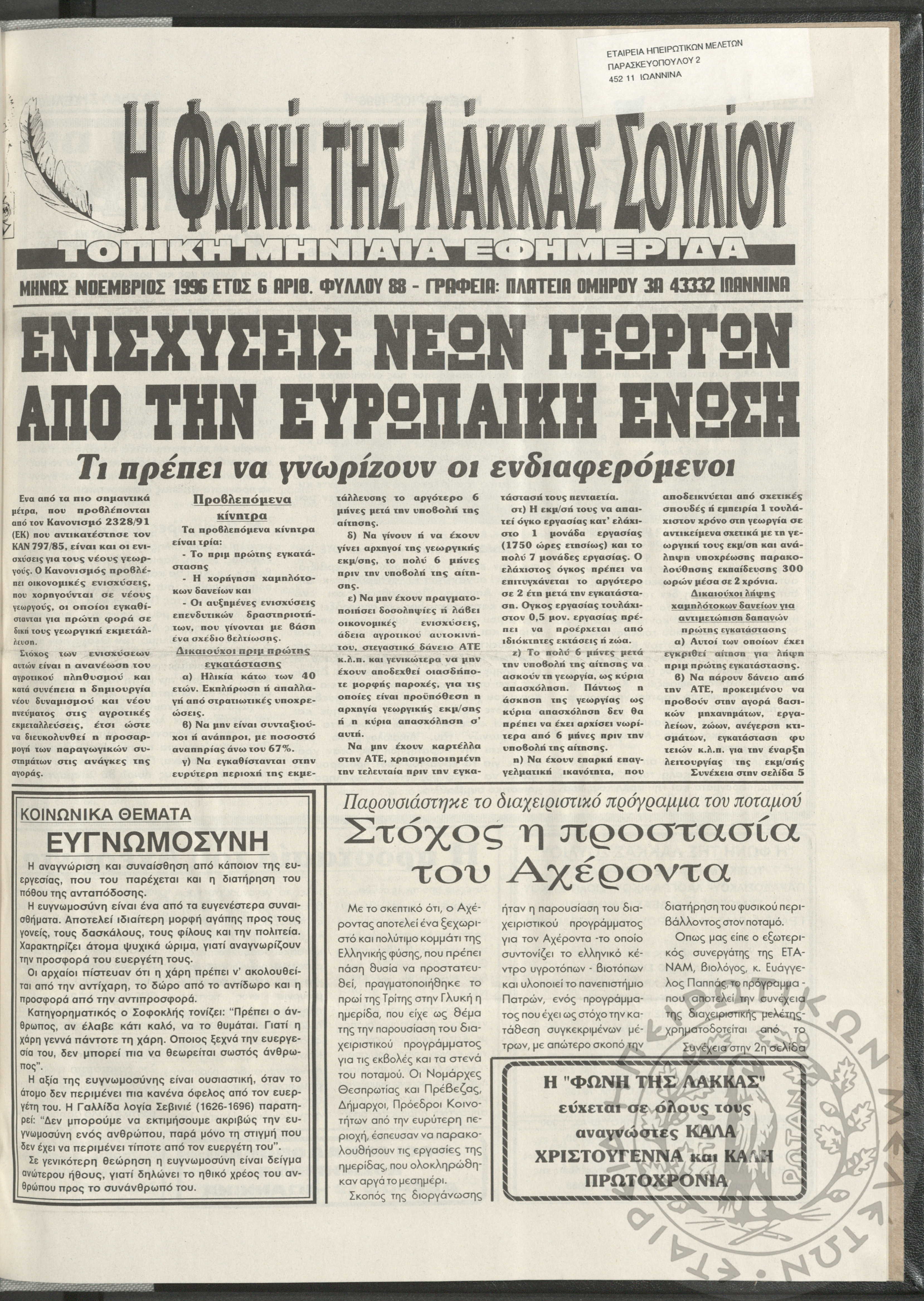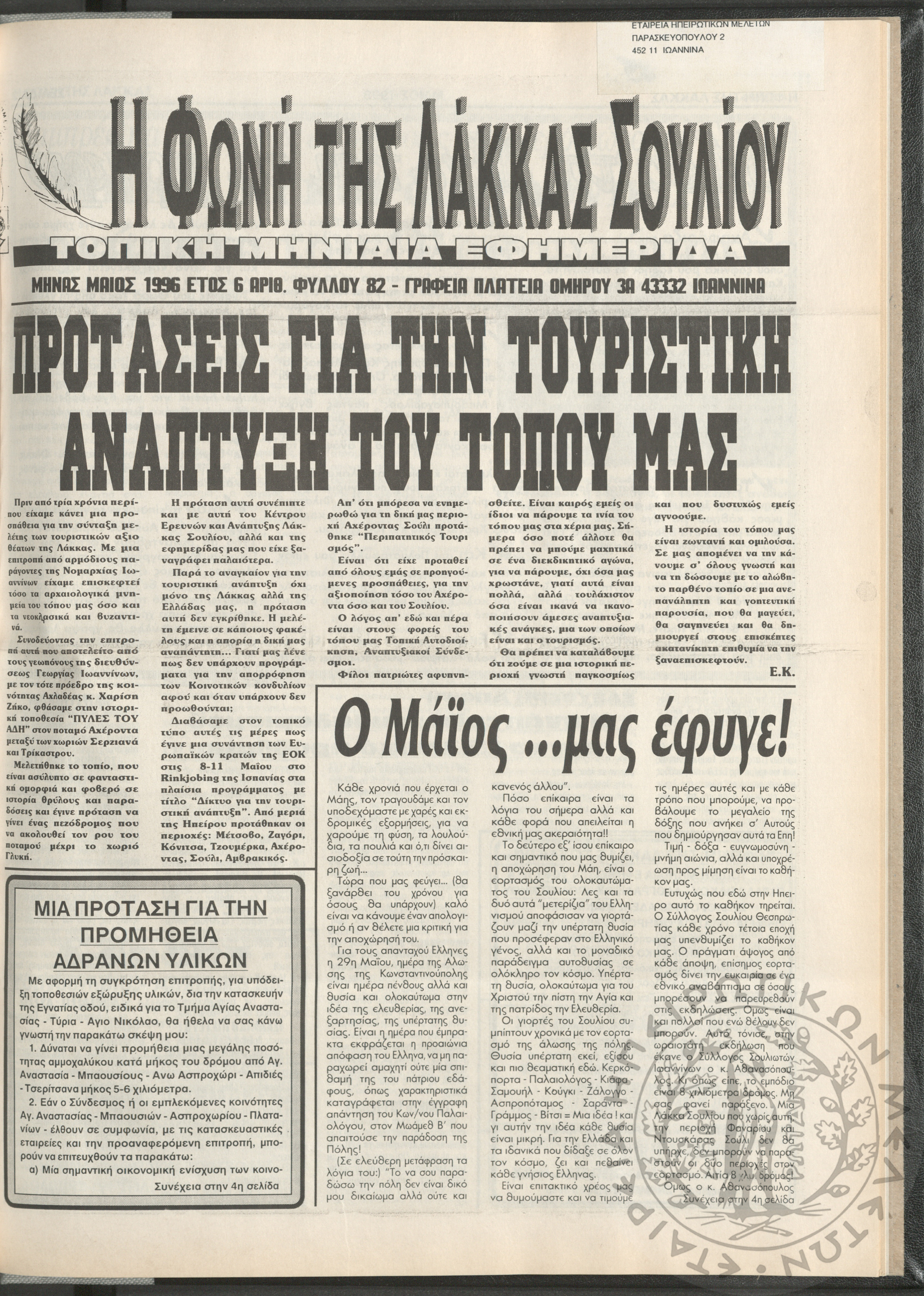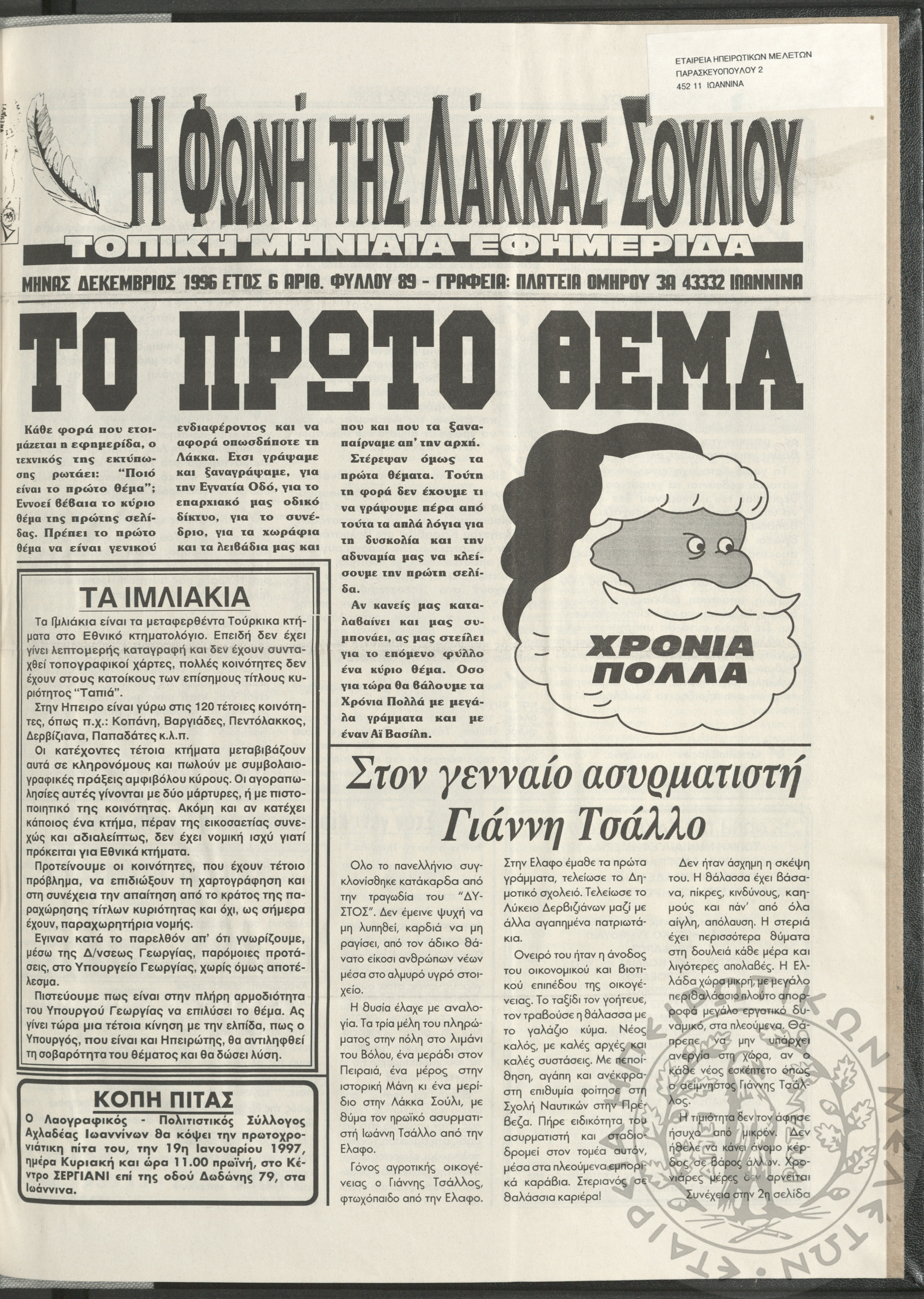 Η φωνή της Λάκκας Σουλίου: τοπική μηνιαία εφημερίδα-δημοσιογραφικό όργανο του Λαογραφικού Πολιτιστικού Συλλόγου Αχλαδέας, 1995, φ. 72Έτος 6ο, αρ. φ. 72...