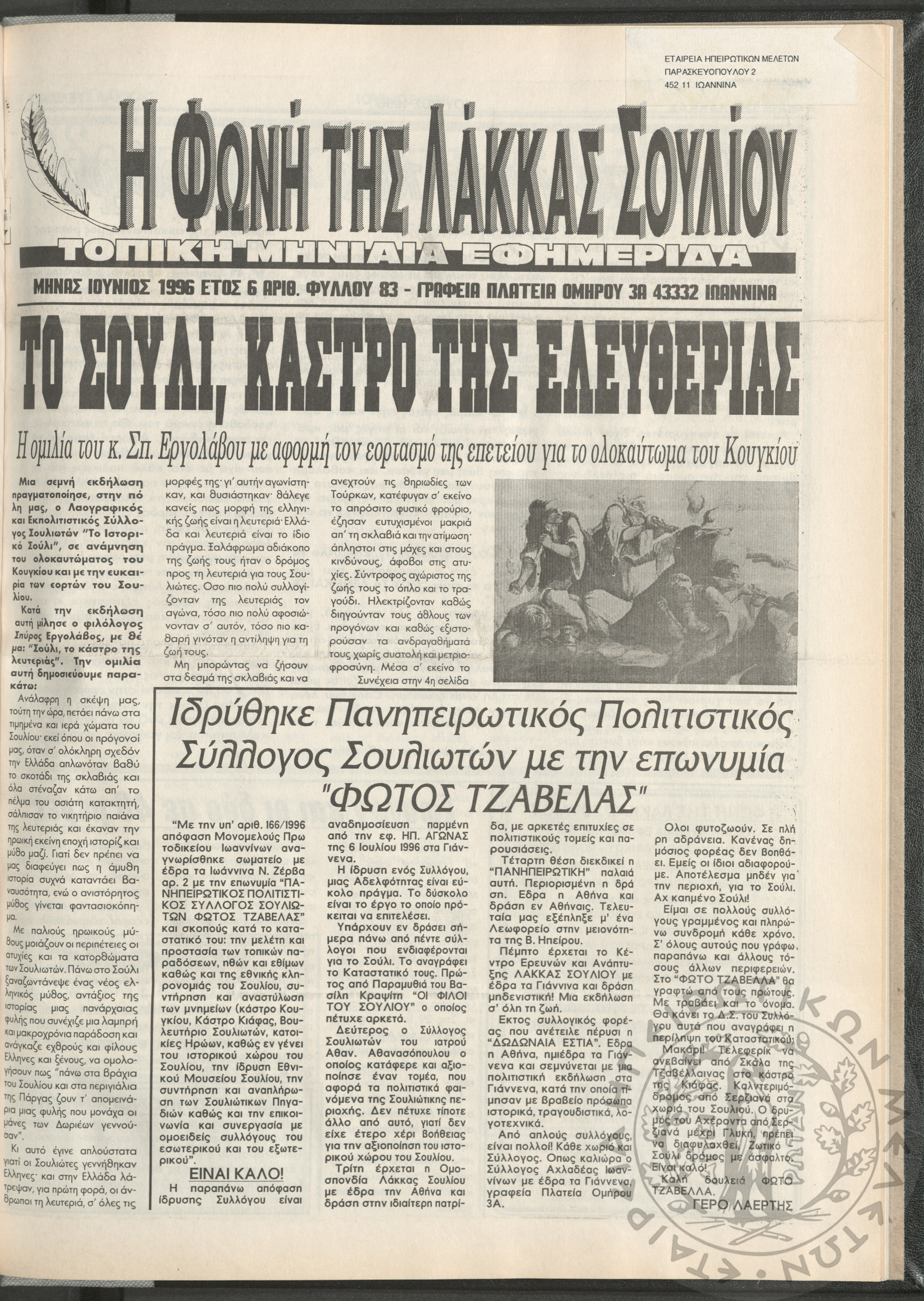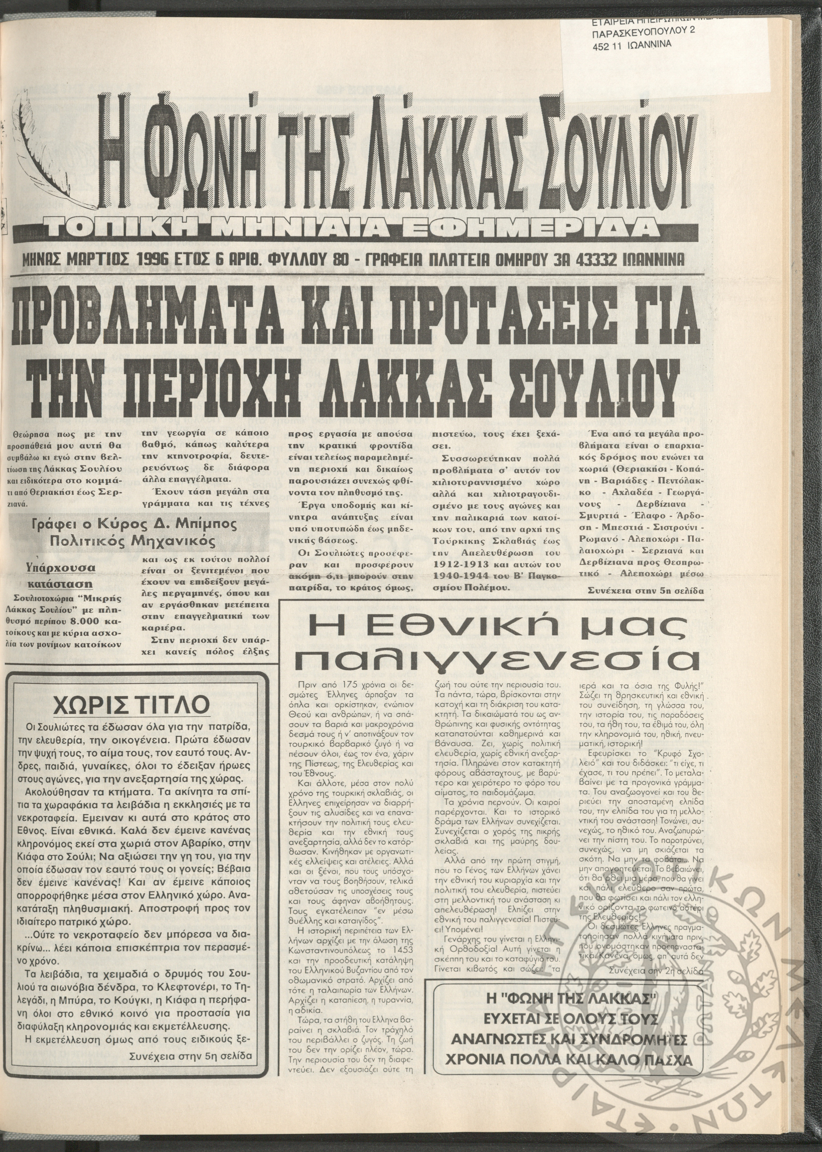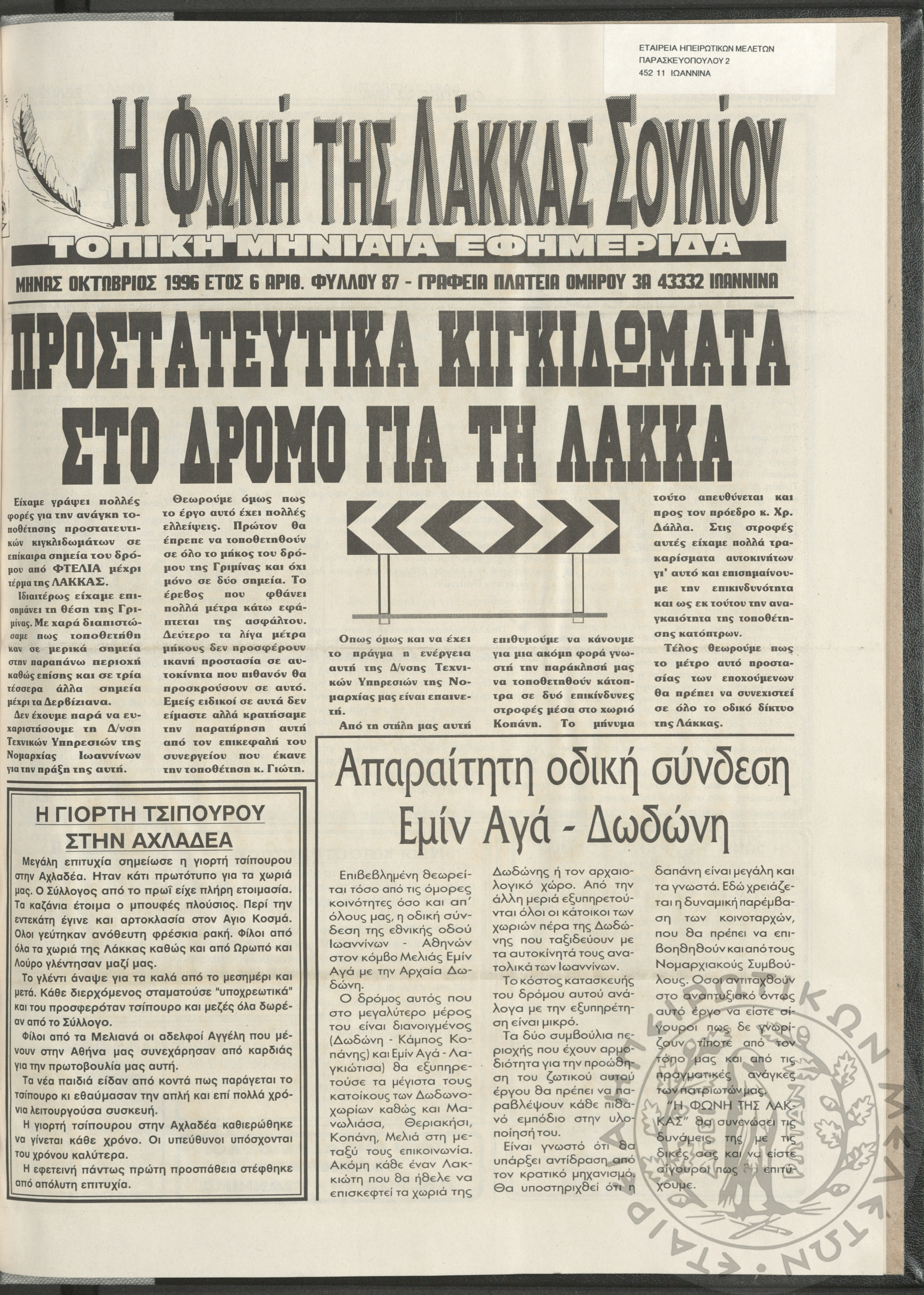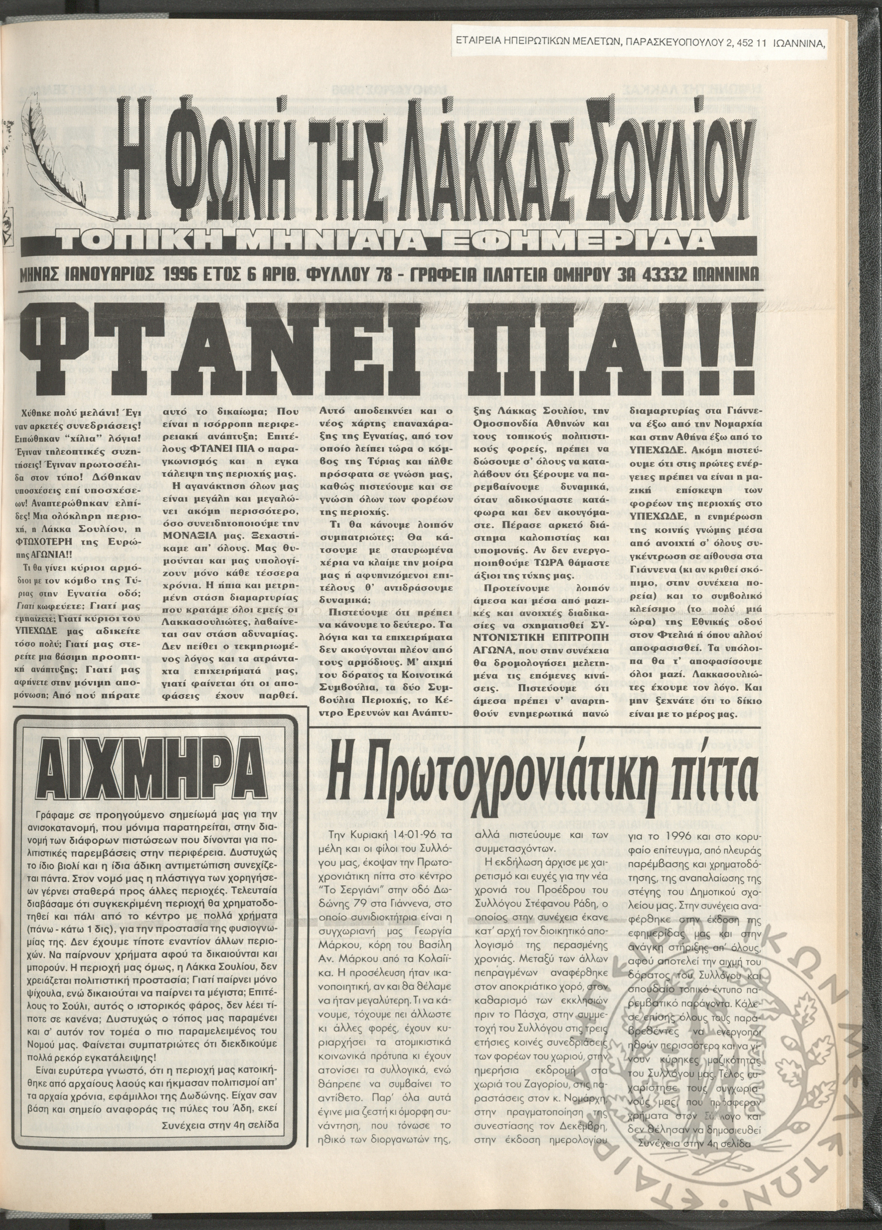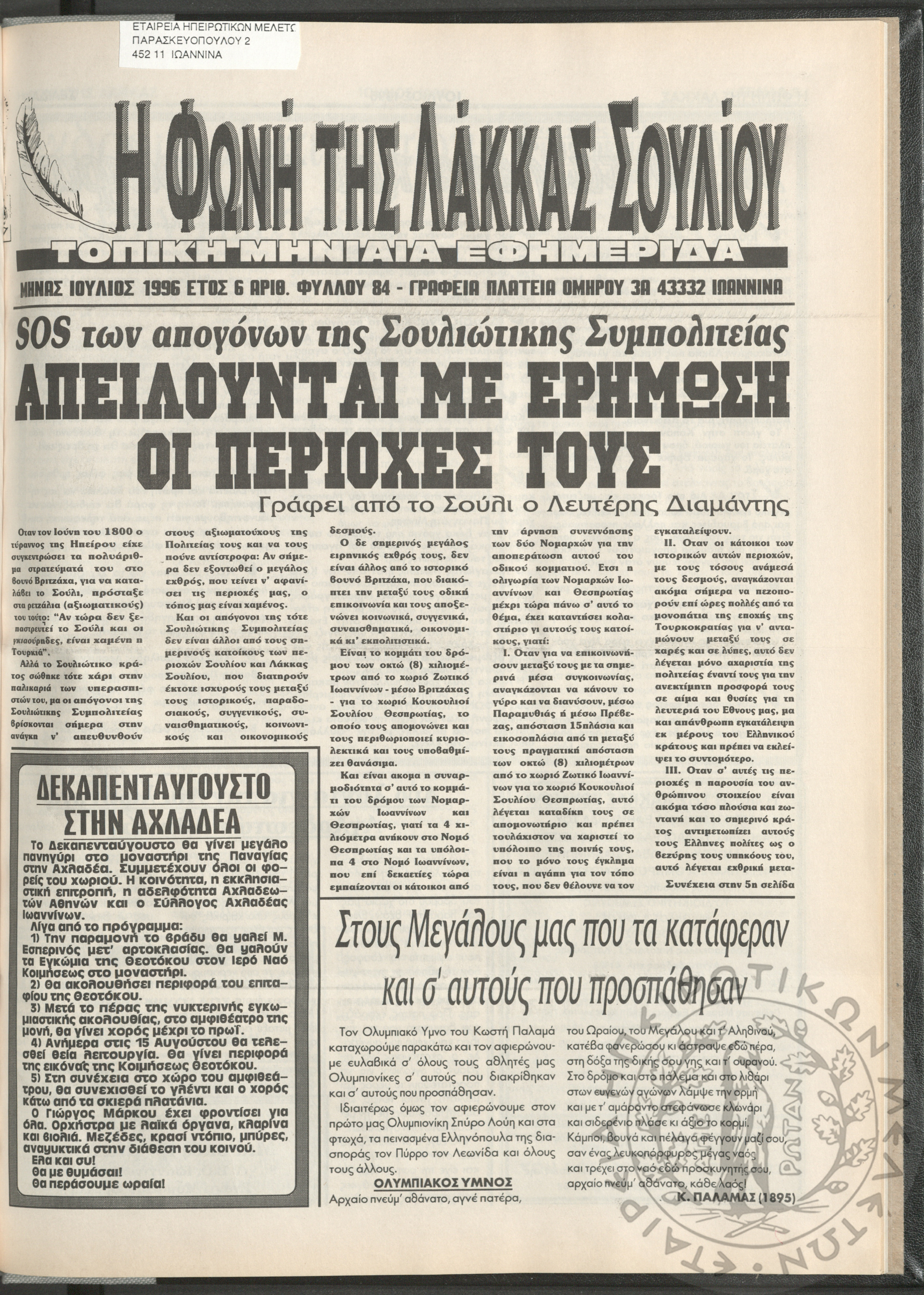Η φωνή της Λάκκας Σουλίου: τοπική μηνιαία εφημερίδα-δημοσιογραφικό όργανο του Λαογραφικού Πολιτιστικού Συλλόγου Αχλαδέας, 1995, φ. 70Έτος 6ο, αρ. φ. 70...