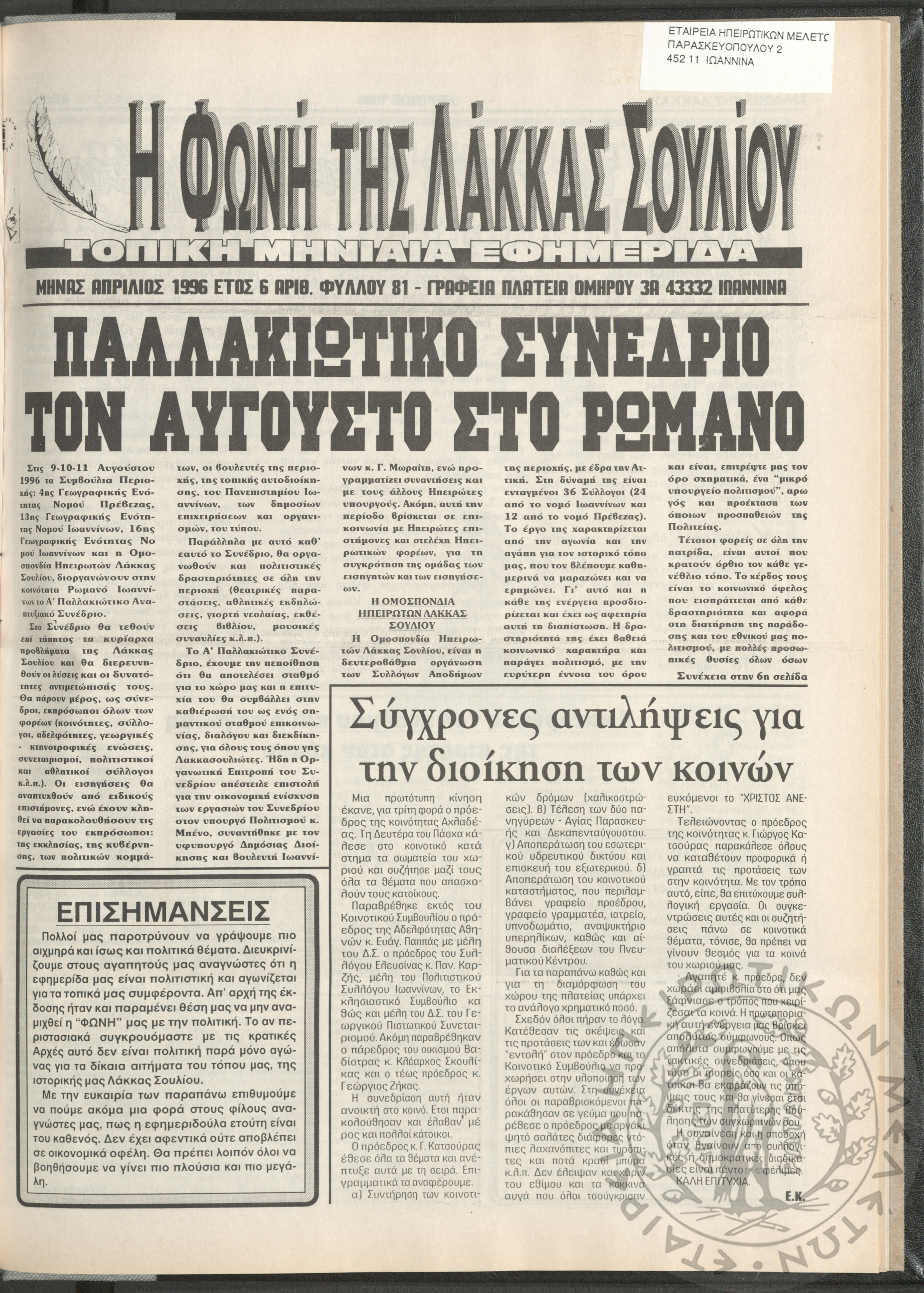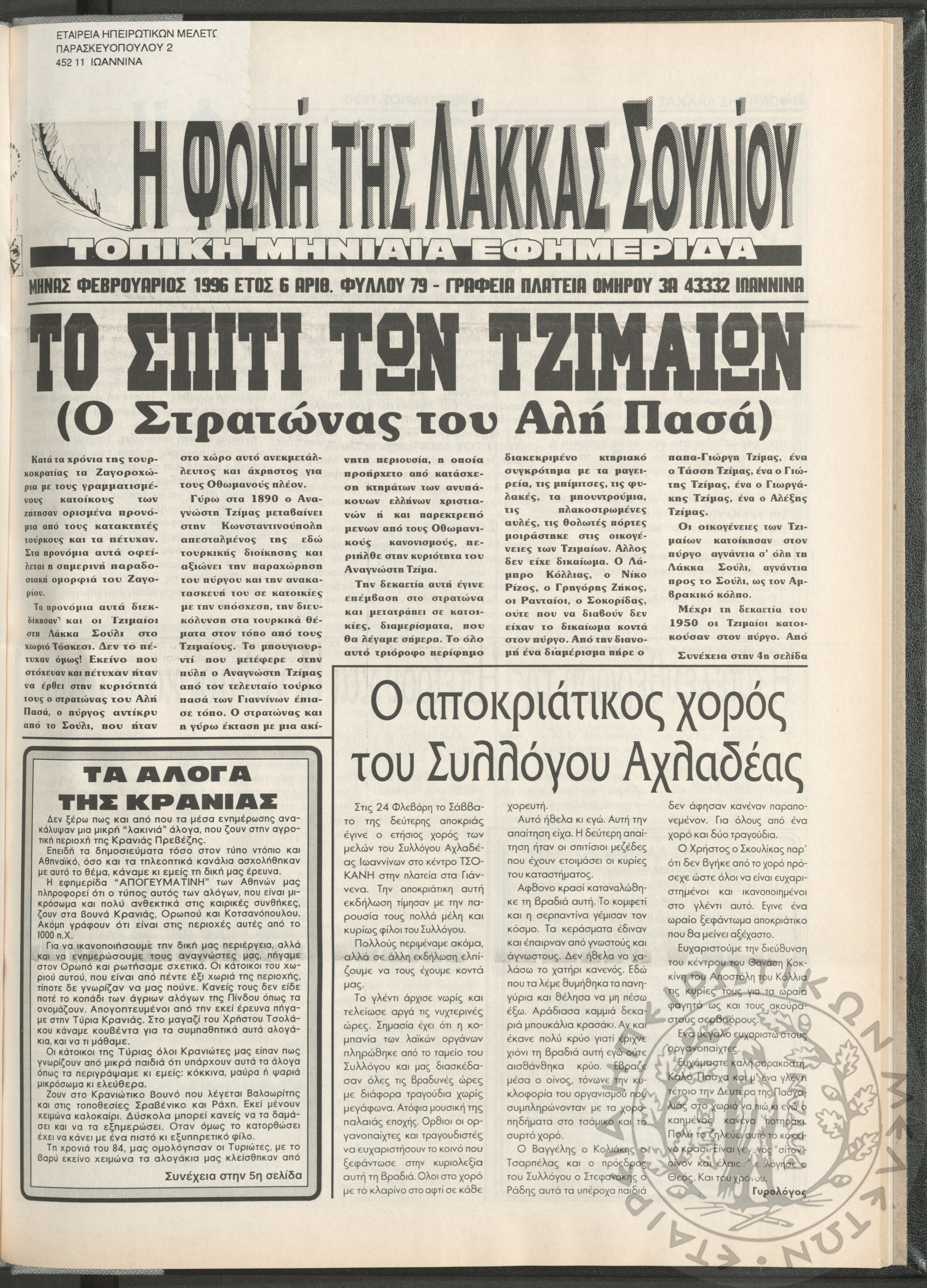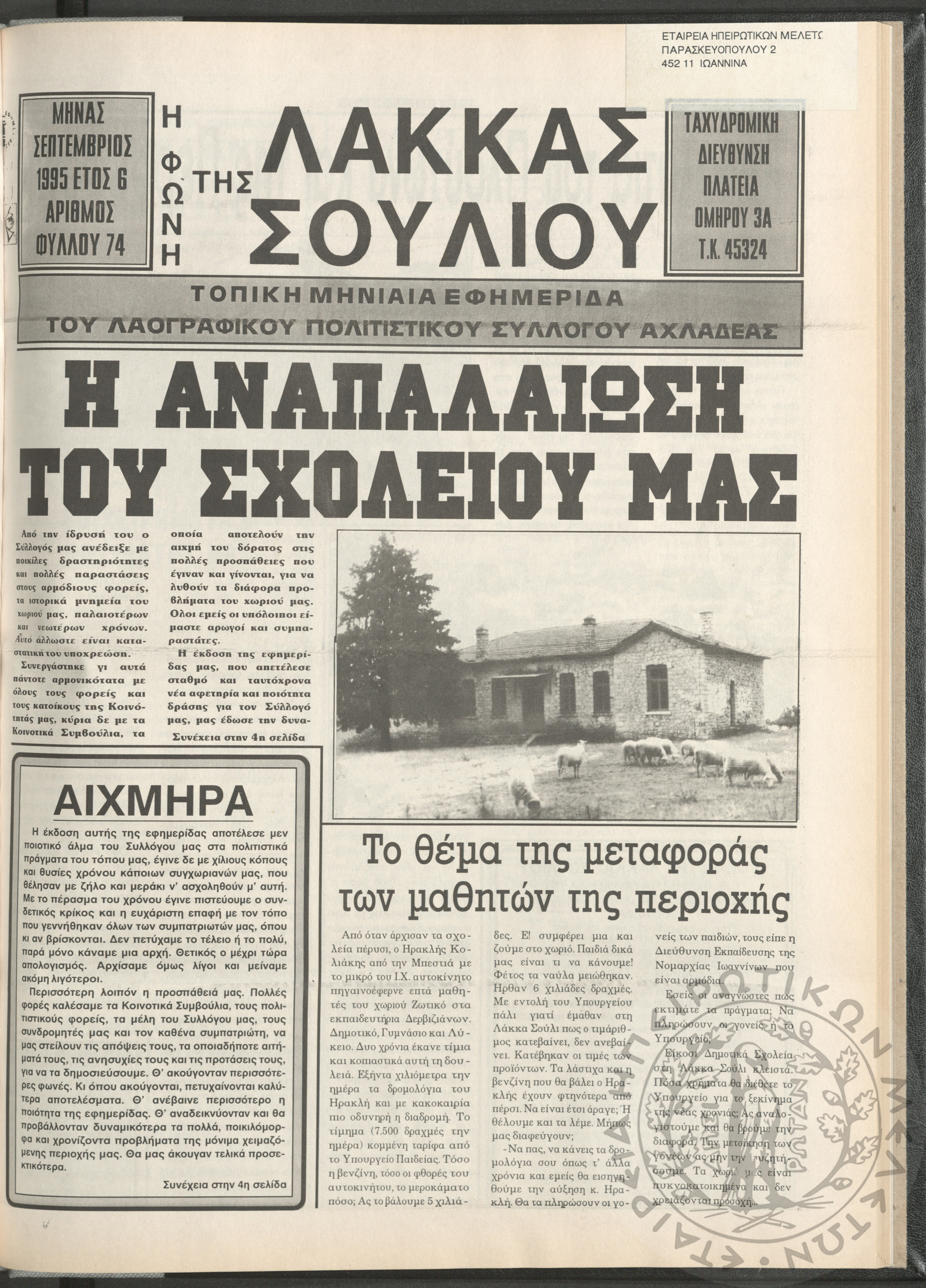 Η φωνή της Λάκκας Σουλίου: τοπική μηνιαία εφημερίδα-δημοσιογραφικό όργανο του Λαογραφικού Πολιτιστικού Συλλόγου Αχλαδέας, 1995, φ. 74Έτος 6ο, αρ. φ. 74...