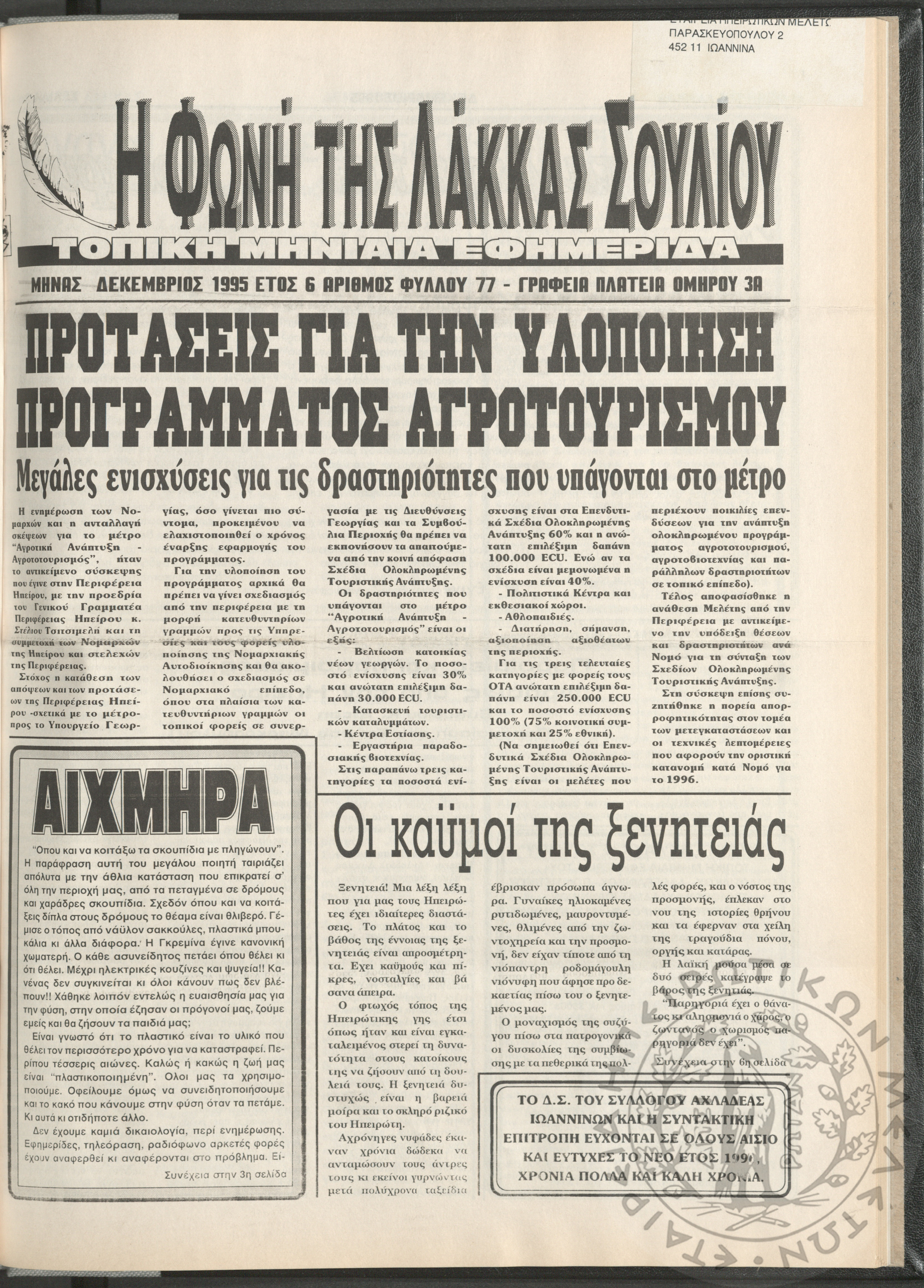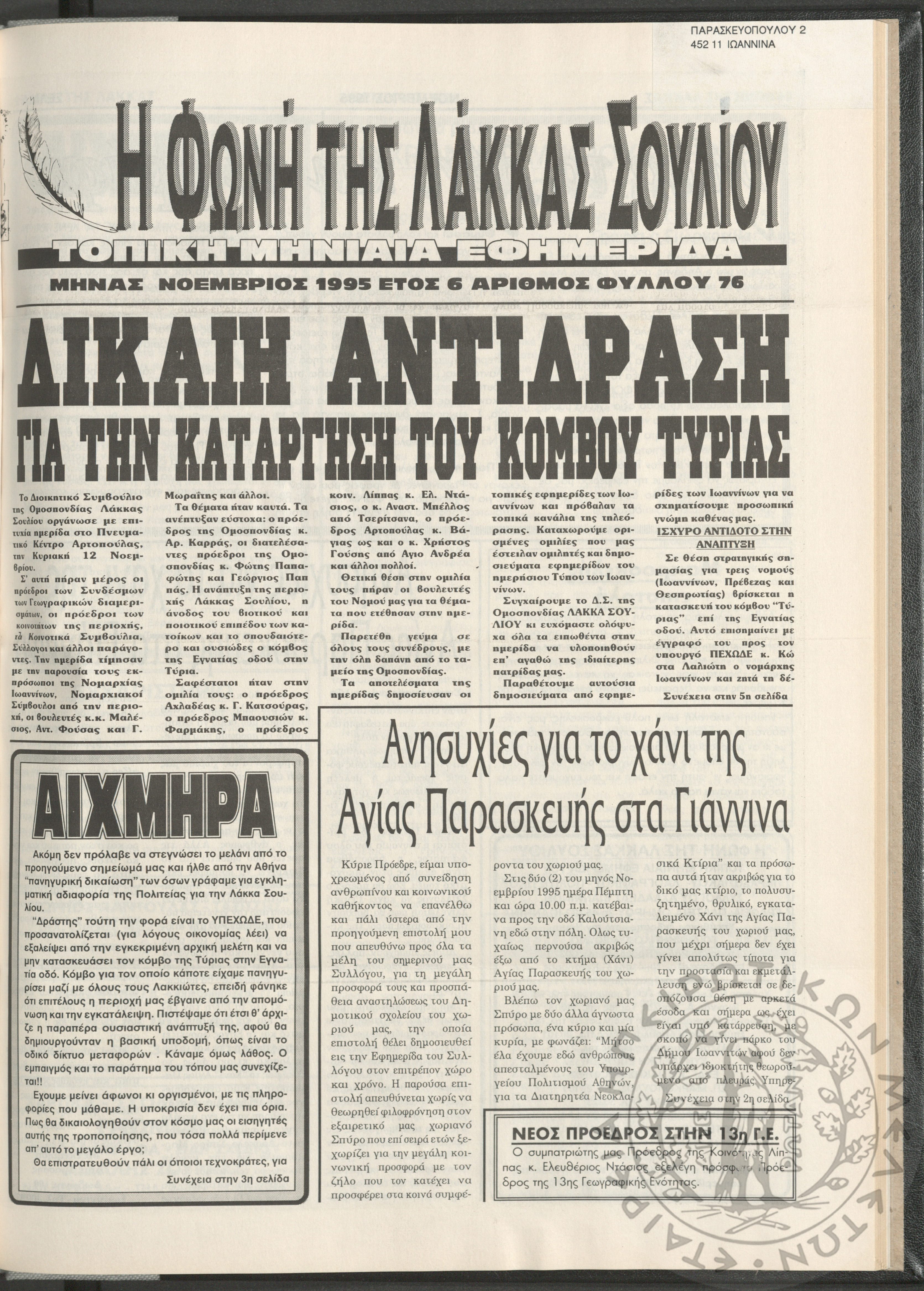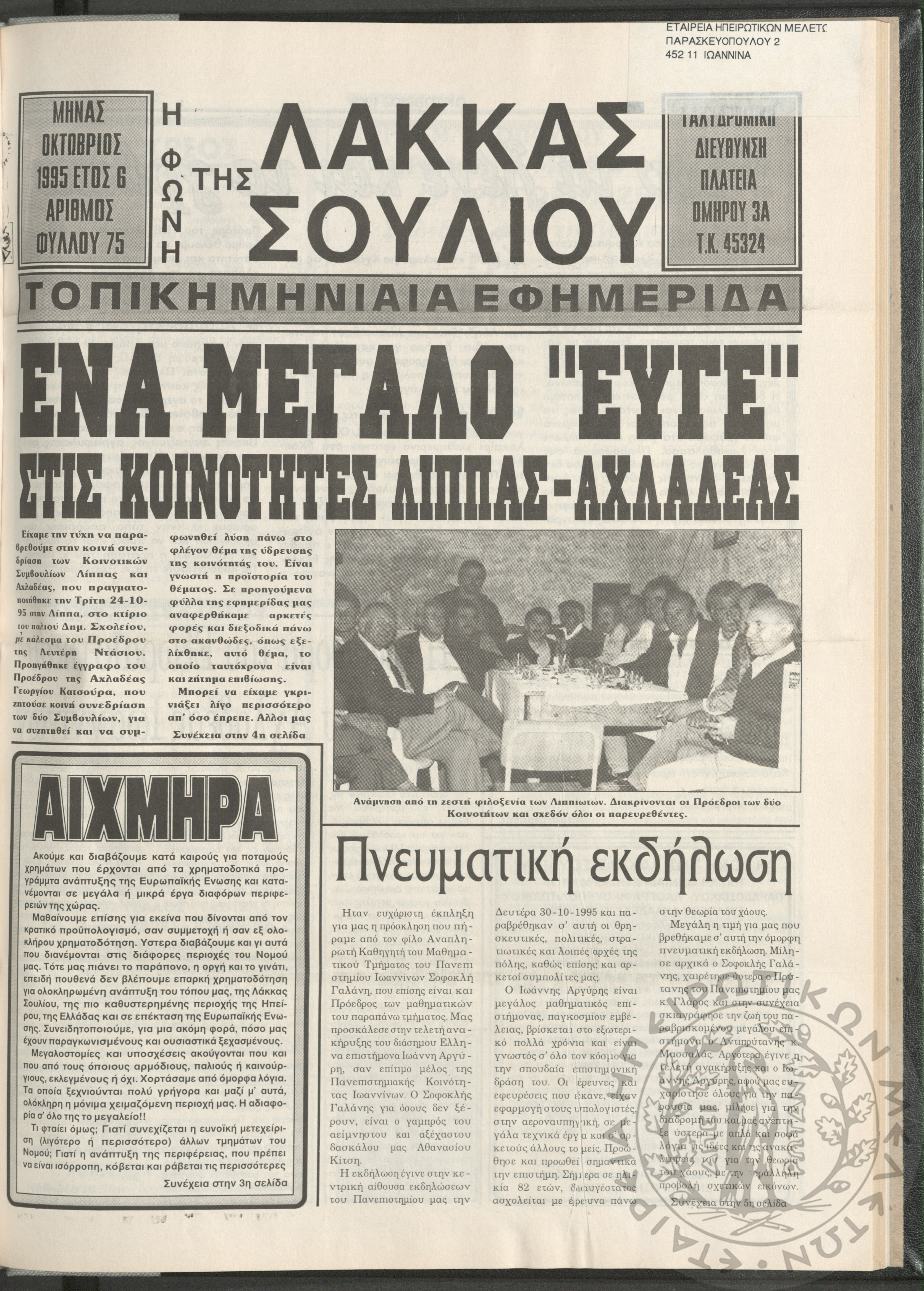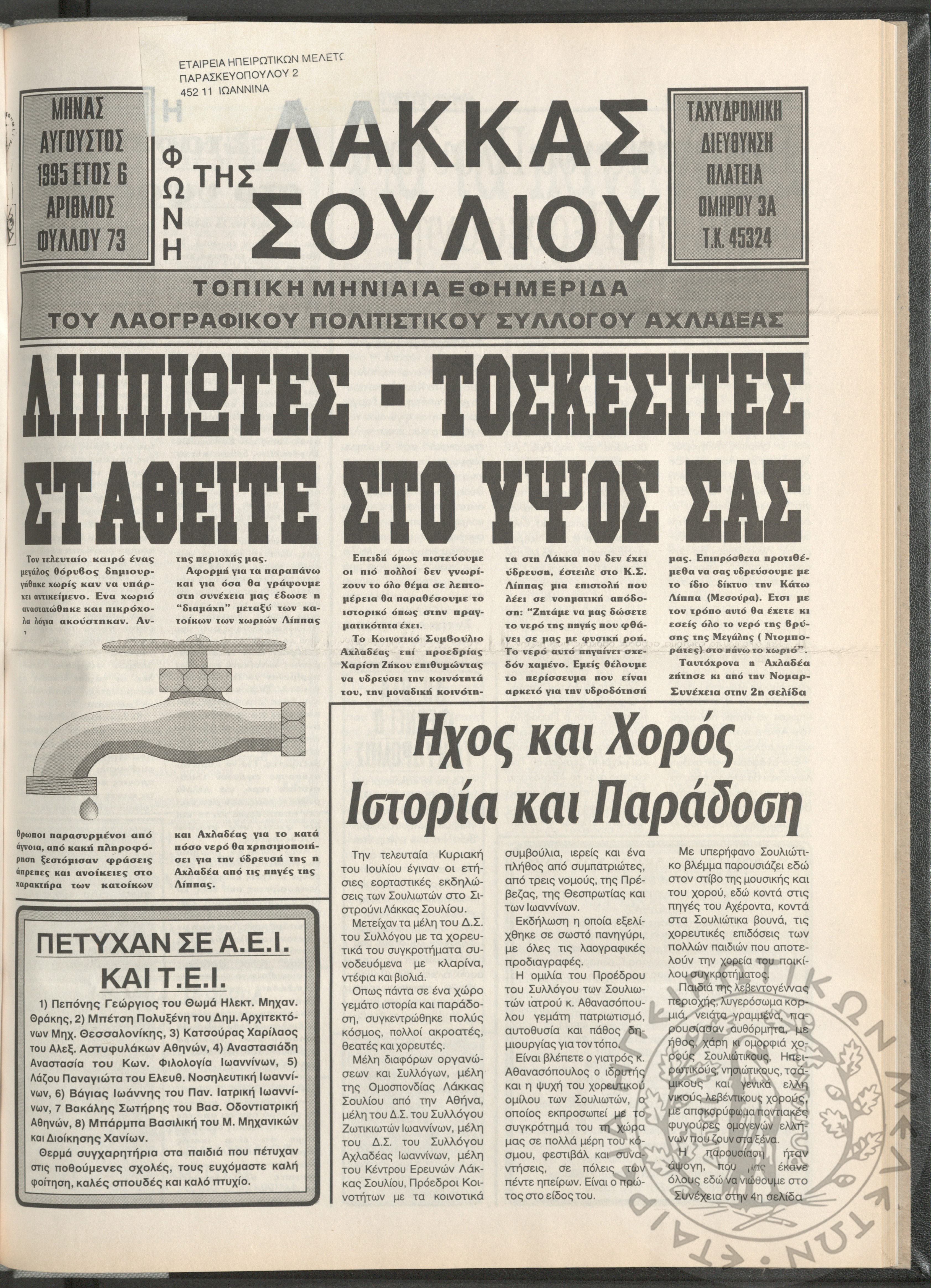 Η φωνή της Λάκκας Σουλίου: τοπική μηνιαία εφημερίδα-δημοσιογραφικό όργανο του Λαογραφικού Πολιτιστικού Συλλόγου Αχλαδέας, 1995, φ. 73Έτος 6ο, αρ. φ. 73...