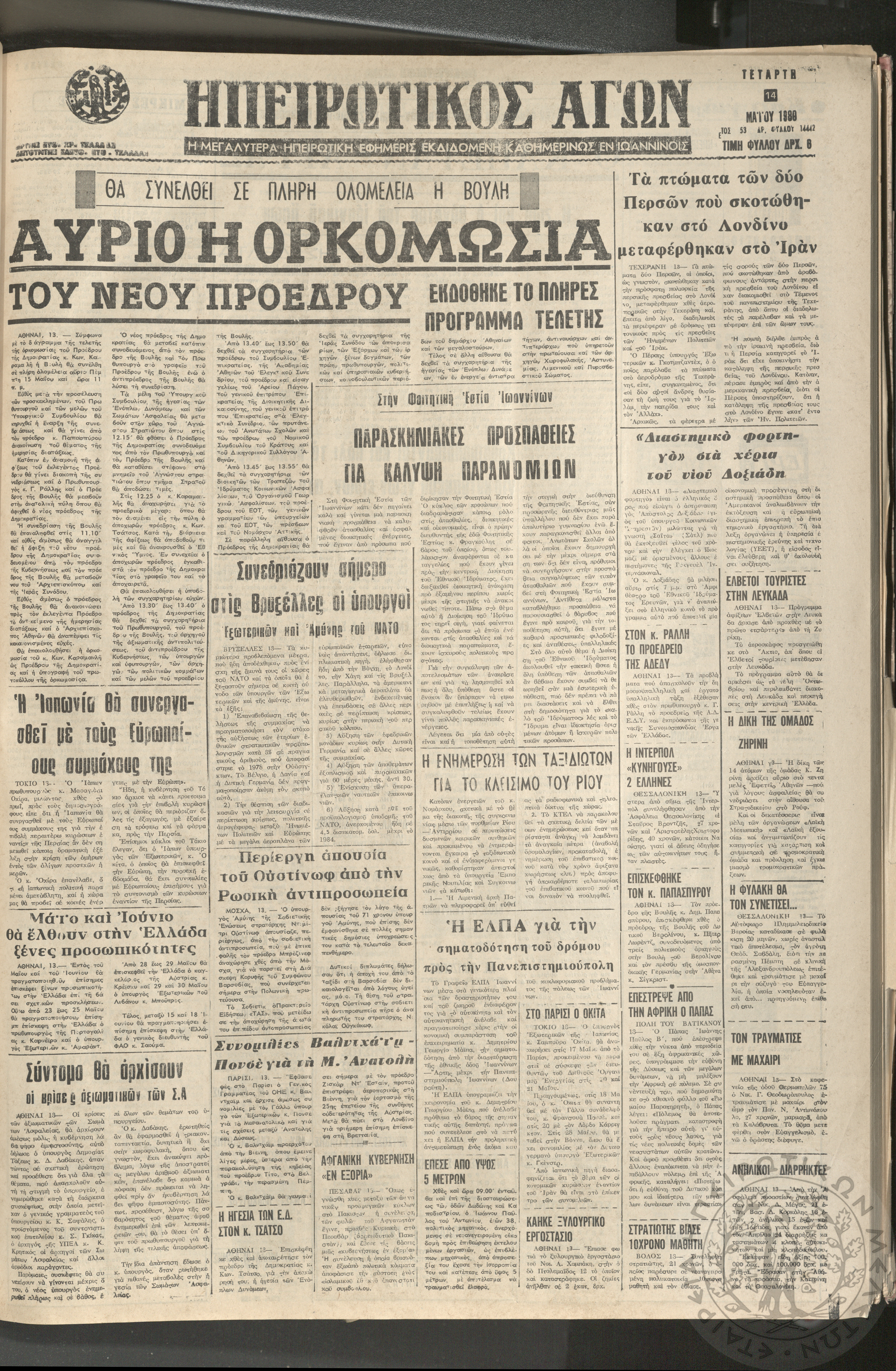 Ηπειρωτικός Αγών: η μεγαλυτέρα Ηπειρωτική εφημερίς εκδιδόμενη καθημερινώς εν Ιωαννίνοις, 1980, φ. 14439Έτος 53, φ. 14439...