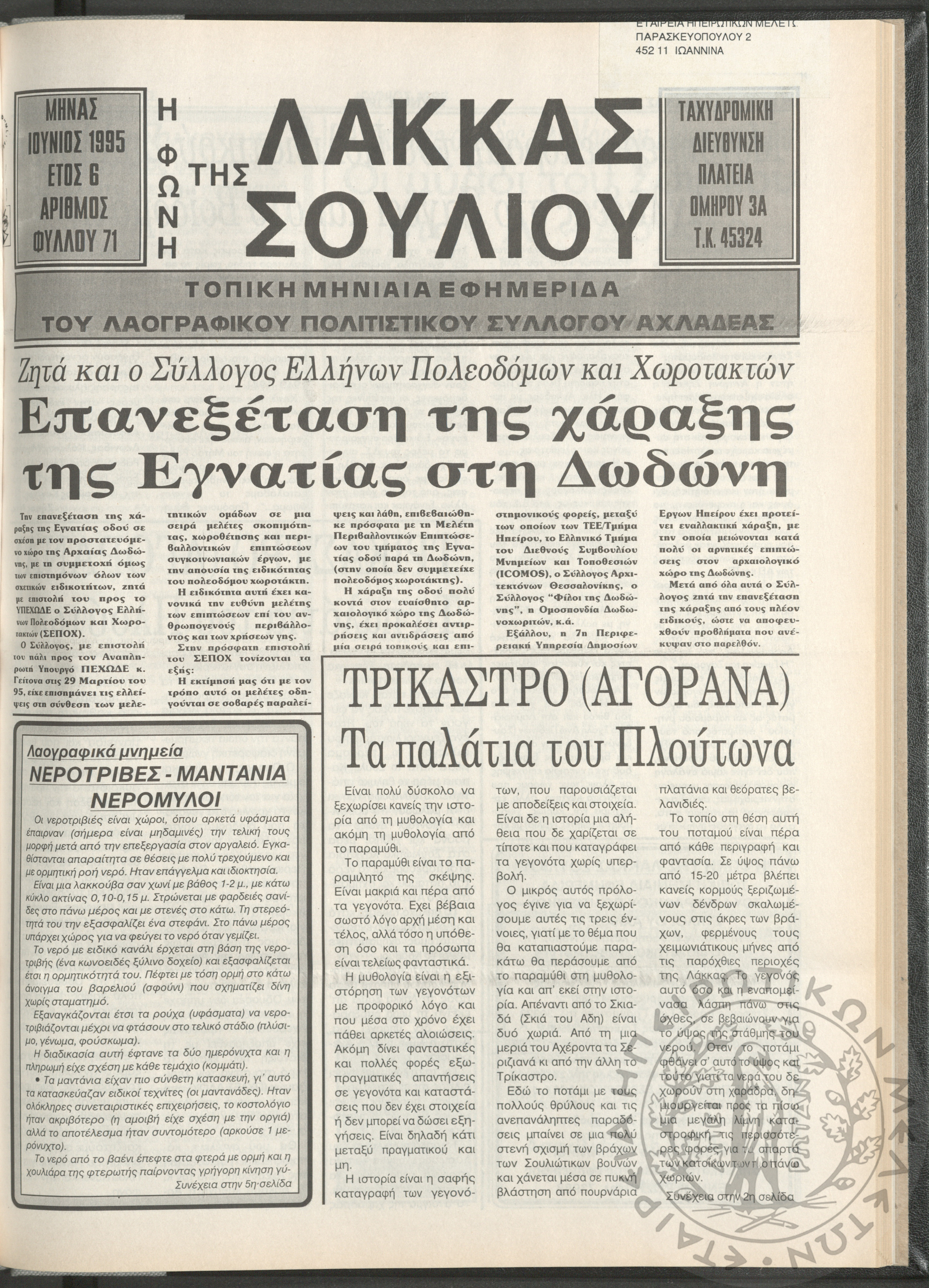 Η φωνή της Λάκκας Σουλίου: τοπική μηνιαία εφημερίδα-δημοσιογραφικό όργανο του Λαογραφικού Πολιτιστικού Συλλόγου Αχλαδέας, 1995, φ. 71Έτος 6ο, αρ. φ. 71...