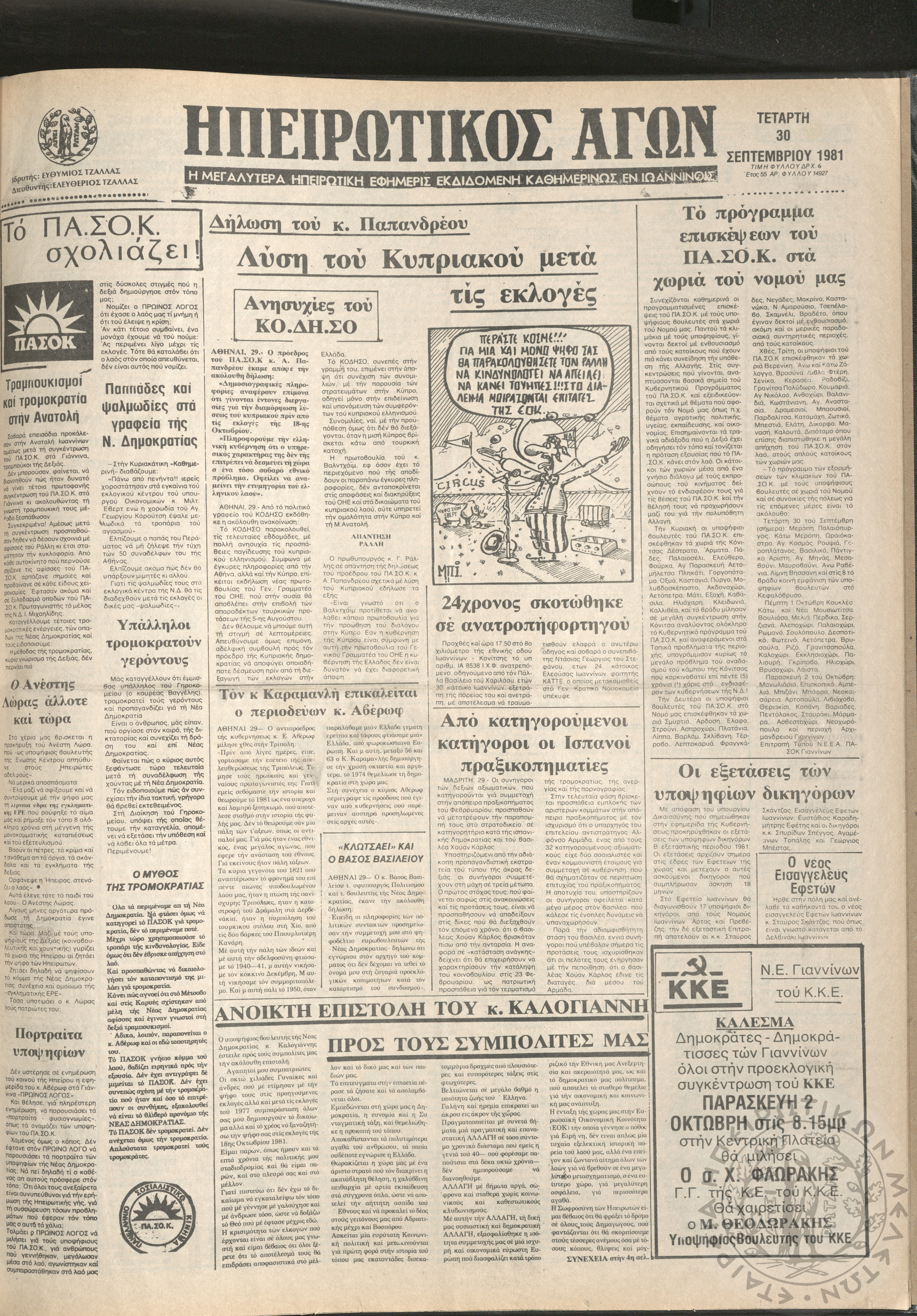 Ηπειρωτικός Αγών: η μεγαλυτέρα Ηπειρωτική εφημερίς εκδιδόμενη καθημερινώς εν Ιωαννίνοις, 1981, φ. 14930Έτος 55, φ. 14930...
