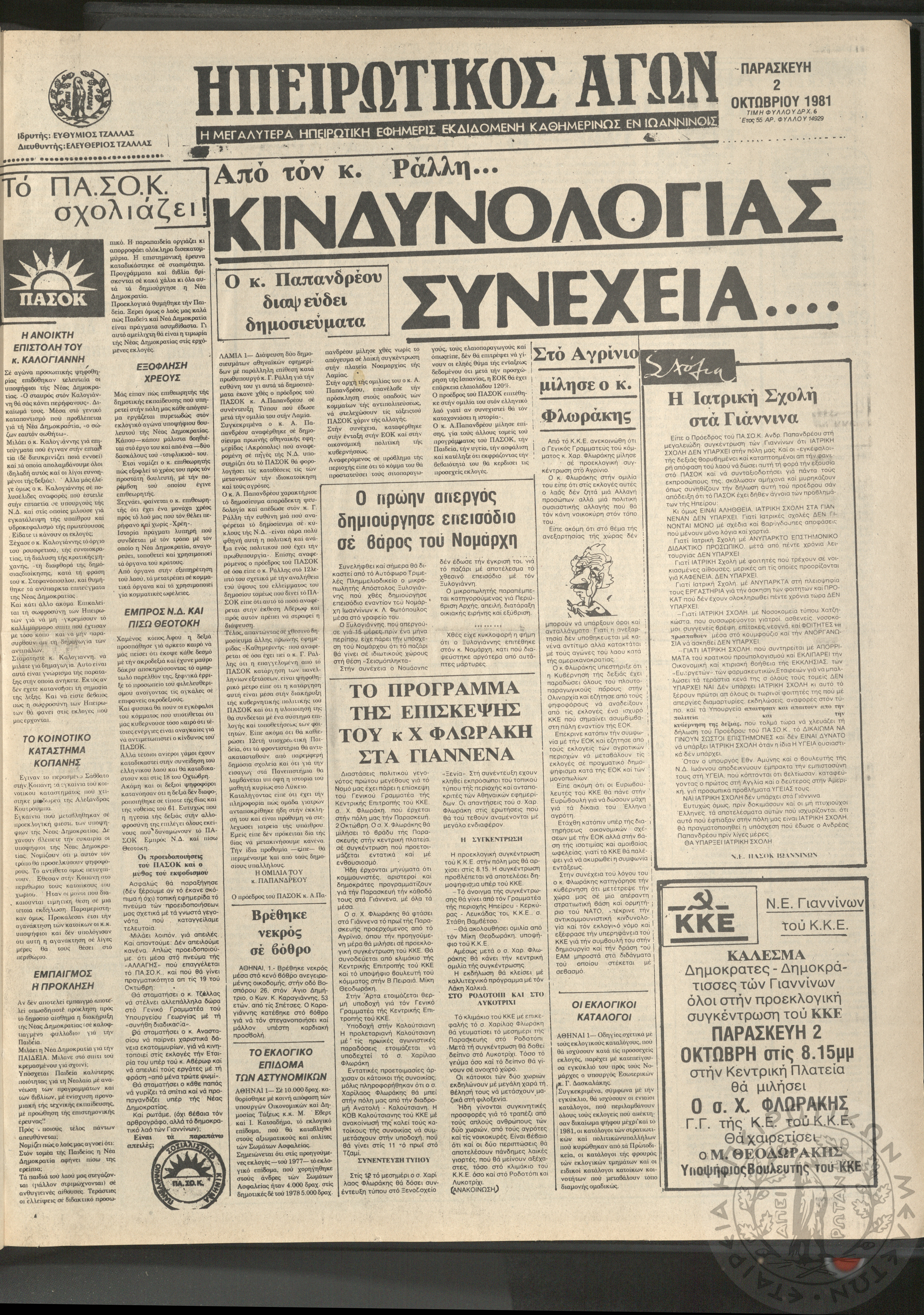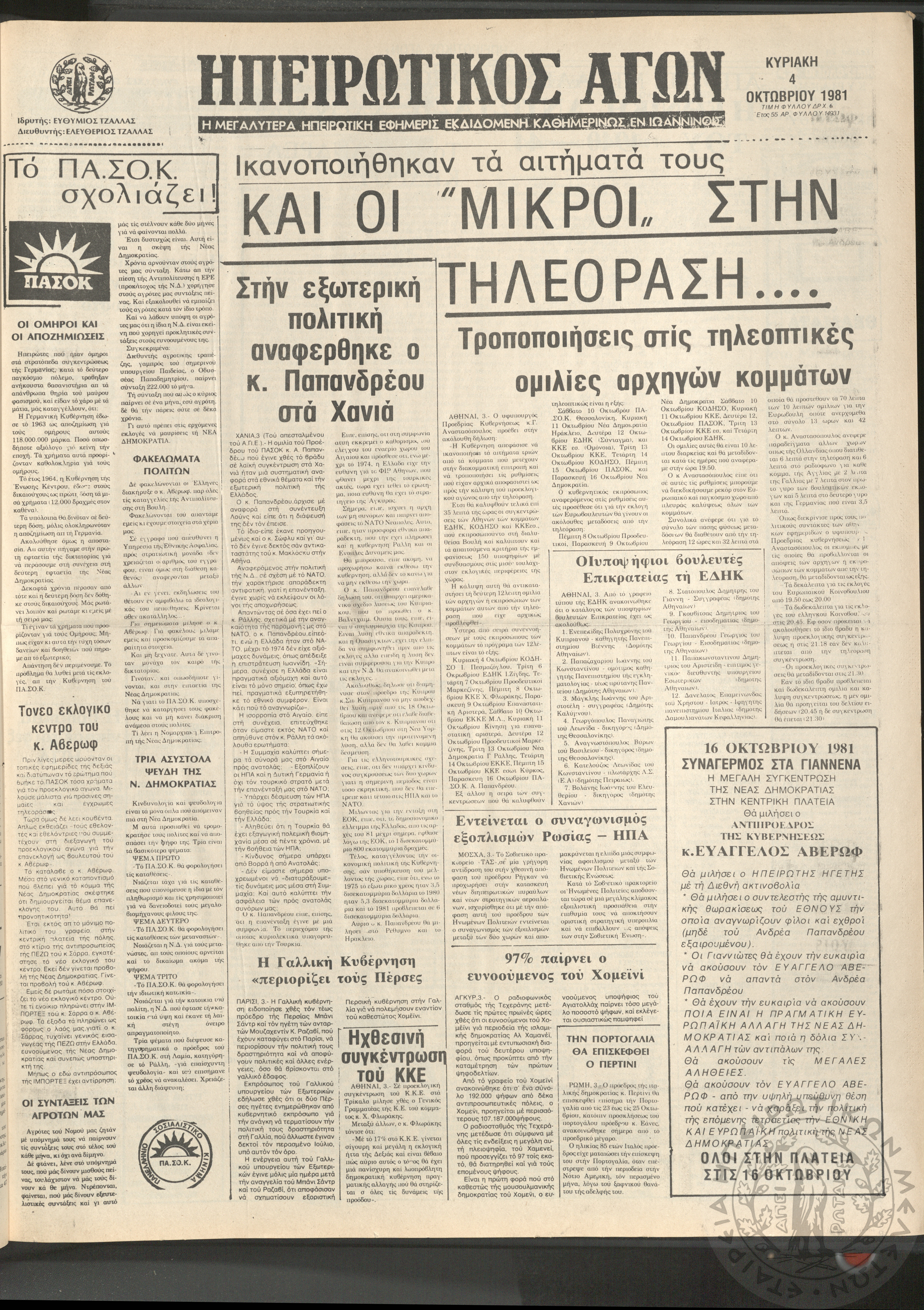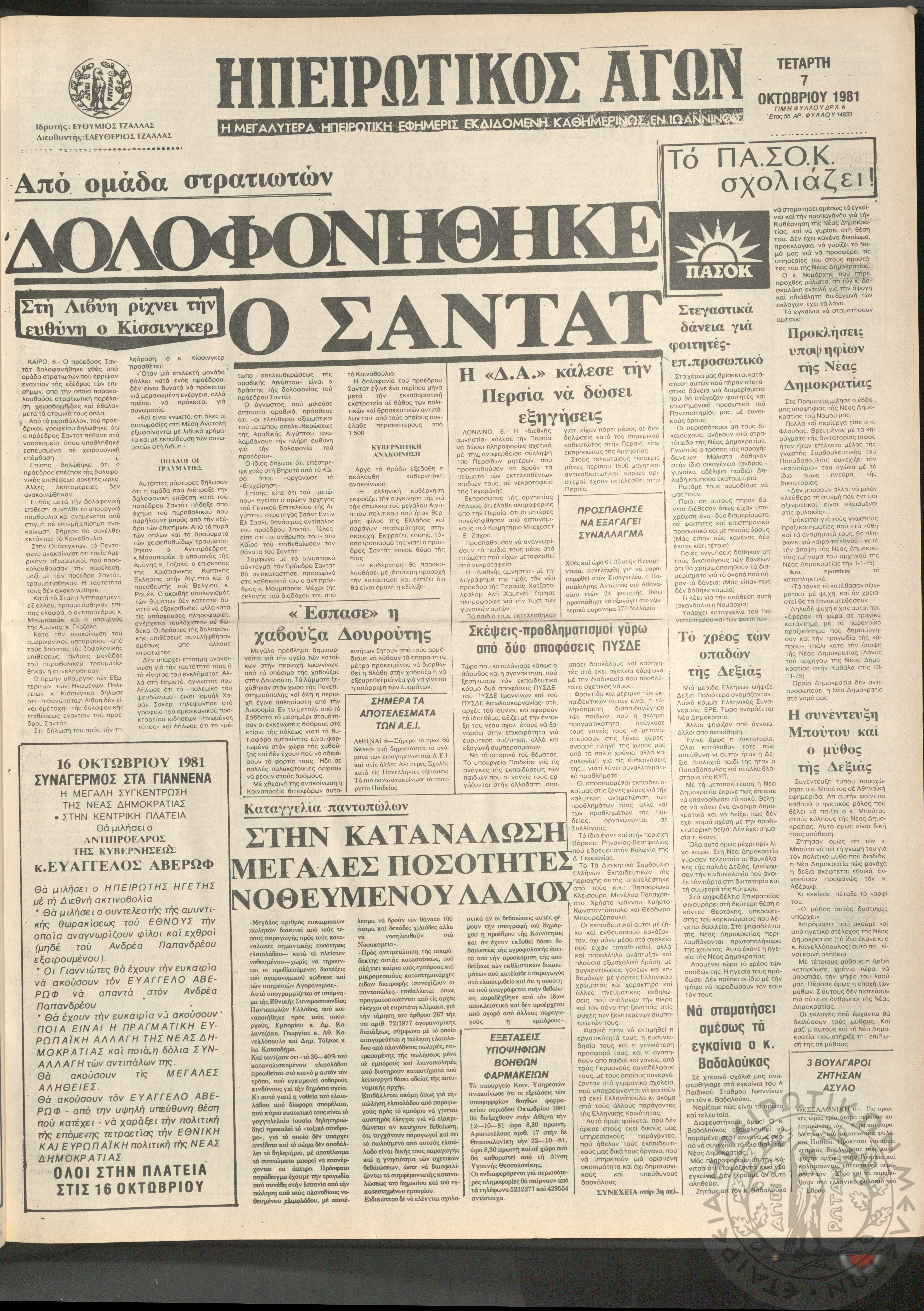 Ηπειρωτικός Αγών: η μεγαλυτέρα Ηπειρωτική εφημερίς εκδιδόμενη καθημερινώς εν Ιωαννίνοις, 1981, φ. 14923Έτος 55, φ. 14923...