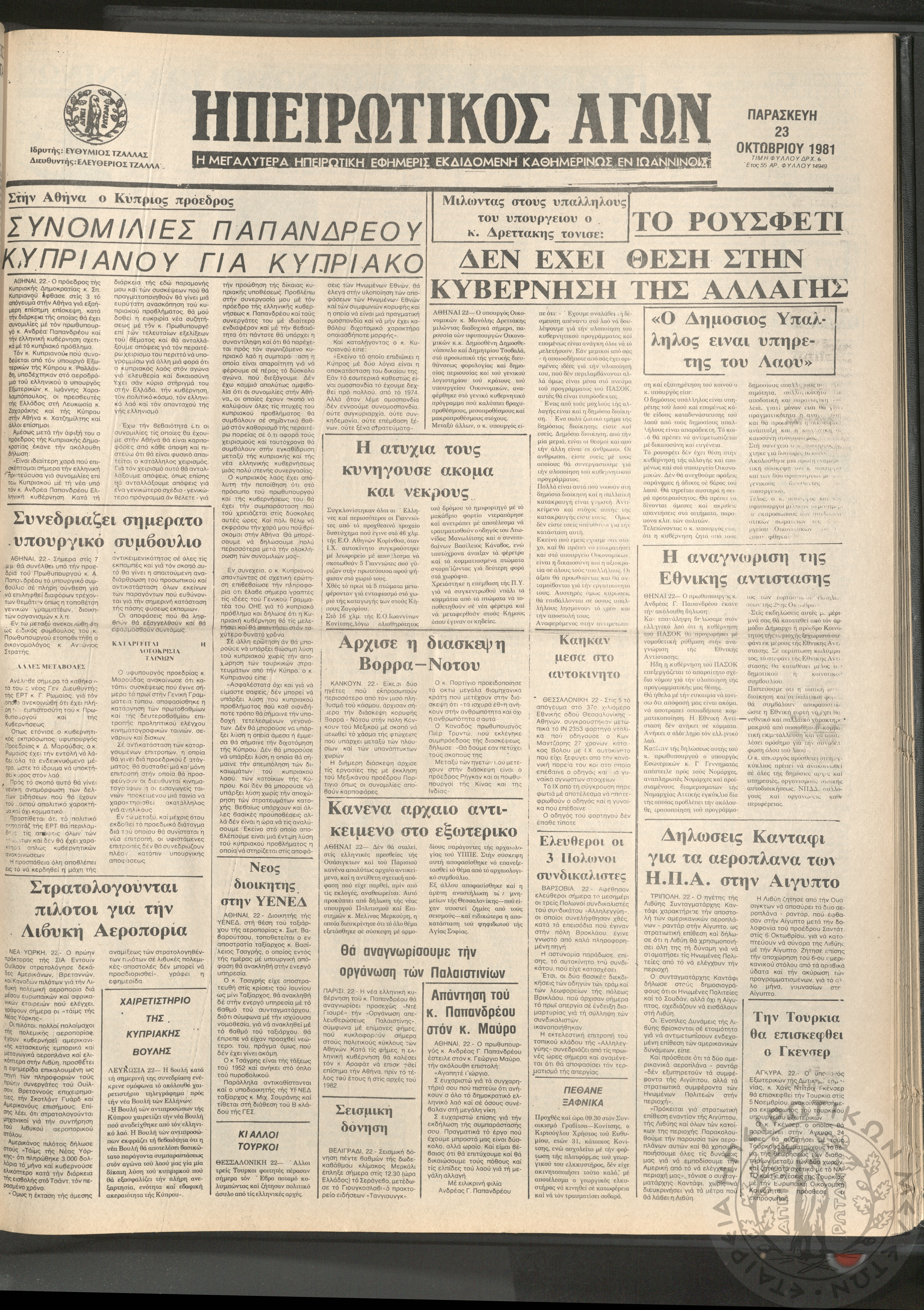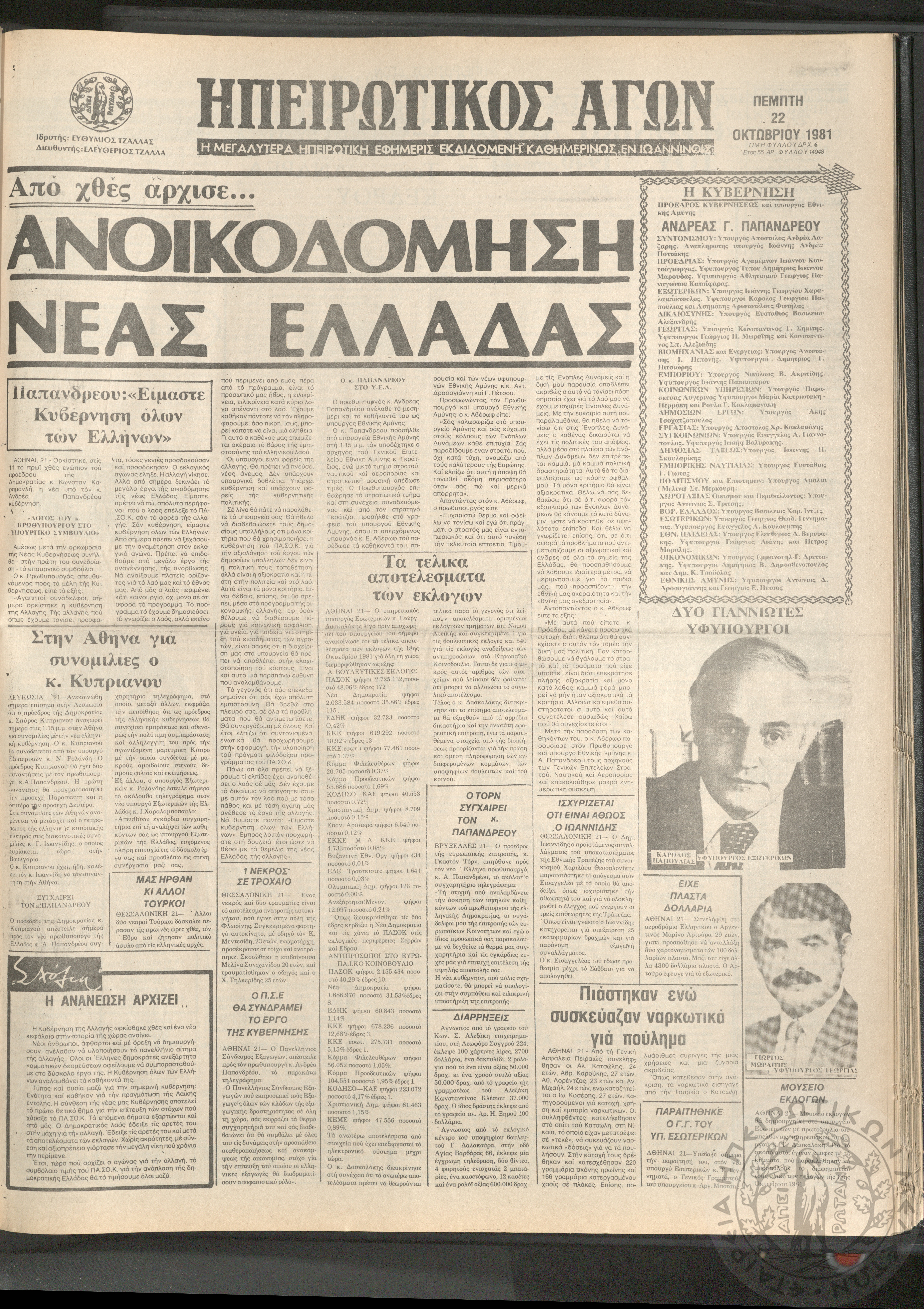 Ηπειρωτικός Αγών: η μεγαλυτέρα Ηπειρωτική εφημερίς εκδιδόμενη καθημερινώς εν Ιωαννίνοις, 1981, φ. 14949Έτος 55, φ. 14949...