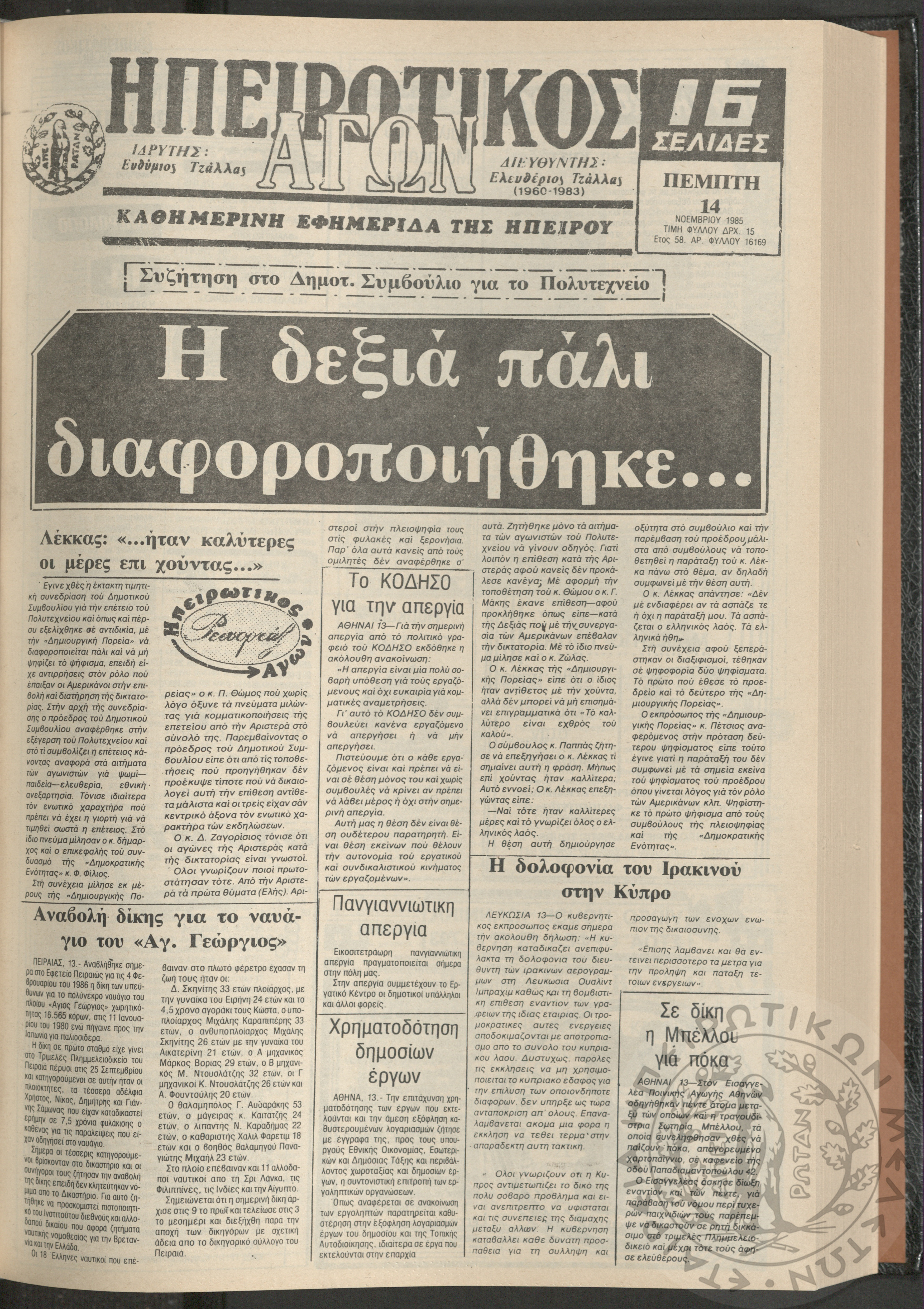 Ηπειρωτικός Αγών: καθημερινή εφημερίδα της Ηπείρου, 1985, φ. 16169