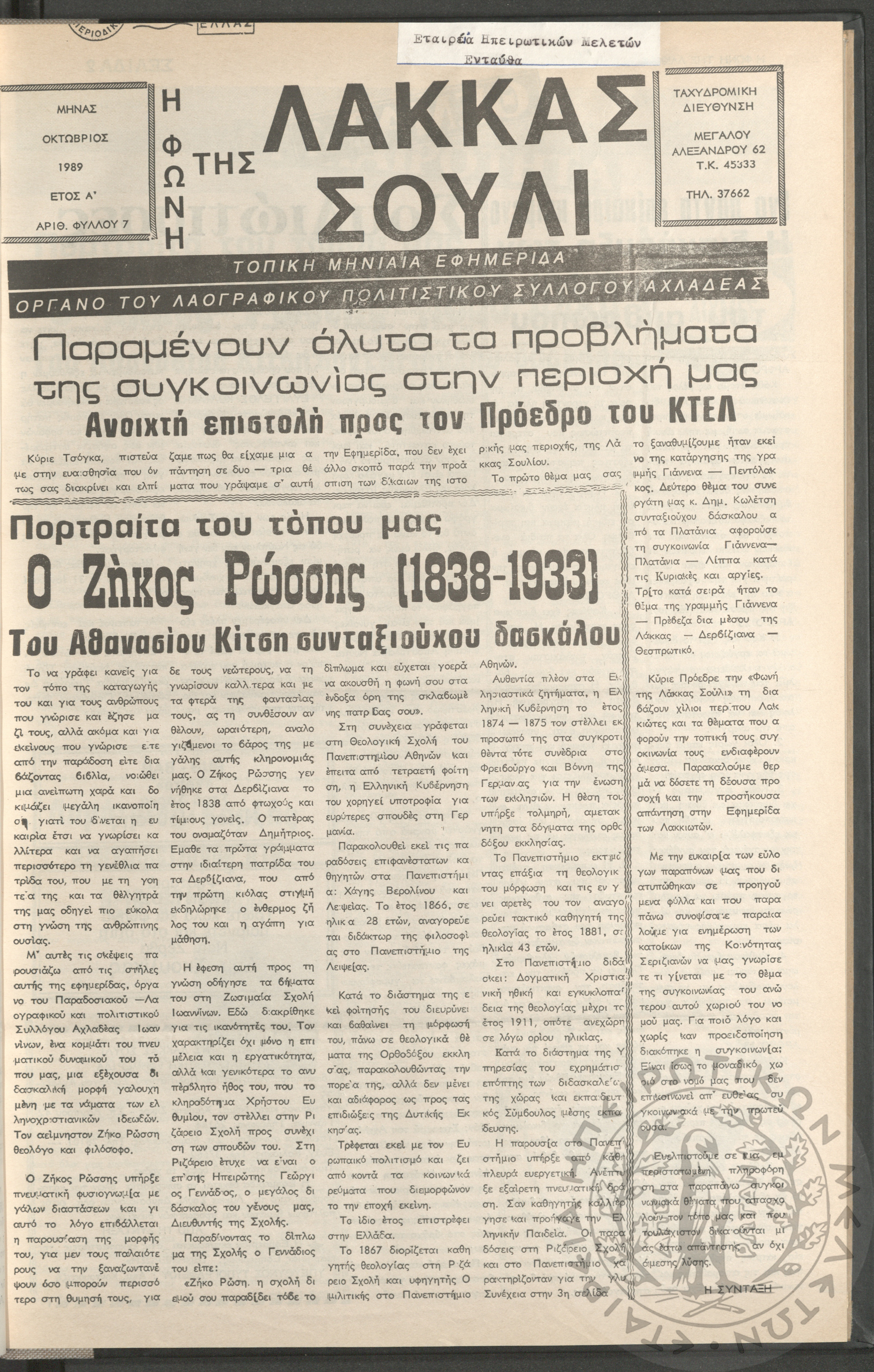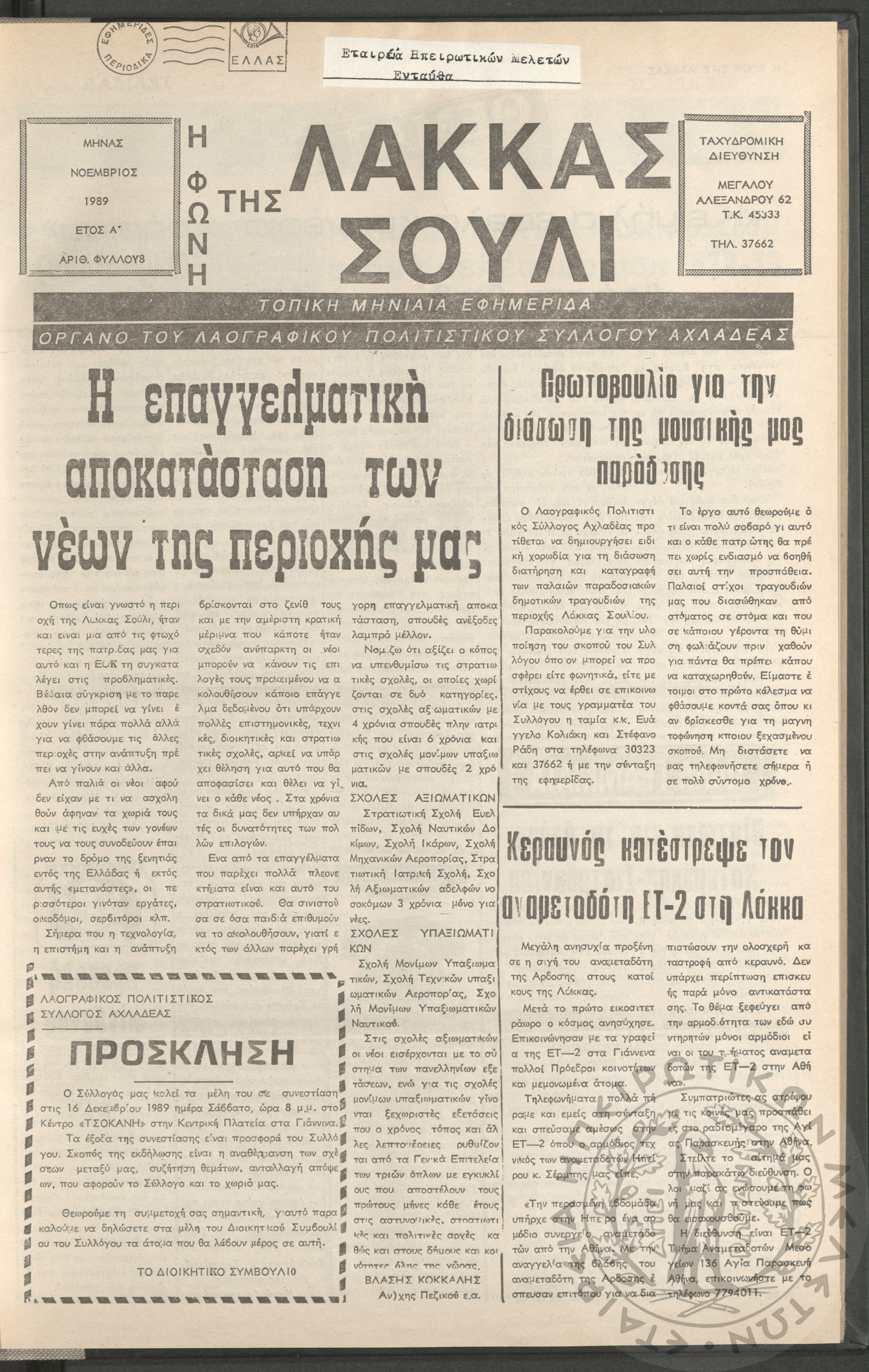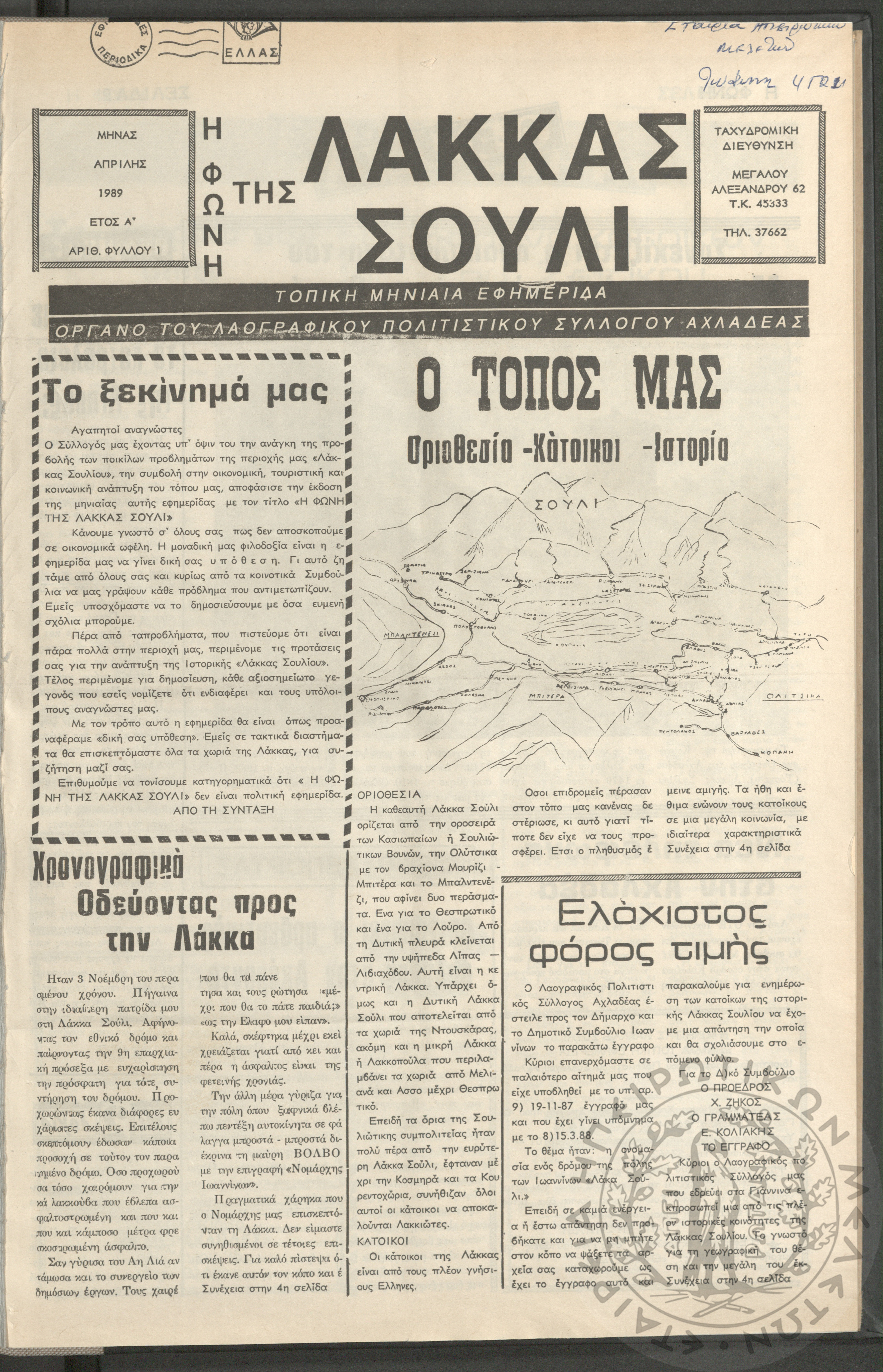 Η φωνή της Λάκκας Σούλι: τοπική μηνιαία εφημερίδα-Όργανο του Λαογραφικού Πολιτιστικού Συλλόγου Αχλαδέας, 1989, φ. 1Έτος Α΄, αρ. φ. 1...