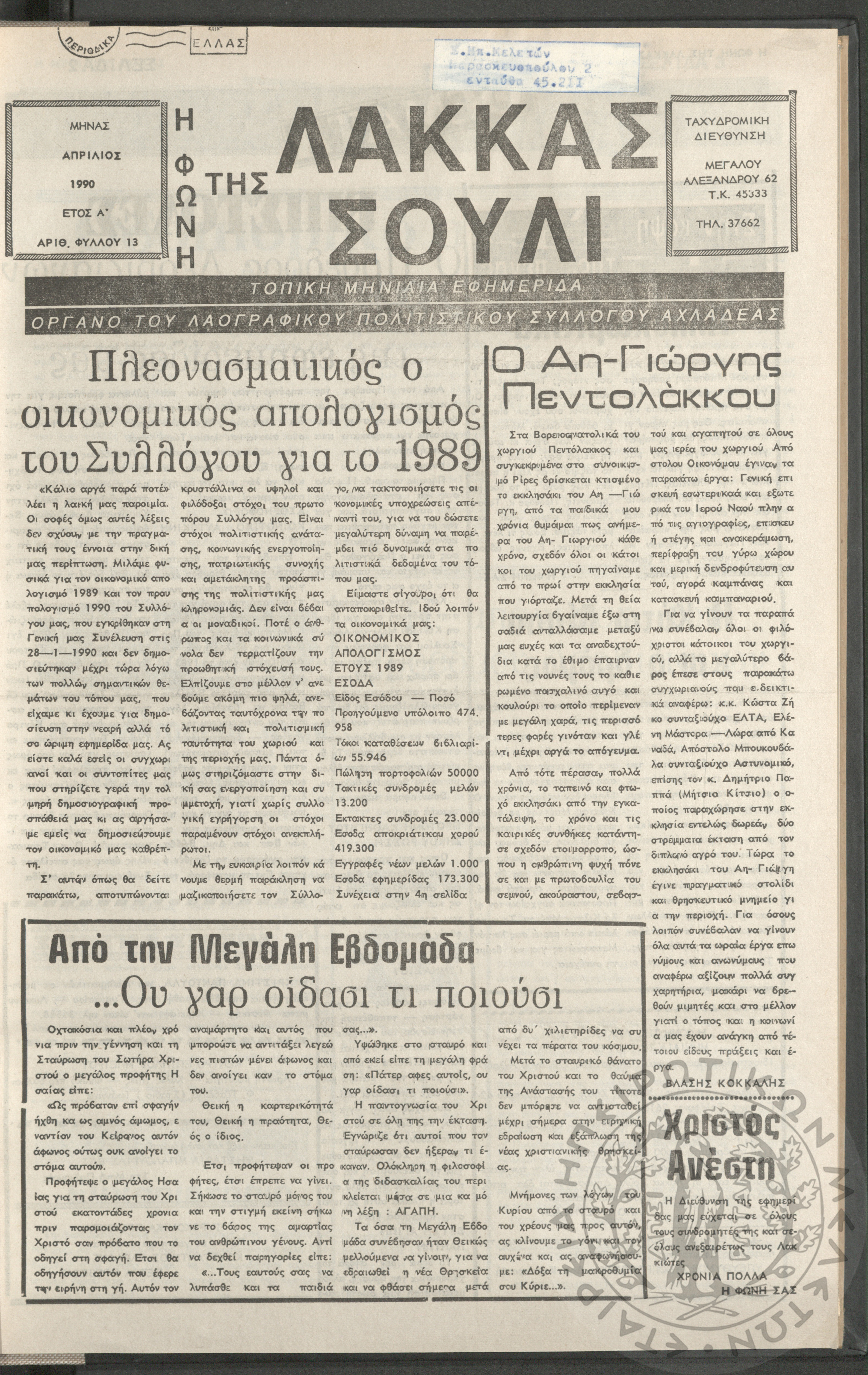 Η φωνή της Λάκκας Σούλι: τοπική μηνιαία εφημερίδα-Όργανο του Λαογραφικού Πολιτιστικού Συλλόγου Αχλαδέας, 1990, φ. 13Έτος Α΄, αρ. φ. 13...